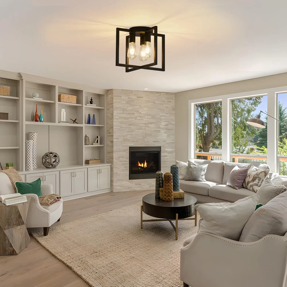 Modern and Farmhouse Design: The semi-flush mount ceiling light adopts a black painted metal cage shaped lampshade, and the geometric frame staggered design provides a modern industrial appearance. Widely Used: Our farmhouse 3 lights ceiling light fixtures are ideal for bedrooms, living rooms, kitchens, restaurants, foyers, closets, corridors, stairs, entrances, laundry rooms, attics, or kitchen islands. The artistic and charming appearance brings a comfortable rural atmosphere to your house. The Feature of Light: 10.62 inches in height, 14.56 inches in width, and 6.29 inches in bottom width, easy to install, the UL certified ensuring the high-quality and safe operation of this ceiling lamp. Bulb recommendation: 3-light industrial ceiling light supports Edison, incandescent, halogen, LED or CFL bulbs, with E26 base. (excluding bulbs, maximum 60W per socket) Dimmable bulbs and compatible dimming switches are ideal choices for creating various dimming atmospheres. After-sales Service: Bosomfr modern pendant light fixture are shipped after many inspections, and we offer a one-year warranty. If you have any questions or problems before purchasing or after receiving the package, please feel free to contact us. Our professional and reliable service team is always at your service. Product Description E26 Base 3-light industrial ceiling light supports Edison, incandescent, halogen, LED or CFL bulbs(bulbs not include). Bosomfr 3-Light Ceiling Light Fixture Black Chandelier with Geometric Metal Shade Ideal for bedrooms, living rooms, kitchens, restaurants, foyers, closets, corridors, stairs, entrances, laundry rooms, attics, or kitchen islands.