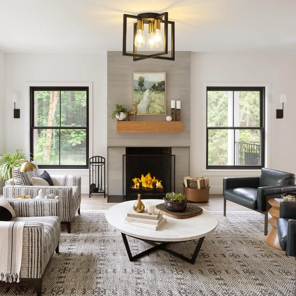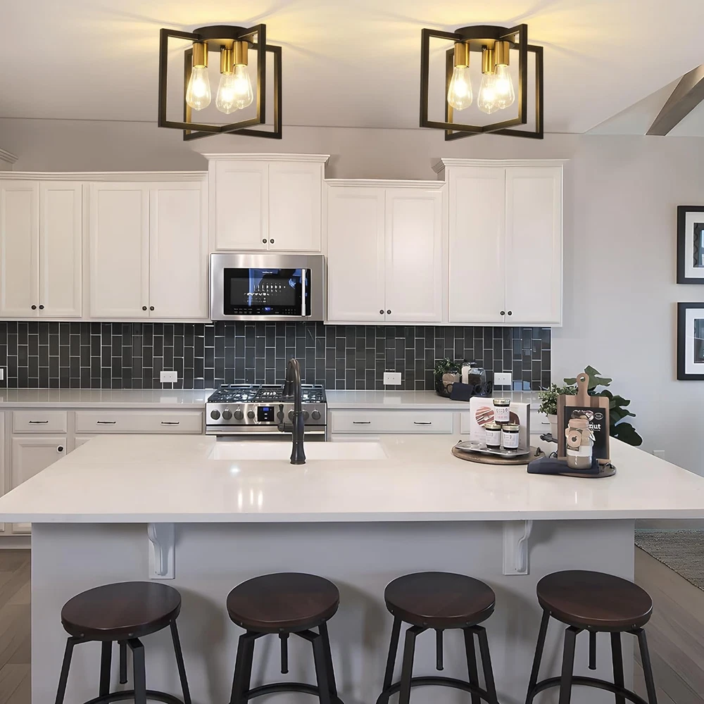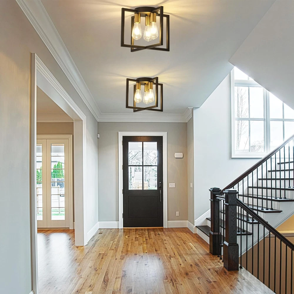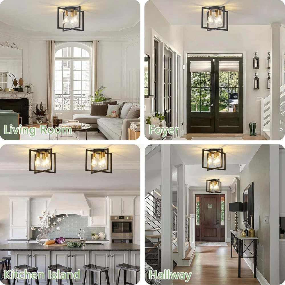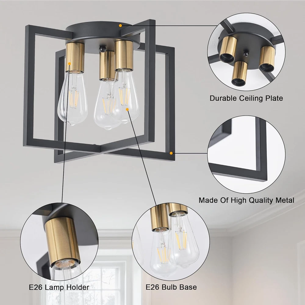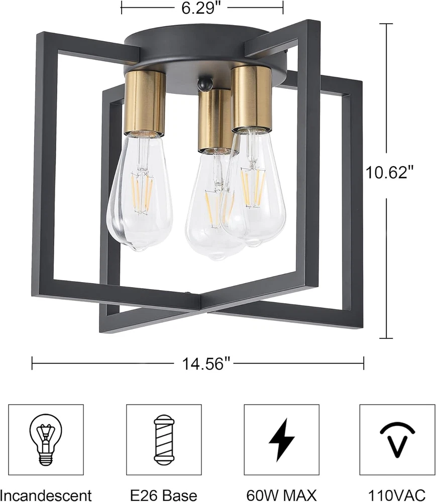 Modern and Farmhouse Design: The semi-flush mount ceiling light adopts a black painted metal cage shaped lampshade, and the geometric frame staggered design provides a modern industrial appearance. Widely Used: Our farmhouse 3 lights ceiling light fixtures are ideal for bedrooms, living rooms, kitchens, restaurants, foyers, closets, corridors, stairs, entrances, laundry rooms, attics, or kitchen islands. The artistic and charming appearance brings a comfortable rural atmosphere to your house. The Feature of Light: 10.62 inches in height, 14.56 inches in width, and 6.29 inches in bottom width, easy to install, the UL certified ensuring the high-quality and safe operation of this ceiling lamp. Bulb recommendation: 3-light industrial ceiling light supports Edison, incandescent, halogen, LED or CFL bulbs, with E26 base. (excluding bulbs, maximum 60W per socket) Dimmable bulbs and compatible dimming switches are ideal choices for creating various dimming atmospheres. After-sales Service: Bosomfr modern pendant light fixture are shipped after many inspections. If you have any questions or problems before purchasing or after receiving the package, please feel free to contact us. Our professional and reliable service team is always at your service. Product Description E26 Base 3-light industrial ceiling light supports Edison, incandescent, halogen, LED or CFL bulbs(bulbs not include). Bosomfr 3-Light Ceiling Light Fixture Black Chandelier with Geometric Metal Shade Ideal for bedrooms, living rooms, kitchens, restaurants, foyers, closets, corridors, stairs, entrances, laundry rooms, attics, or kitchen islands.