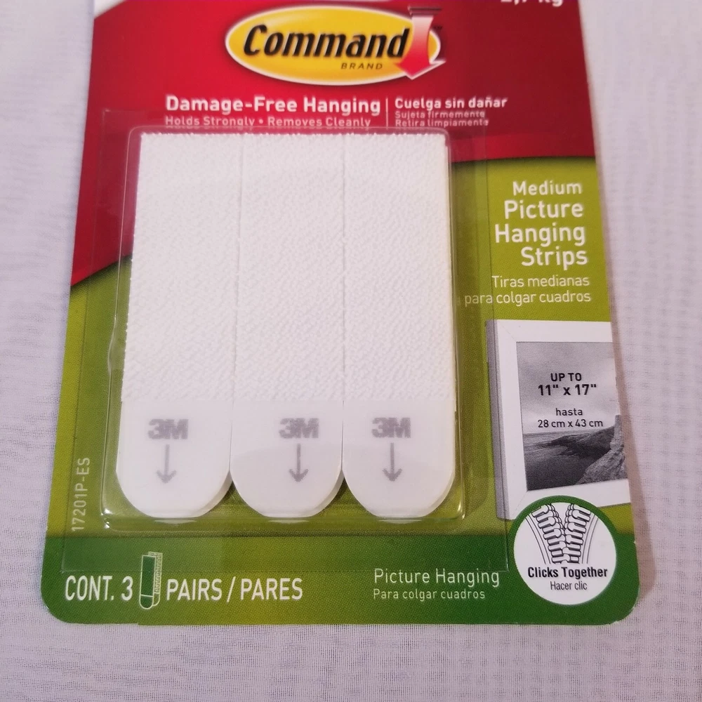 3M Command Medium Picture Hanging Strips 17201P-ES, 3 Pairs, Holds 6 lbs Free Shipping Damage free hanging. Holds strongly, removes quickly. Thank you for stopping by. I try to describe everything as best as possible and take as many pictures to show the true quality of the item. If there any issues please contact me first to get it resolved immediately. 30 day returns in original shipped conditions. If you have any questions or want additional information please feel free to contact me. I would sincerely appreciate your feedback on your shopping experience. It allows me to bring you more quality products at a great price. Thank you very much!