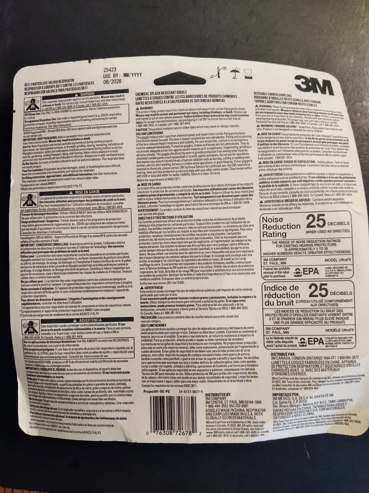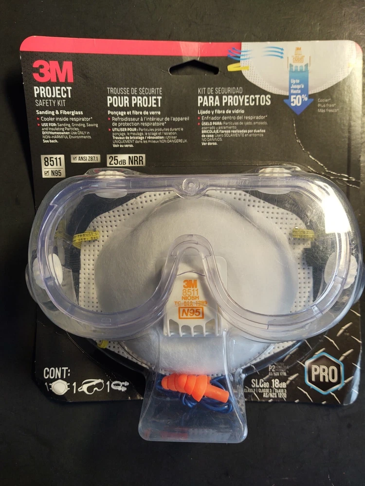 3M Safety Project Kit Earmuff, N95 Mask, Goggles and Earplug 25 dB NRR Home Shop Please see pictures for reference! Feel Free to Communicate, I answer all messages within 24 hours Thank you for shopping my Colorado Small Business! The 3M Project Safety Kit includes safety goggles, respirator and corded reusable earplugs for an all in one safety kit. Safety goggles help protect eyes against certain airborne particulates and chemical splash. Corded reusable earplugs provide a 25 dB NRR protection and the N95 respirator is used for non harmful dusts from sanding, grinding, sawing and insulating particles. The 3M Project Safety Kit includes safety goggles, respirator and corded reusable earplugs for an all-in-one safety kit + 3M Earmuffs for extra hearing safety & protection The N95 respirator is used for non-harmful dusts from sanding, grinding, sawing and insulating particles NIOSH approved particulate respirator Respirator features 3M Cool Flow Valve for heat reduction and easier breathing Corded reusable earplugs provide a 25 dB NRR protection Earplugs feature a cord for convenient storage around neck when not in use Safety goggles help protect eyes against certain airborne particulates and chemical splash Safety goggles meet ANSI Z87.1-2010 requirements