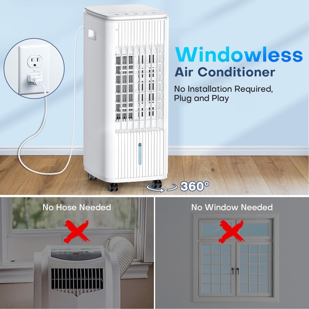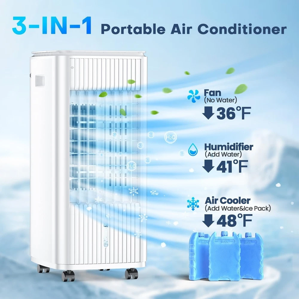[3-in-1 Cooler] BALKO combines a fan, air cooler, and humidifier in one. Just add water and ice packs (3 included) and press the cooling button for instant comfort. Check for ice packs in the top and bottom tanks upon delivery. [Cools Up to 250 Sq.Ft] With a 25" height and 70° oscillation, it delivers powerful airflow (1500 CFM) without needing to bend over. Ideal for seniors and pregnant users. [Dual Water Tanks] Removable water tanks, cooling pad, and wheels make cleaning and moving easy. Built-in safety features include circuit protection and pinch-proof grilles. [No Installation Required] Plug-and-play with no hoses or windows needed. Uses only 60W—cuts energy use and maintenance costs. [Customizable Comfort] Offers 2 modes (Normal/Cooling) and 3 fan speeds (16–25 ft/s), suitable for sleep, workouts, or daily use. [Remote + Top Control] Easy control via remote (up to 16ft) or top panel. Clear icons make it user-friendly for all ages. [Quiet & Timed Operation] Runs quietly at