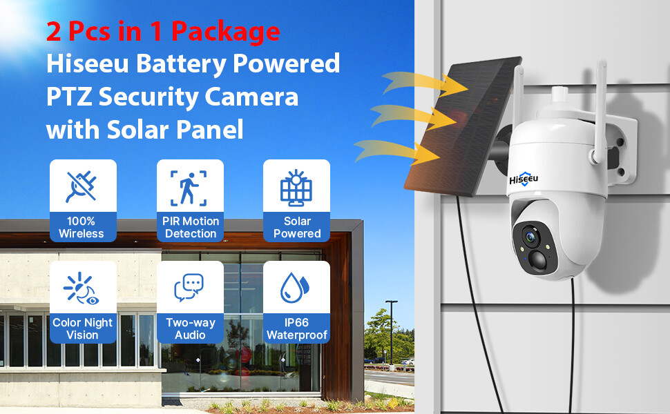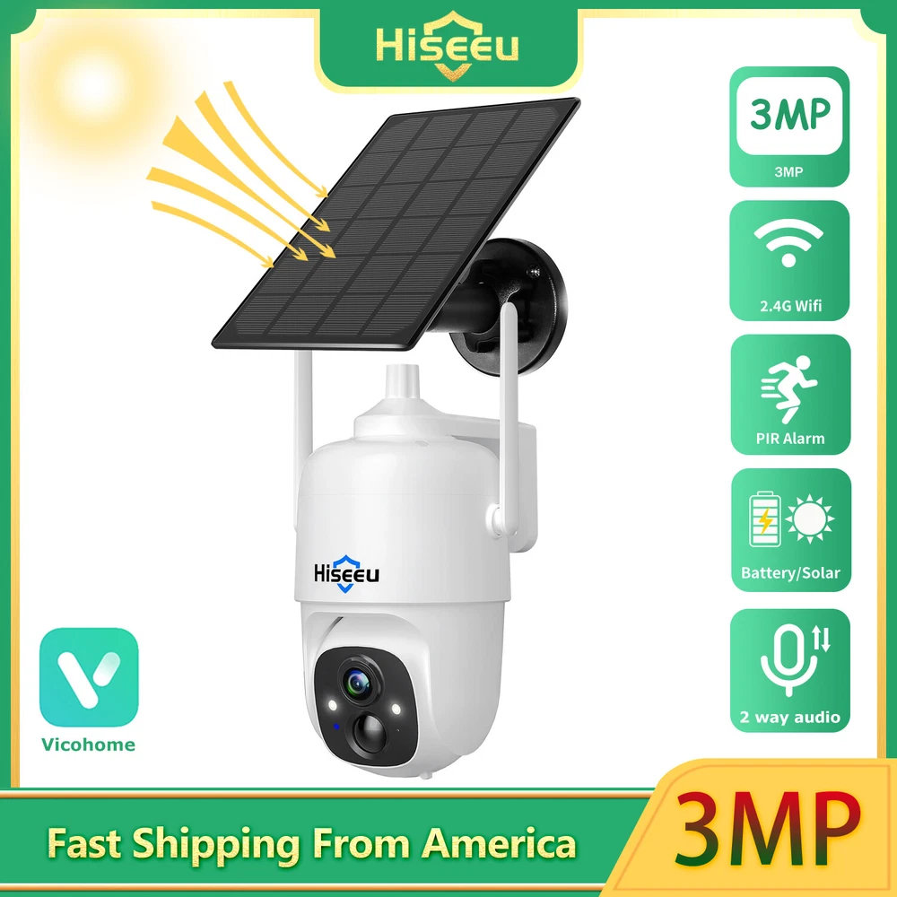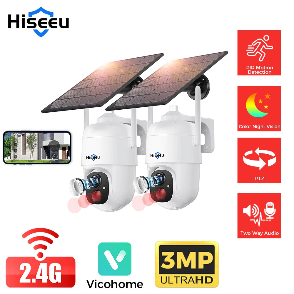 >>>Solar Powerd and Full 355° Coverage >>>2K 3MP and ColorNight Vision >>>IP65 Waterproof and Enhanced WiFi Antenna >>>PIR Sensing and Two-Way Talk >>>Smart Sharing and Privacy Protection Hiseeu Solar Battery Powered Wireless Security Camera System Outdoor Wifi Audio Item Features : >>> Solar Powerd and Full 355° Coverage : The solar security camera has a built-in 9000mah rechargeable battery and is fully charged through the solar panel or USB cable, to achieve a 100% wireless and uninterrupted power supply. Never need to disassemble the camera to charge, At the same time, the APP can control the horizontal 355° and vertical 90° rotation angles, and easily cover the 355° field of view. It can bring you 365 days of uninterrupted protection, and ensure your home's safety. >>> 2K 3MP and ColorNight Vision : The wireless outdoor camera uses the most advanced 1/3CMOS color sensor and advanced 2K 3MP optical lens. Provides detailed and clear graphics and video even in low light conditions, while the upgraded high-power white light and built-in infrared LED array can help you capture colorful pictures and videos at night with a night vision range of 7-10 Meters, and can capture more things in the dark, can see any corner you want to monitor, let you sleep peacefully. >>> IP 65 Waterproof and Enhanced WiFi Antenna : The wireless outdoor security WiFi camera is made of enhanced IP65 material, which can be used safely regardless of rain, sunlight, high temperature, and severe cold. At the same time, it is equipped with a high-gain 4dbi WiFi antenna and 2.4G WiFI transmission, which can receive your data in a wider range. The network signal has good wall penetration, and strong anti-interference ability, and realizes the security protection for the whole year. >>> PIR Sensing and Two-Way Talk : The solar security camera chooses a more complete PIR sensing technology, intelligently distinguishes people, cars, pets, passing, staying, leaving, etc., pushes them to the APP''Vicohome''in real-time, and can draw customized monitoring areas at the same time, through the built-in microphone and speaker, Remote warnings can be used in emergency situations to prevent losses. Also, chat with family and friends in real time. Let you know the dynamic anytime, anywhere. >>> Smart Sharing and Privacy Protection :Solar Outdoor Security Camera supports multi-user connectivity and device sharing with 8-128GB micro SD card (not included) and free 3-day trial cloud storage, Out and about or busy at work, you may ignore the notification, but family members can scan your code to access the camera and protect your home together, while we focus on customer security and privacy protection, all images are encrypted, and no one can access the information without your consent. Applied to Multiple Occasions it can work without any cables thanks to the rechargeable batteries and WiFi connection. Mount it anywhere to have an ultra wide viewing angle with its 355° pan and 90° tilt. Set it up in seconds and enjoys peace of mind. Advanced Cloud AI technology Analysis AI recognition and analysis algorithms intelligently distinguish humans, vehicles, pets with detailed analysis results of passing, staying or leaving, etc.Notifications are pushed to the app instantly, keeping you informed of what's happening wherever you are. PIR Human Detection Camera will send alarm information to user's phone via APP when someone invades the warning area. Vehicle Identification Through Cloud AI calculation, the camera can identify the vehicle and send an alert through the APP. Package Inspection Through Cloud AI calculation,when the camera detects the behavior of picking up and placing packages in the warning area, it will automatically send an alarm. Pet Identification Through the AI algorithm, the camera will recognize the pet and capture it, leaving the cute moment of the pet. Activity Zone Accurately draw customized activity zones in the mobile app.Irrelevant information outside the area would be filtered. The key area, the key focus. 2 months long standby time Record 20 10-second videos every day and the gimbal does not rotate. Solar Panel Charging Use with a dedicated solar panel to ensure that the camera is online for a long time. Dual Light Source with Color Night Vision Full Color Mode : Upgraded high power white-light source. It's able to take color pictures at night. Normal Mode: Built in with IR LED array. Night vision range is up to 20 m. Pan/Tilt 360° All-Round Protection It allows you to remotely control the left right up down rotation via the app.Offers a 90° vertical and 355° horizontal rotation range.Protect your home from 360°. Alternative Methods of Storage Cloud Storage Cloud Storage: Up to 60 days of cloud storage intelligent backup to prevent lost. 7-days free cloud recording recycling. (After the free trial period ends, the feature requires a paid trial.) Local Storage: Micro-SD card storage up to 128GB.(not include the sd card) Intelligent and flexible Notification push Set targeted category in the app, and the cloud Al system will only push notifications when the targets are detected. No more redundant pushes. Two-way audio for live communication With the built-in waterproof and dust-proof microphone and Hi-Fi speaker, you can warn remotely to stop the loss in case of an emergency. For family and friends, live chat to experience intimate interactions, regardless of time and location. More Stable 4DBi WiFi Connection (2.4GHz Only) High-gain antenna, stable transmission App Control View what's happening around your house through the app. Easy live stream and video playback. No matter where you are, you can remotely access this IP camera to see live streaming and stay connected.Remotely view the outdoor surveillance camera via Vicohome App on your mobile device and Vicohome App is free to download and update. How To Connect Camera Easy to share access with family and friends. Access can be shared through the mobile