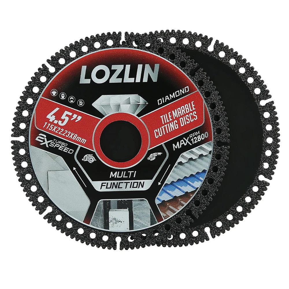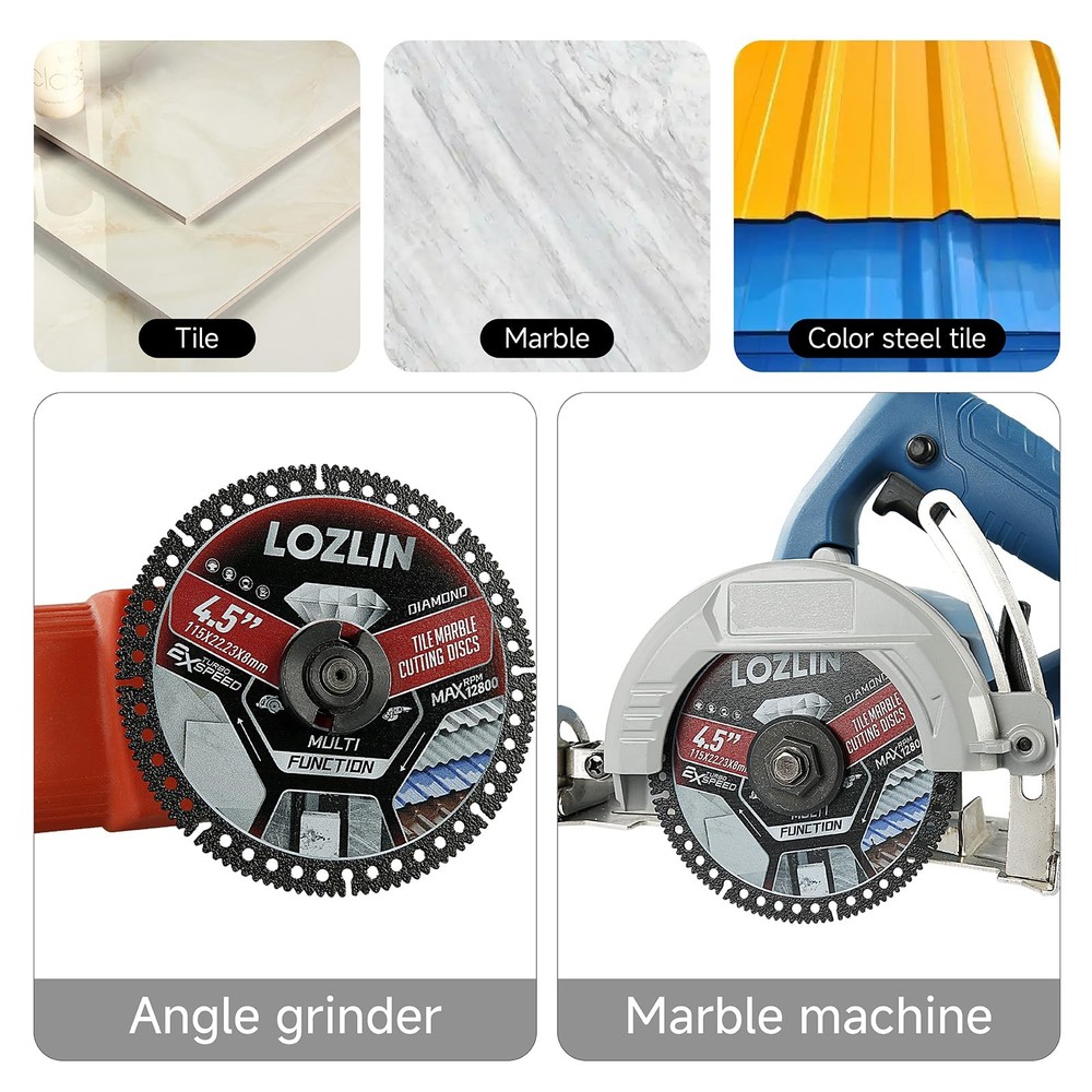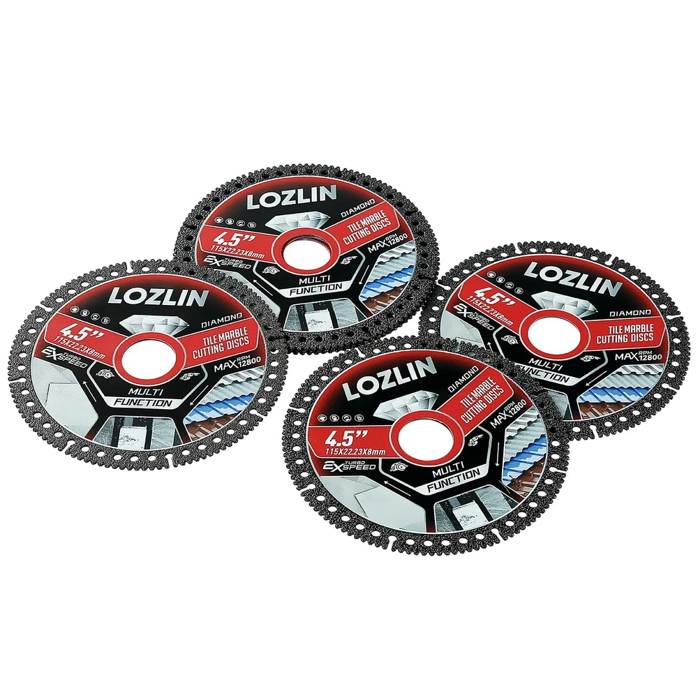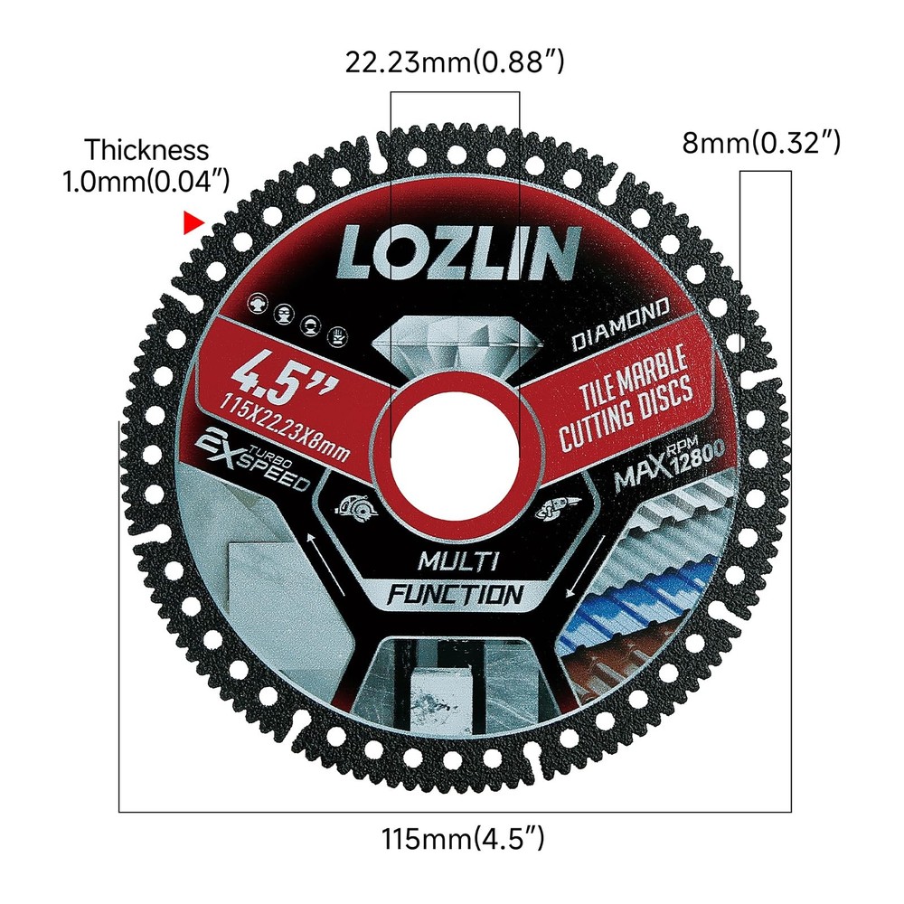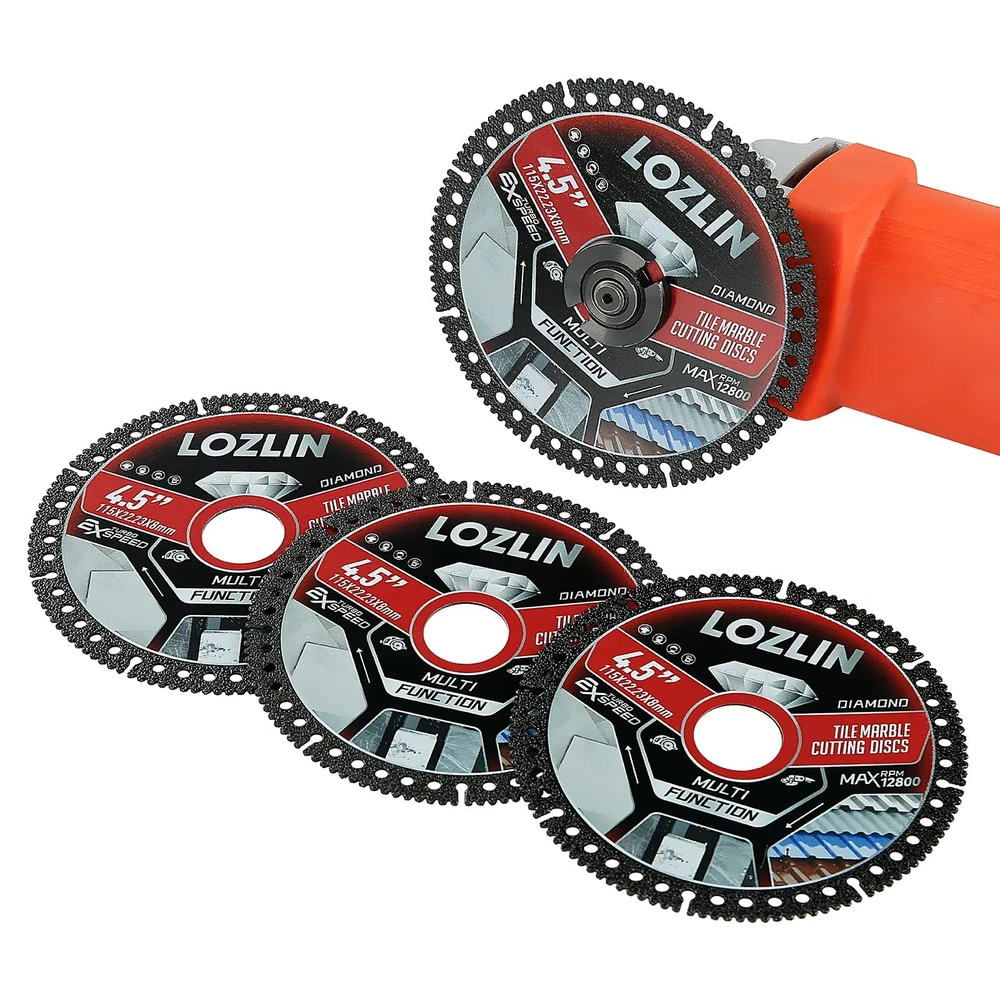 Transform your tile cutting experience with this professional-grade 4.5-inch diamond blade set. Each blade measures 115mm (4.5") in diameter with a thickness of just 1.0mm (0.04") and a center bore of 22.23mm (0.88"), making it perfect for precise cuts on marble, ceramic, and porcelain tiles. The ultra-thin design and diamond-enhanced cutting edge deliver clean, chip-free cuts at speeds up to 12800 RPM. This versatile multi-function blade set fits standard angle grinders and offers superior performance for both wet and dry cutting applications. The specialized tooth design ensures smooth, accurate cuts while minimizing material waste. These blades feature turbo-speed capability and are engineered for durability and consistent cutting performance. Perfect for contractors, DIY enthusiasts, and professional tile installers who demand precision and reliability in their cutting tools. The set includes three identical high-performance blades to keep you working efficiently through extensive tiling projects. DIMENSIONS: 4.5-inch diameter blade with 0.04-inch thickness and 0.88-inch center bore, perfect for precise tile cutting applications VERSATILE USE: Multi-function diamond cutting disc designed for marble, ceramic, and porcelain tile with maximum 12800 RPM speed rating EFFICIENT DESIGN: Ultra-thin blade construction allows for clean, chip-free cuts while maintaining excellent cutting speed PACKAGE CONTENTS: Set includes 3 premium diamond cutting blades compatible with standard angle grinders CUTTING CAPACITY: Professional-grade dry cut blade optimized for straight and curved cuts in hard tile materials