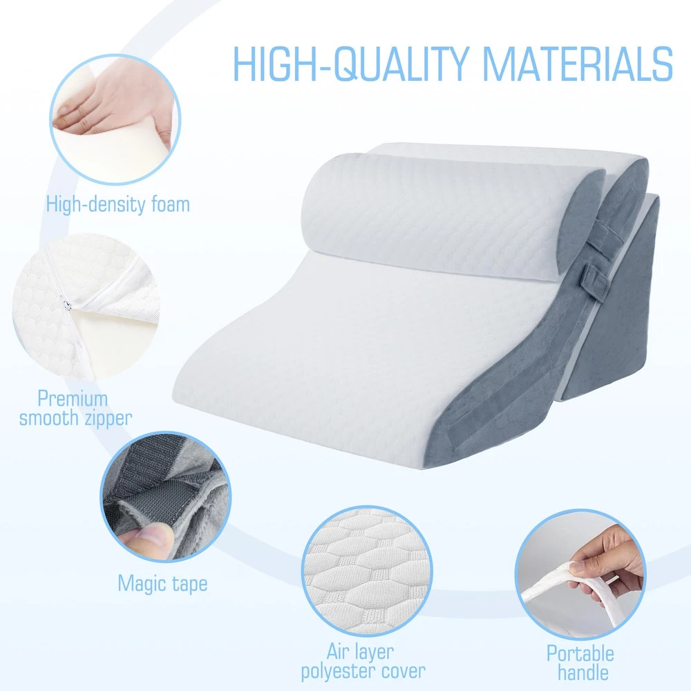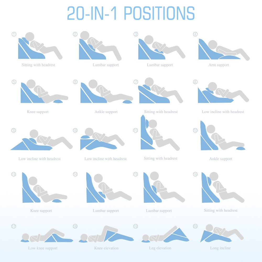 Wedge Pillow COMFORTABLE&SAFE MATERIAL: Our headrest features a soft 45D cooling gel memory foam that provides good support according to the curve of your neck. The back pillow and bottom pillow use 25D high-density high-quality foam material to provide enough support while ensuring comfort, perfectly fit the body curve, disperse body pressure and relieve body fatigue. In addition, our triangle wedge pillow is CertiPUR-US and Oeko-Tex Standard 100 certified, ensuring product safety and health. ADJUSTABLE HEIGHT DESIGN: The sides of our wedge pillow for sleeping is sewn with lengthened and widened magic tape, so you can adjust the pillow to a variety of heights (9'', 12'', or 26'') and angles (30°, 45°, or 60°) for the most comfortable sleep experience. Our pillow has been upgraded in width, and the 23.6 inch width makes sleeping on your side more comfortable and easier to roll over. 20-IN-1 VERSATILE DESIGN: The bed wedge is available in 20 combinations and adjustable height options to meet individual requirements for different sleeping positions and needs, and can be used as a headboard, head support, back support or leg pillow. Bed pillow wedge promote spine health, relieve muscle tension, and ensure comfortable relaxation, and can be used not only for sleeping, but also for leisure activities such as watching TV or reading. IMPROVE HEALTH: In addition to providing comfortable support during sleep, acid reflux pillow can be effective in relieving shoulder and neck pain, relieving acid reflux, resolving snoring and aiding recovery after surgery. The wedge pillow for back pain relief effectively supports and relieves pressure on the neck, spine, knees and legs, while promoting blood circulation and pampering all parts of the body. WASHABLE COVER: Our wedge-shaped pillowcases are made of breathable and skin-friendly knitted air layer fabric with good air permeability and stay comfortable even after prolonged use. The pillowcase has a hidden zipper design for easy cleaning and can be washed by hand or machine and reused.