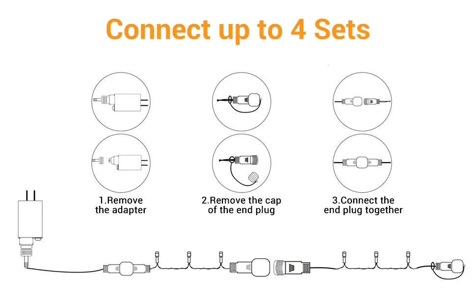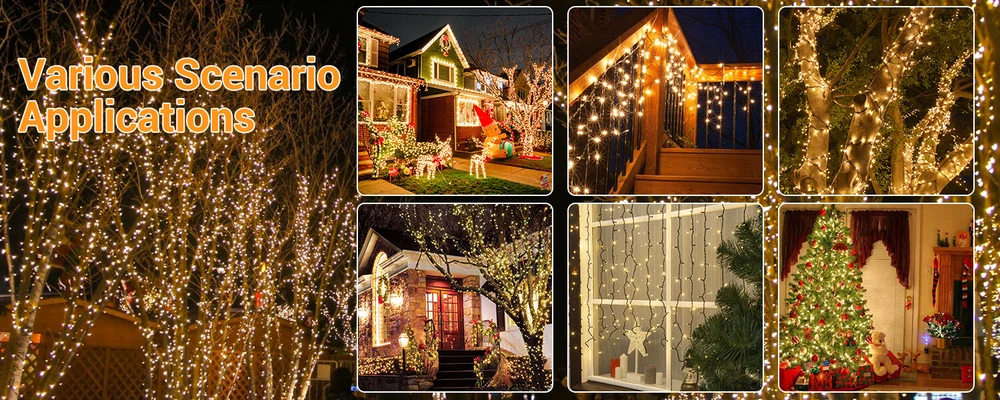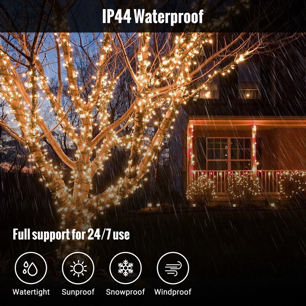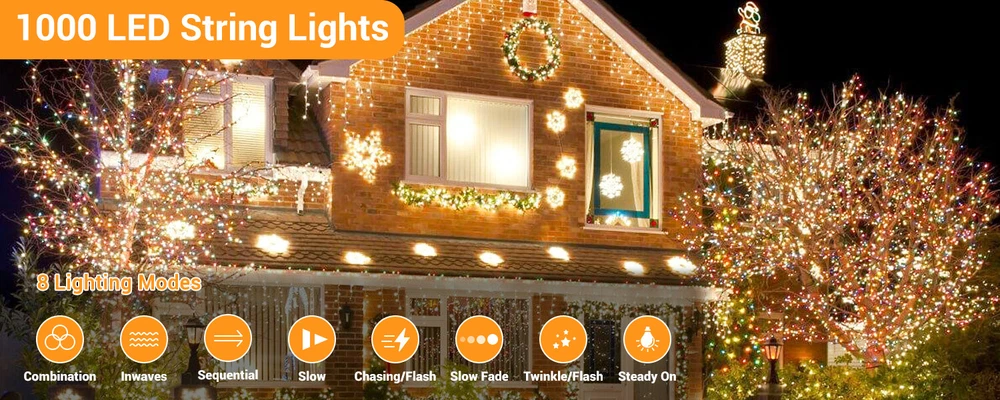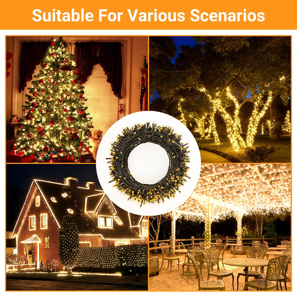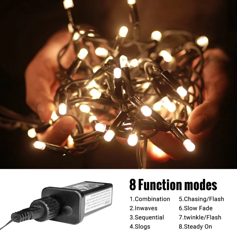 3PCS LED Fairy Christmas String Lights 1000 LED 82FT Decor Party Waterproof US Description 【 Light Specifications】 With 1000 LED lights, each Christmas string lights is 93.5 ft long in total, wire with LED bulbs is 82 ft, lead cord without lights is 11.5 ft, spacing between per LED bulb is 1 inch. Waterproof design allows it to be used indoors and outdoors. NOTE: this LED string lights could not be extended or connected together. 【 8 Lighting Modes】 There are 8 lighting modes can be chosen: combination, in waves, sequential, slo-glo, chasing/flash, slow fade, twinkle/flash, steady on. You can choose different modes according to your mood and the atmosphere you want to create. 【 Waterproof Fairy Lights】 The string lights can withstand all kinds of weather! Suitable for both outdoor & indoor decorations. Please note that the adapter is not waterproof, please kindly protect the power adapter from the water. 【 Safe to Use】 These outdoor Christmas string lights decorations have a safe 29V low voltage UL certificated plug, and remain cool to touch even after a long time of use, safe for a family with kids or pets! 【 Widely Use】 The Christmas string light is perfect for indoor & outdoor of anywhere you want to decorate. Such as bedroom, walkways, patios, gardens, fences, porches, clubs, ceilings, driveways, railings, etc. This decorative lighting is especially suitable for Christmas, Halloween, party, wedding, Thanksgiving day, holiday or any festival and ceremony. Package Include 3 x LED String Lights