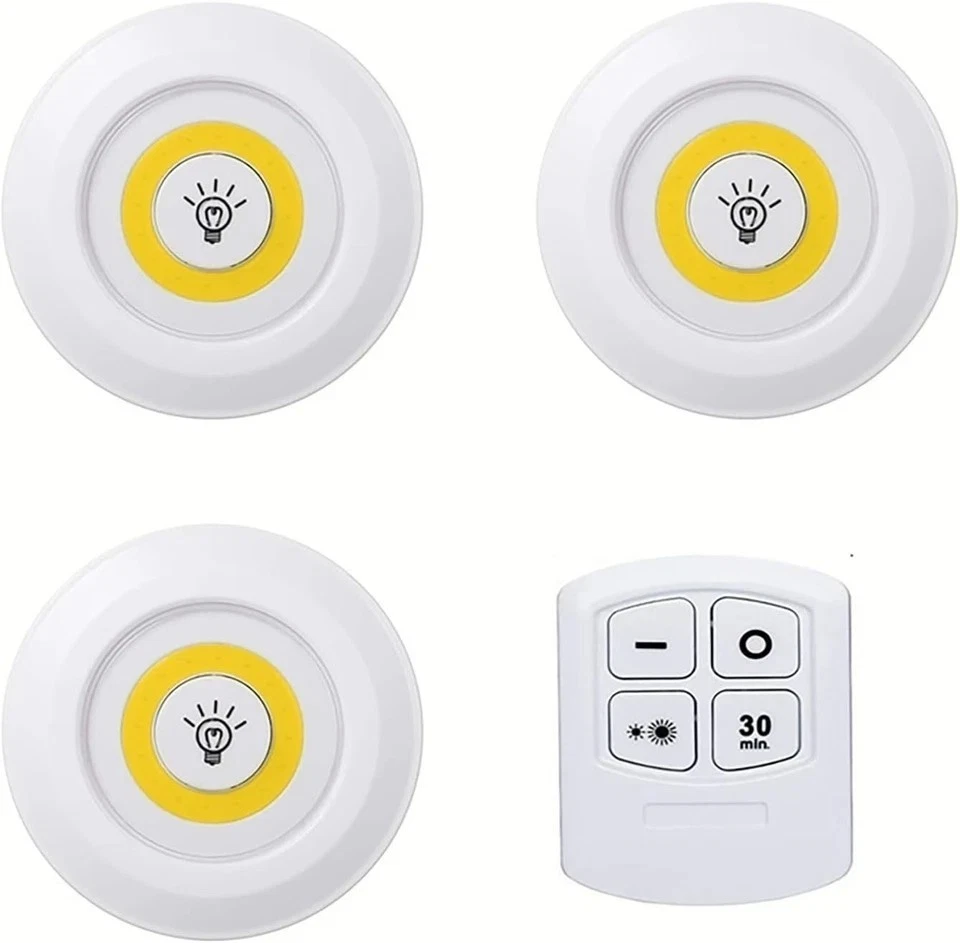 3PCS LED Puck Light Wireless Under Cabinet Lighting Kit Kitchen Counter Light US Package Included: 3 * Lights + 1 Pcs Control Descriptions: - Easy to install, can be installed anywhere you want to light; - The remote control allows the lamp to adjust level 2 brightness and time control, turning off the light in 30 minutes wirelessly, up to 15 feet away; - If you install the lamp close,you can control the lamp together. If you install the lamp has one distance,You can control a light independently - You can also turn the disk light on/off by clicking the switch on the lens on the light. - Suitable for kitchens, cabinets, wardrobes, counters, bookshelves, garages, basements or similar dark places where you may need to constantly have strong lighting in minutes. Specifications: Material: ABS Voltage: 4.5V LED: 3W COB LED Brightness: 150 Lumens Switch Type: Tap or remote control One remote control can control many lights together Control Distance: Up to 15 feet 2 easy ways to install: easy-pasting stickers and expansion screws. Battery: Light: 3*AAA (battery not included in the product), remote control: 2*AAA (battery not included in the product) Note: - PLEASE DISTINGUISH FRONT AND BACK,BACK SIDE IS WIDER THAN FRONT SIDE. -Due to manual measurement, there will be an error of +/- 2 mm. -Due to the shooting angle and the display, the goods may have a color difference from the picture. Thank you for your understanding! Guarantee • Fast & Free Shipping on ALL Orders We believe that you should enjoy the benefit of FREE Shipping on all of your orders within the all Continental States. That's why no matter what you buy, we will ship it for FREE, so the price you see is exactly what you pay. No hidden fees or shipping charges. • Most Items Delivered in 2-6 Business Days When you're buying from us, you deserve fast and reliable service. That's why we have a "Same Business Day" processing in place and wide range of shipping options to choose from in order to deliver your package as soon as possible. *2-6 business days time-frame is NOT GUARANTEED and was statistically calculated based on all previous orders. • ALL Orders Placed On Business Days Before 4 PM EST Will Be Shipped Same Day Why wait a day or more for your order to ship? All orders placed before 4 pm EST, Monday-Friday, ship the SAME day. Orders placed on Friday after 4 pm EST, Saturday and Sunday will be shipped the next Monday (if business day). We are closed on all Federal Holidays. • 30 Days Money Back Guaranteed! We will gladly accept your return within 30 days of the original purchase. Please, see below for our full Returns Policy. Shipping Details • Most orders arrive at your door in 2-6 Business Days FOR FREE! • Place your order before 4 pm EST and it will be shipped the same day, Monday – Friday, excluding major holidays. • We will ship your order to your PayPal Verified address provided. • Please verify your address and make sure that it is your current address before making your payment. Any address change requests after your payment CANNOT be guaranteed. • We do not include invoice with our shipments. Feedback • Positive feedback is automatically done once your order is shipped. • We appreciate all our customers to post a Positive Feedback and "Five-Star" scores. • If for any reason you are not satisfied with your purchase. Please contact us via eBay Message and We will do our best to satisfy you! Payment & Order Cancellation • Instant PayPal payment is required. • We also accepts Visa, MasterCard, Discover, and American Express through PayPal guest checkout. • Sales tax is charged for California State orders. • To uphold a shipping speed, your order will be processed almost immediately. If you change your mind after your payment is confirmed, we will do our best to stop the order, however, we CANNOT guarantee the cancellation. Returns • We will gladly accept your return within 30-Days of the original purchase. • Our return process is simple and fast: 1. We will pay for the return shipping label if you received a broken/defective item(s) or the item(s) doesn't match our description. As soon as we receive the item(s) back we will process a refund for the item(s)which was/were returned. 2. You will be required to pay for the return shipping label if you changed your mind or no longer need the item(s). As soon as we receive the item(s) back we will process a refund for the item(s) which was/were returned. • If we'll receive a package back because of the incorrect address, the refund will be processed excluding our shipping cost. Contact Us • Send us a message on eBay and we will answer within 24h on business days.