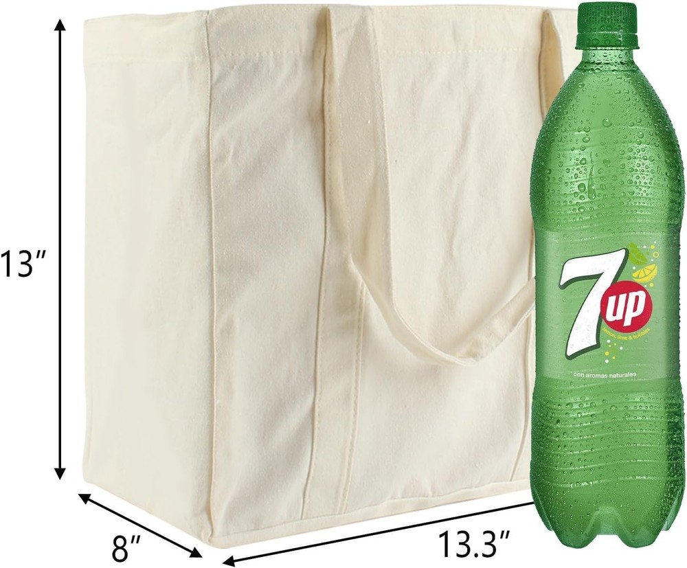 3PCS Reusable Canvas Grocery Bags 13.3x13x8 Inch Heavy Duty Shopping Tote NEW Canvas Imported Package Included: 3Pcs grocery bags canvas for groceries with 2 inner bottle pockets. Size: Canvas grocery bags with right size 13.3”x13”x8” are suitable for daily use. Long and sturdy shoulder strap is sewn from the mouth to the bottom of the bag, which is more load-bearing and convenient for shopping and packing. Easy to carry by the hand or carry over your shoulder. Material: These reusable shopping bags are made of beige canvas, heavy duty, comfortable, practical, foldable, washable. The body of the bag is blank, you can DIY design your own style bag. 2 inner Bottle Pockets Design: Each canvas grocery bag is design with 2 inner Bottle Pockets for place 2L bottles, your grocery list, pen, phone, money or other small things. Meanwhile the space inside the bag for storage other things is not affected. Widely use: These canvas tote bags are perfect for pack anything you can think of, go shopping, go picnics, go out with them. Your good helper for daily life. Our these reusable canvas grocery bags are the better choice for protect our earth.