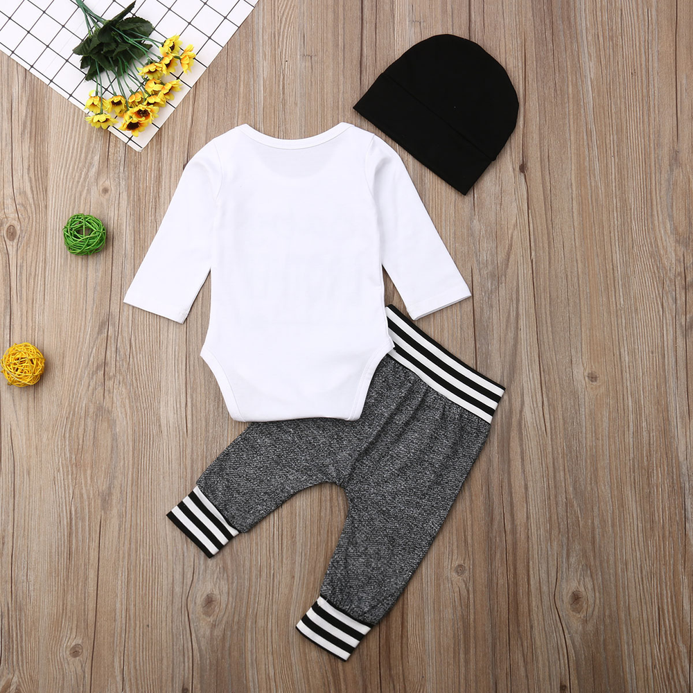 Description Features: Condition: 100% Brand New Material: Cotton Blend Style:Casual Pattern Type:Letter Collar Type:Round Neck Sleeve Length:Long Sleeve Sleeve Type: Regular Occasion: Casual, Everyday, Party Size chart: Recommend Age Top Length CM Top Length Inch Bust CM Bust Inch Pants Length CM Pants Length Inch 0-3 Months 37 14.54 46 18.06 36 14.15 3-6 Months 39 15.33 48 18.86 38 14.93 6-12 Months 41 16.11 50 19.66 40 15.72 12-18 Months 43 16.90 52 20.44 42 16.51 Package Content: 1 x Jumpsuit 1 x Pants 1 x Hat NOTE: 1.Please compare the detail sizes with yours before you buy!!! 2.Colors may be slightly different depending on computer and monitor settings 3.Please allow 1-3cm differs due to manual measurement, thanks (All measurement in cm and please note 1cm=0.39inch) Thanks for your understanding. Detail Image Delivery Time: USA To USA: shipped by USPS, 2-4 working days UK&AU To UK&AU: shipped by Royal Mail , 1-3 working days China To USA: shipped by China Post Epacket, 7-15 working days China To UK&AU: shipped by China Post Epacket, 15-25 working days China To Other Countries: shipped by China Post Epacket, 25-35 working days Shipments & Payment: Your order will be handled within 1-2 business days after receiving your clear payment. Weekend excluded Tracking number will be provided for you ASAP. We accept PayPal. Return Policy: If you are not satisfied with the items, you can return for refund within 30 days after receives it. Buyer pay the shipping cost for return. contact me for the return address, we will refund your money within 2 days after receive the returned items. About Feedback: I appreciate your Positive comment and 5 star DSR(Detailed Seller Ratings) if you are satisfied with the items and my job, I will do better because of your encouragement. Also I will leave Positive feedback to you once I receive yours, thank you very much! Please do Not leave Neutral or Negative feedback and low DSR if you are not happy with the transaction, I think most problems can be resolved through sincere communication. We try our best to reply to your emails ASAP. However, due to high volume of daily incoming emails and time zone difference, we may not be able to reply your emails immediately. Please allow 1-2 business day for us to reponse. Please feel free to contact me if you have any question, I'll try my best to solve it for you.