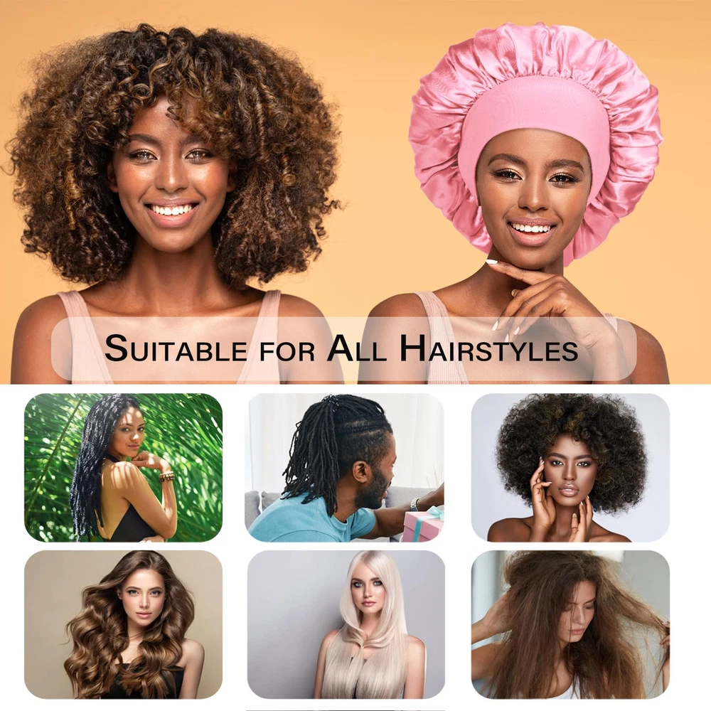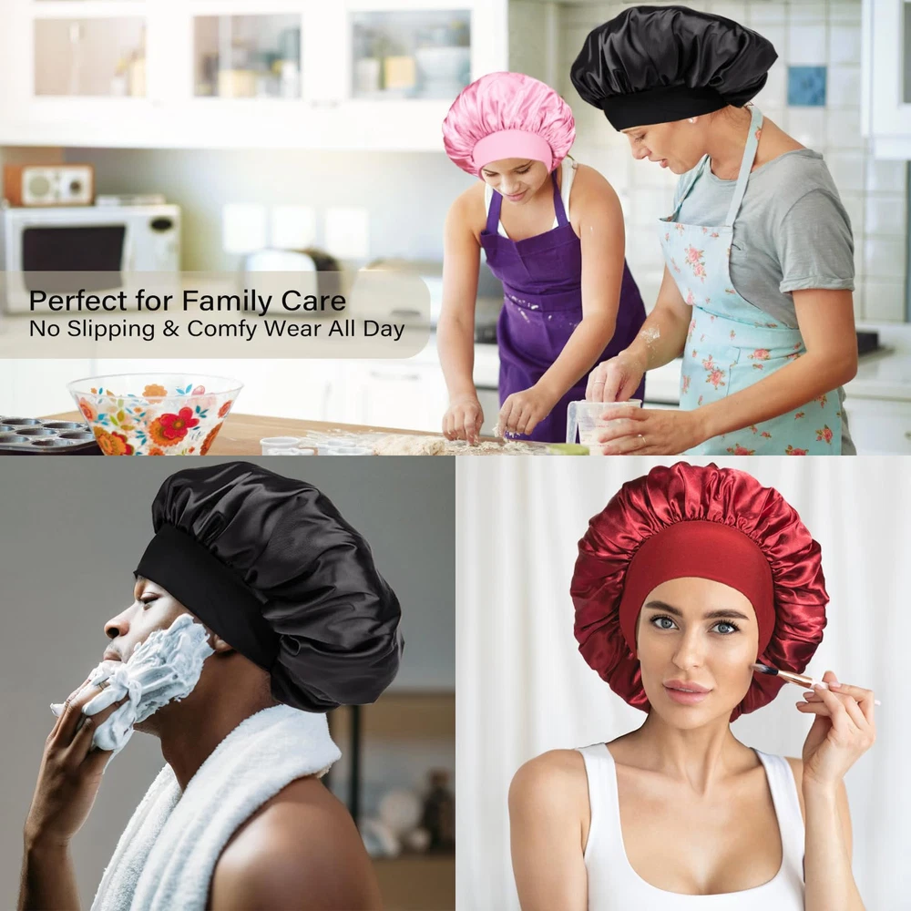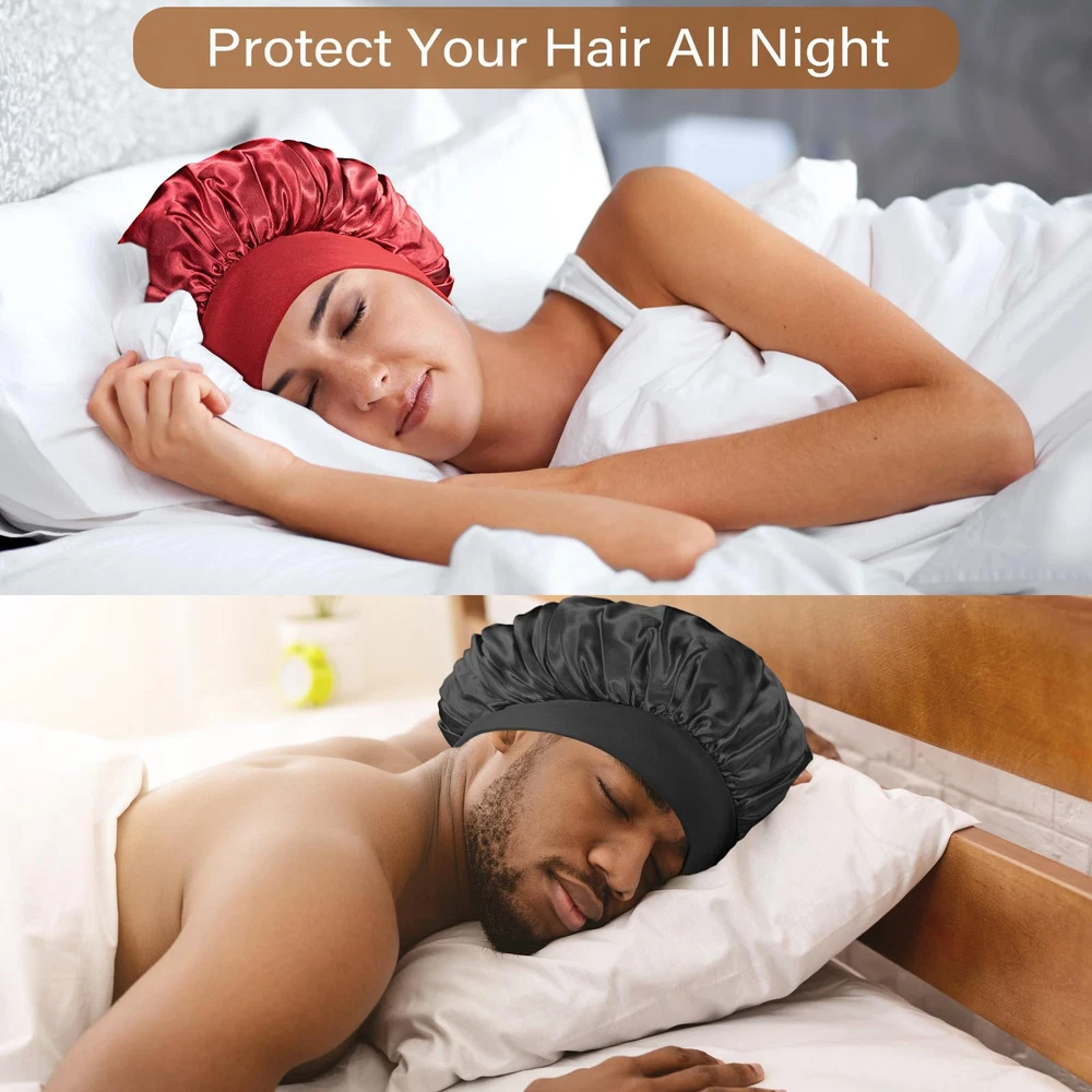【Stretchy Big Wide Band No Tightness No Compression】-Diameter 9~15 inch extra large stretch wide-brimmed sleep cap allows us to say goodbye to head tightness, headaches, indentations and other problems, and sleep will not slip from the head, a whole night to feel super-soft comfortable, breathable, Great for holding dreadlocks, braids, curly hair, natural hair, weaves, waves, long, dry, tangled, perms, rollers, afros, buns, short, shoulder length wavy, and up-dos 【Premium Satin Protection Your Hair】-Silk sleep caps can greatly reduce the friction of the hair, and reduce the dryness, fork, and hair loss of hair. Hair Bonnets for sleeping keep hair from knotting,protecting the luster and flexibility of the hair to the greatest extent,single layer design doesn’t add any extra heat , Our bonnet super Soft, Smooth, Lightweight, and Skin-friendly; 【Lightweight Breathable Hair Cover】-Sleeping with a hair hat may make you feel like a burden, but not this light hair bonnet with only 0.06 pound which barely leaves any weight on your head. Getting hot while sleeping will not be an issue due to the breathable satin we use to make this hair sleep cap 【Ideal Helper for Daily Life】- This silky head cover is really convenient in daily use. Not only it used as sleeping cap at home for preserving certain hairstyles and keep your hair healthy, but also when wash your face, skin care, hair beauty, makeup, do housework, cook, take shower or relax at home. As well as 3 colors are used to match home clothes of various colors to meet daily needs 【Best Gift for Womens and Mens】-Package: 3* Bonnet+1*Hair Band /Set. It's a great present in Thanksgiving, Christmas, New Year, Birthday, Mothers 'Day, Anniversary, Valentines for your wife, husband,mom, girlfriend, daughter who over 12 years old.