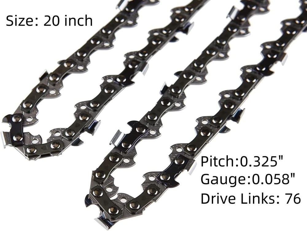 Size: Package: 3 pcs. Length: 20" Chainsaw Chain Pitch: 0.325" Size: 0.58" gauge Number of drive links: 76 Replacement for Blue Max 52209 Replacement for Oregon 21LPX076G. Compatible with Blue Max 53543, 8901, 8902 Modles Chainsaws Replacement: 76 Drive Links Chainsaw Chain Replacement Caton Fits Origen Steele Chainsaw 52/58. Fits: 76 Drive Link Chainsaw Chain Compatible with Blue Max, Husqvarna, Stihl, Homelite, John Deere, Makita, McCulloch, Poulan, Craftsman Chainsaws Size: 3pcs, 20 inch Chainsaw Chain, Pitch: 0.325", Size: 0.058" gauge, Drive Links: 76 Replacement: Chain saw chain replacement for Blue Max 52209 53543, 8901, 8902 Modles Chainsaws, replacement for Oregon 21LPX076G Compatiblity: 20 inch chainsaw chain replacement for Blue Max, for Husqvarna, for Stihl, for Homelite, for John Deere, for Makita, for McCulloch, for Poulan, and for Craftsman Chainsaws Precision Design:Chain saw chain is made of high toughness and high precision material, industrial hard chrome outer layer and hardened rivet design helps to reduce wear and chain adjustment, providing you with stable cutting. Compatiblity: Carbide chainsaw chain compatible with Caton, compatible with Origen Steele Model 52/58 Chainsaw Replacement Chainsaw Chain for 76 Drive Sections.