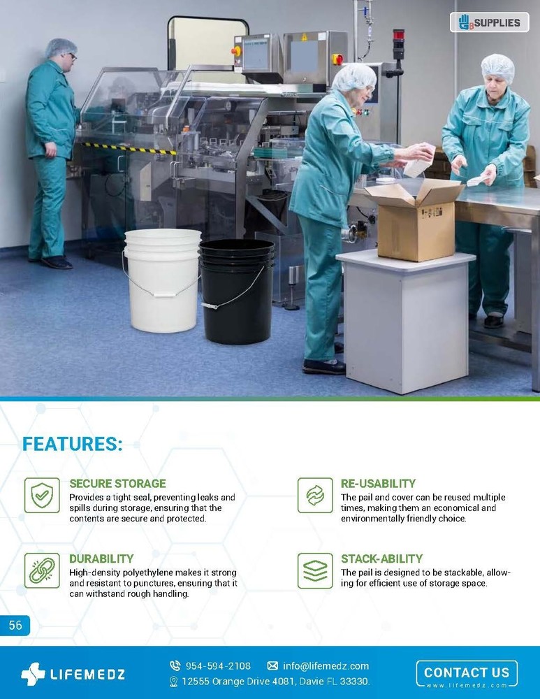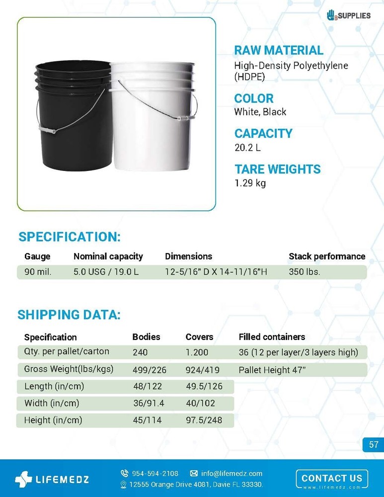 π Description π’οΈ 3-Pack β 5 Gallon UN Rated HDPE Pails with Lids (90mil) Heavy-Duty | Reusable | Stackable | Food-Grade Plastic Bucket | Industrial Strength Upgrade your storage game with this pack of 3 high-performance 5-gallon pails , crafted from 90mil thick High-Density Polyethylene (HDPE) and equipped with UN-certified lids . Whether you're in food processing, agriculture, chemical handling, or general industrial operations, these pails are built to meet your most demanding needs. β Key Benefits: π UN Rated for Safety Certified for the secure storage and transport of hazardous and non-hazardous materials. πͺ 90mil Thick HDPE Construction Provides superior puncture and impact resistance for long-term, heavy-duty use. β»οΈ Reusable & Eco-Friendly Built to withstand repeated use, saving money and reducing waste. π Stackable Design Saves space in warehouses, trucks, or storage areas with interlocking lids and bases. π§ Leak-Resistant Snap Lids Included Ensures tight, secure sealing to prevent spills or contamination. π¦ Sold as a 3-Pack Great value for industrial users, prepper storage, or bulk material handlers. π Ideal For: Food-Grade Storage β Dry goods, grains, sauces, ingredients (FDA food-safe HDPE) Chemical & Lab Applications β Resins, powders, liquids Agriculture & Farming β Animal feed, soil, fertilizers Manufacturing & Logistics β Parts, tools, waste collection Emergency Preparedness β Long-term water or supply storage π Specifications (Per Pail): Capacity : 5 US Gallons / 19.0 Liters Material : High-Density Polyethylene (HDPE) Gauge : 90mil Color : White or Black Tare Weight : ~2.84 lbs per pail Total Shipped Weight : ~9 lbs (3-pack) Dimensions (Nested) : 13" x 13" x 17" π·οΈ Certifications & Compliance: β UN/DOT Rated for shipping regulated materials β BPA-Free HDPE β Compliant with FDA food-safe material guidelines β Made in USA β Domestic quality you can trust β Prop 65 Safe β No known hazardous materials π Trusted By: Electronics β’ Agriculture β’ Automotive Construction β’ Warehousing β’ Logistics π¦ Pallet Pricing & Wholesale Available Message us for bulk orders (120+ pails/pallet)! Ships from Florida πΊπΈ | Fast Fulfillment | Satisfaction Guaranteed
