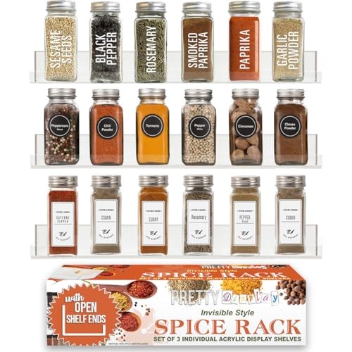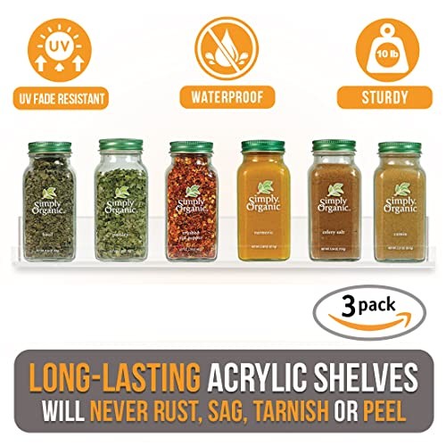 Shelf Type:Floating ShelfMPN:Does Not ApplyItem Length:1Finish Type:Space-savingBatteries Required:NoColor:TransparentEAN:Does Not ApplyCustomer Reviews:4.5 out of 5 starsUPC:784672267700Room Type:Pantry, KitchenDate First Available:August 28, 2015Item Width:1Special Features:2" Shelf Suitable for Standard Store-Bought Spice JarsMounting Type:Wall MountNumber of Shelves:3Item model number:PDspiceRACK-001Assembly Required:YesMaterial:Premium UV Fade-Resistant AcrylicItem Height:1Batteries Included:NoInstallation Method:Screw MountIncluded Components:HardwareBrand:Does Not ApplyItem Weight:4.64 ouncesStyle:Open Shelf EndsType:Does Not ApplySize:3 Packgtin13:Does Not ApplyNumber Of Pieces:3Product Dimensions:2.4"D x 15"W x 1.75"HSpecial Feature:2" Shelf Suitable for Standard Store-Bought Spice JarsItem Package Quantity:1Is Discontinued By Manufacturer:NoManufacturer:Does Not ApplyPart Number:COMINHKPR97850Shelf Weight Capacity:10 PoundsFinish:Space-saving