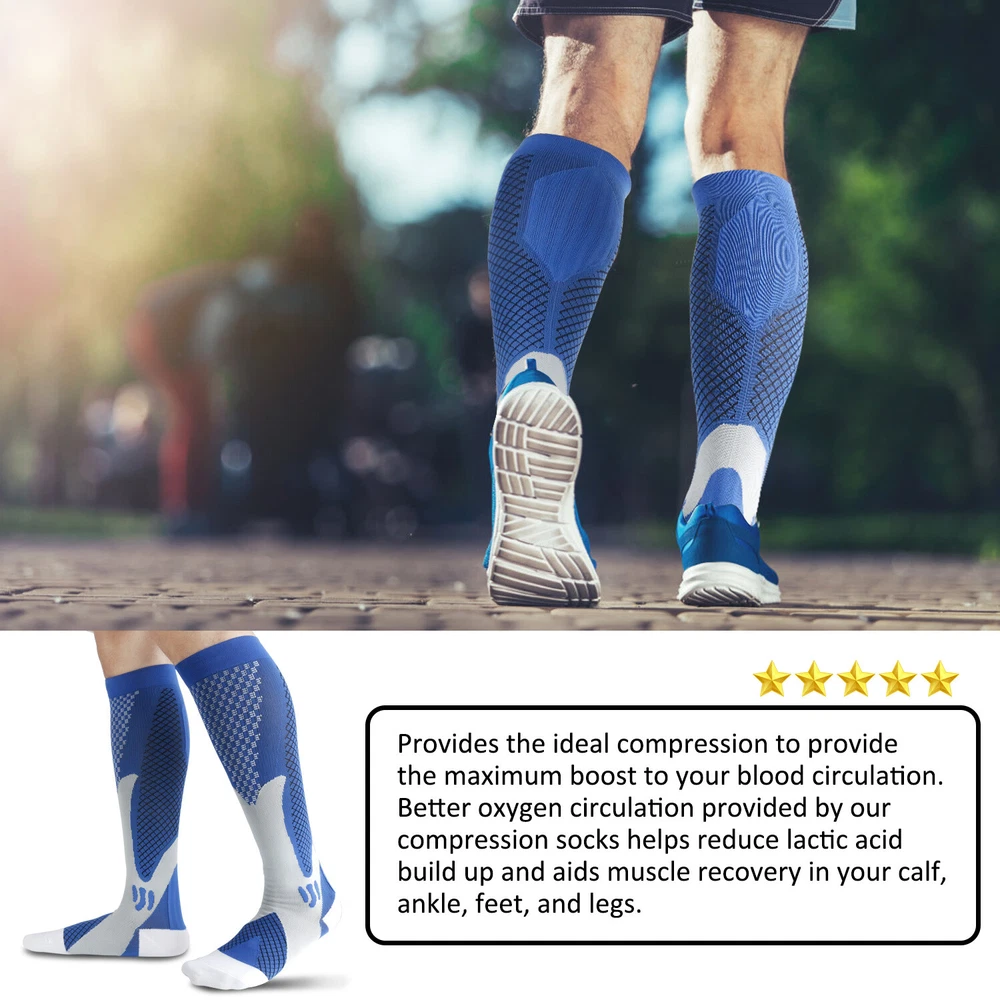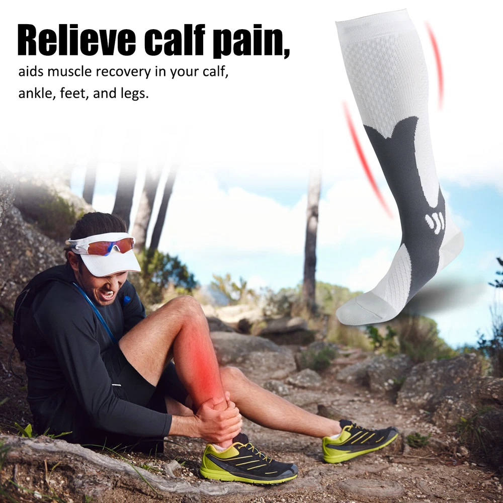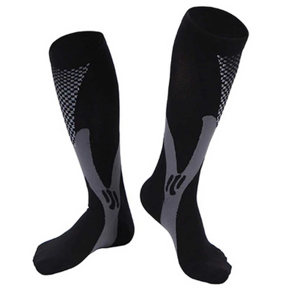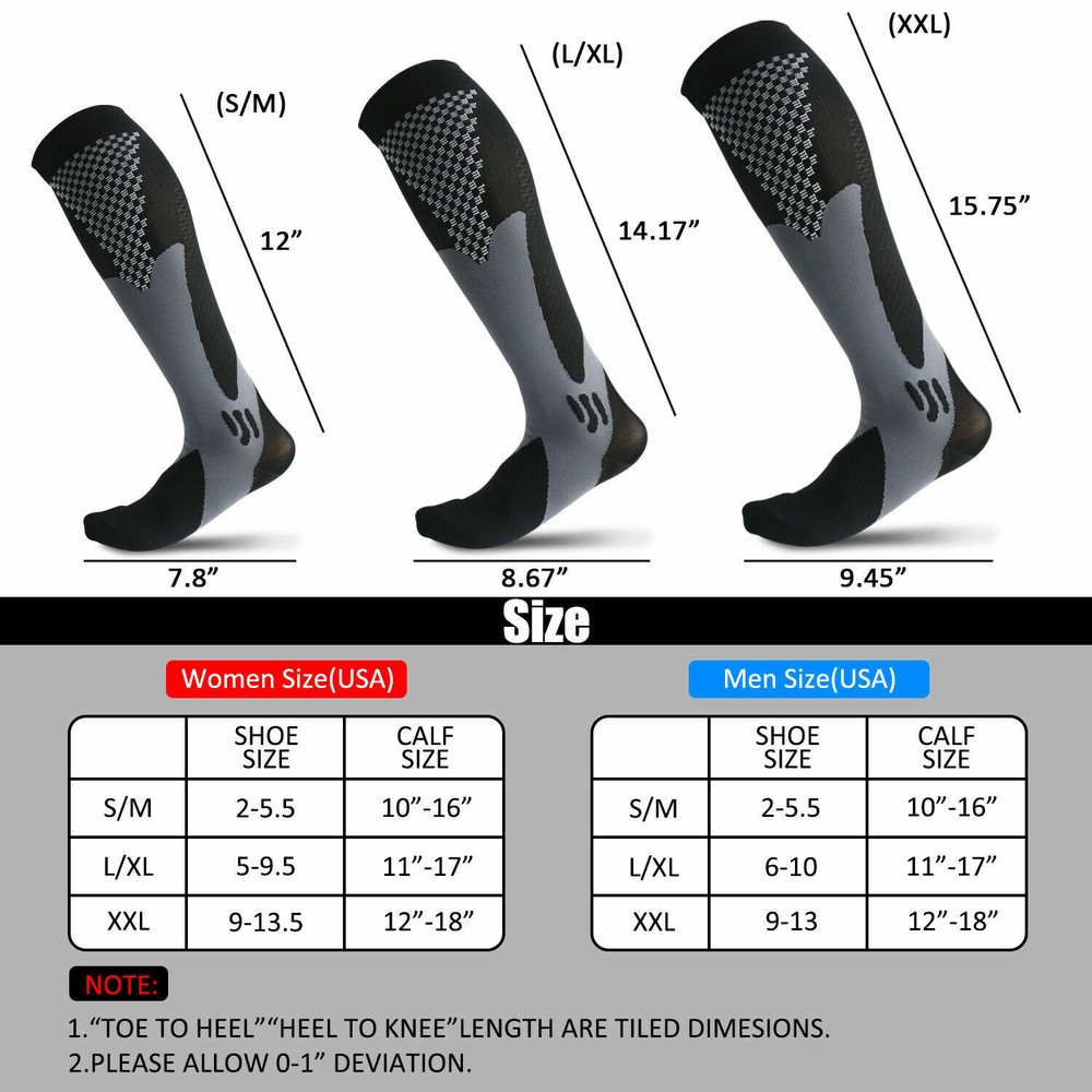 3Pairs Compression Socks 30-40 mmhg Knee High Running Sport Long Stockings Ankle Specification Products Name: Compression Socks Compression Level: first level (30-40mmHg) Size: S / M, L / XL, XXL Gender : Adults Socks Thickness: Medium Fabric: Elastic Nylon Function: Shaping, Anti-Friction,Pain Relief,Plantar Fasciitis,Spurs Arch Pain Suitable Season: Spring, Autumn, Winter, Summer Features 1. They provide pressure , promote blood circulation of legs and feet, and have a good effect of relieving fatigue of legs and feet. It offers the most perfect settlement scheme for those who sit for long period during travel or at work. 2. Can 360-degree stretch ,The compression technique is scientifically known to Relieve fatigue. We intend allay combining fashion, technology and science to bring you the triple comfort. Our compression socks' delivering 360-degree stretch for greater flexibility and durability. 3. Reduce Injiries ,Provide mild squeezing for warmness and protect legs from injury. Remove stress and help relieve discomfort, Provides true graduated compression to support your legs, reduce fatigue,soreness, and prevent injuries at the same time. 4. Increase Leg Comfort ,A veritable necessity for anyone working long-hours standing on their feet, or those heavily invested in athletics and a fitness lifestyle. It is great gift to joggers, athletes, workout fanatics, office workers, runners and climber. Package including(as your choice) 3Pairs of Compression Long Socks Tips : Please compare the detail sizes with you before you buy. FREE Shipping Any question , please contact us , we will try our best to help you solve your confusion.Thank you~