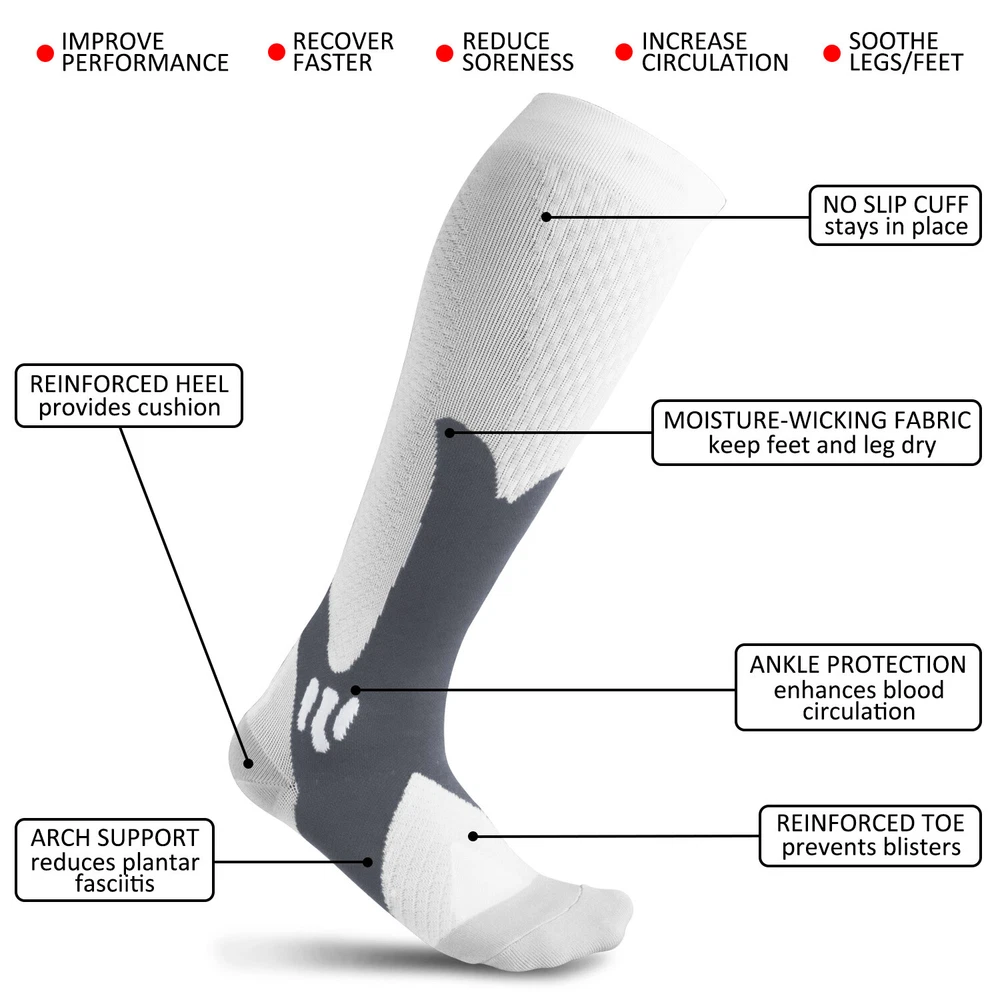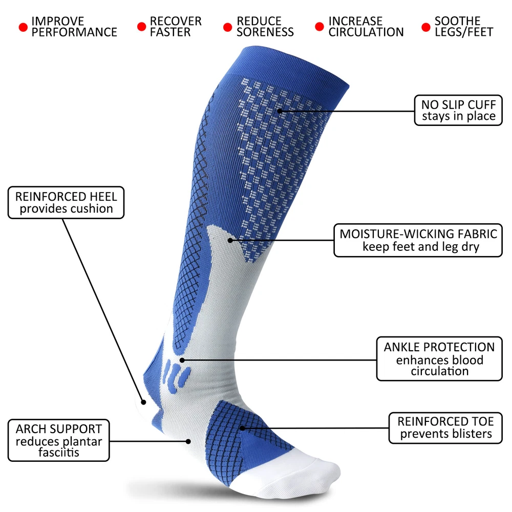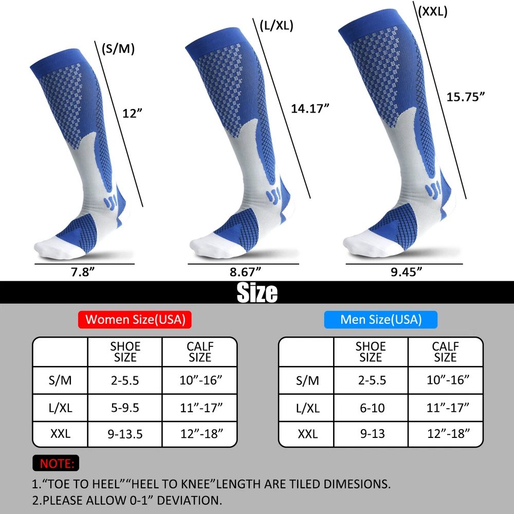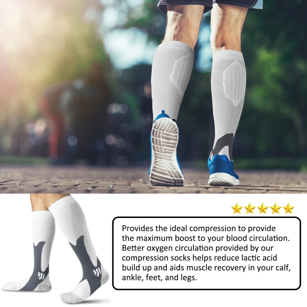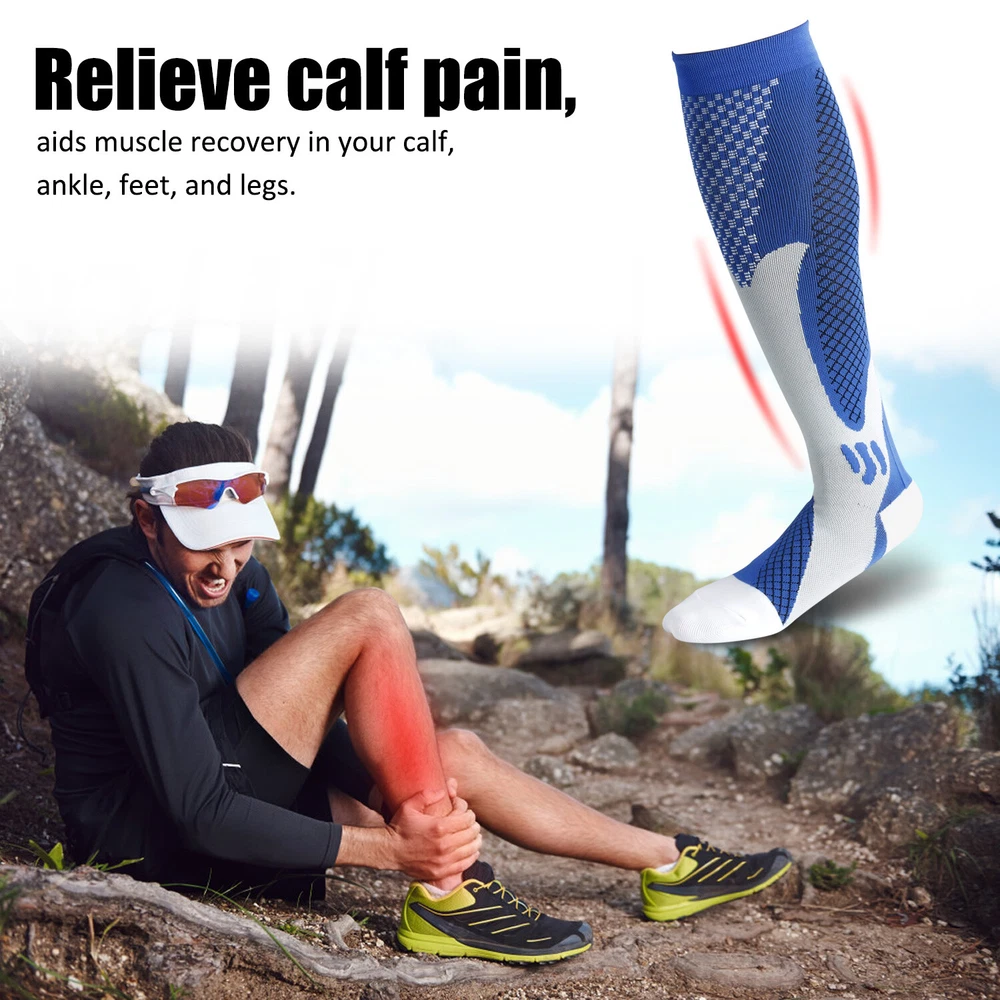 3Pairs Compression Socks 30-40 mmhg Knee High Running Sport Long Stockings Ankle Specification Products Name: Compression Socks Compression Level: first level (30-40mmHg) Size: S / M, L / XL, XXL Gender : Adults Socks Thickness: Medium Fabric: Elastic Nylon Function: Shaping, Anti-Friction,Pain Relief,Plantar Fasciitis,Spurs Arch Pain Suitable Season: Spring, Autumn, Winter, Summer Features 1. They provide pressure , promote blood circulation of legs and feet, and have a good effect of relieving fatigue of legs and feet. It offers the most perfect settlement scheme for those who sit for long period during travel or at work. 2. Can 360-degree stretch ,The compression technique is scientifically known to Relieve fatigue. We intend allay combining fashion, technology and science to bring you the triple comfort. Our compression socks' delivering 360-degree stretch for greater flexibility and durability. 3. Reduce Injiries ,Provide mild squeezing for warmness and protect legs from injury. Remove stress and help relieve discomfort, Provides true graduated compression to support your legs, reduce fatigue,soreness, and prevent injuries at the same time. 4. Increase Leg Comfort ,A veritable necessity for anyone working long-hours standing on their feet, or those heavily invested in athletics and a fitness lifestyle. It is great gift to joggers, athletes, workout fanatics, office workers, runners and climber. Package including(as your choice) 3Pairs of Compression Long Socks Tips : Please compare the detail sizes with you before you buy. FREE Shipping Any question , please contact us , we will try our best to help you solve your confusion.Thank you~