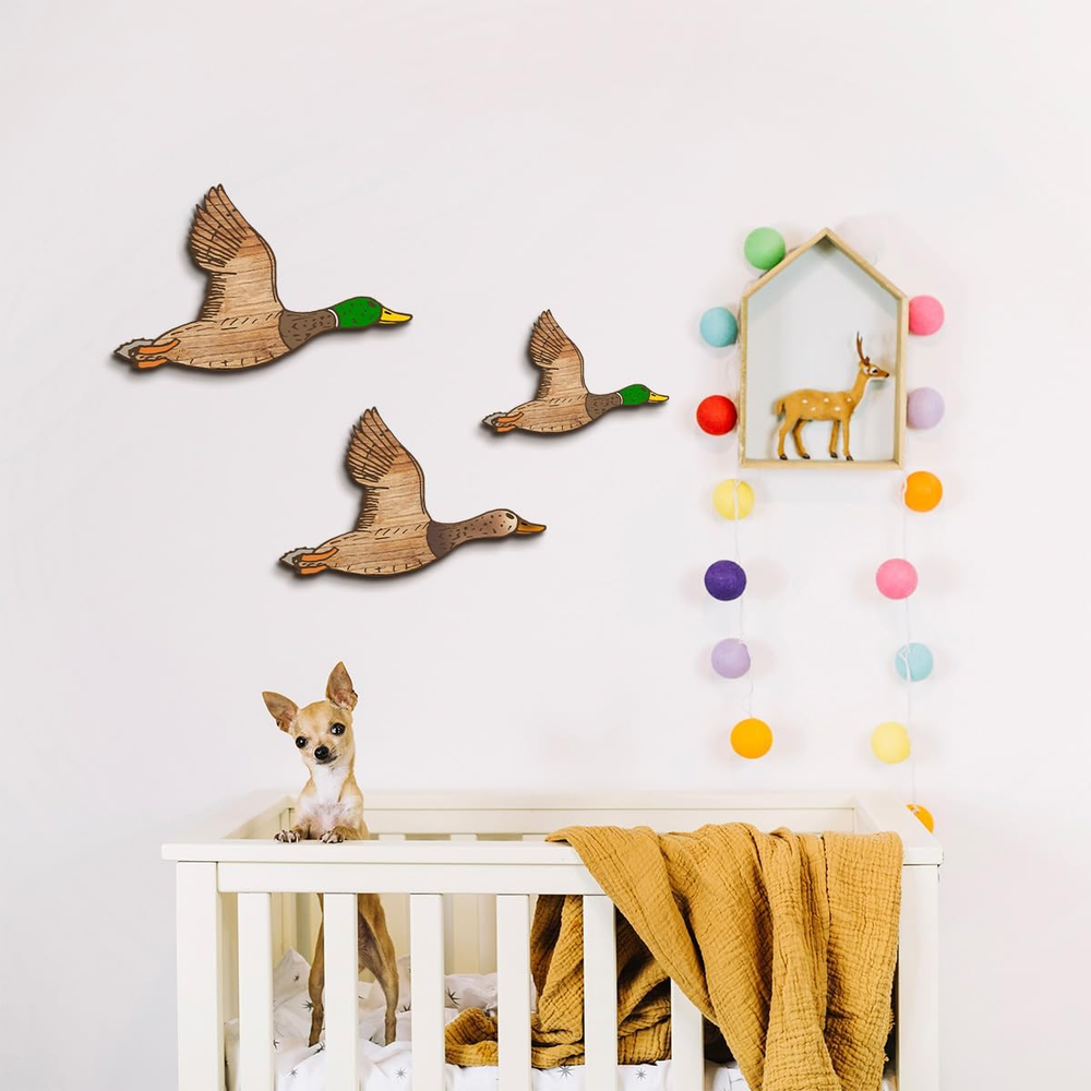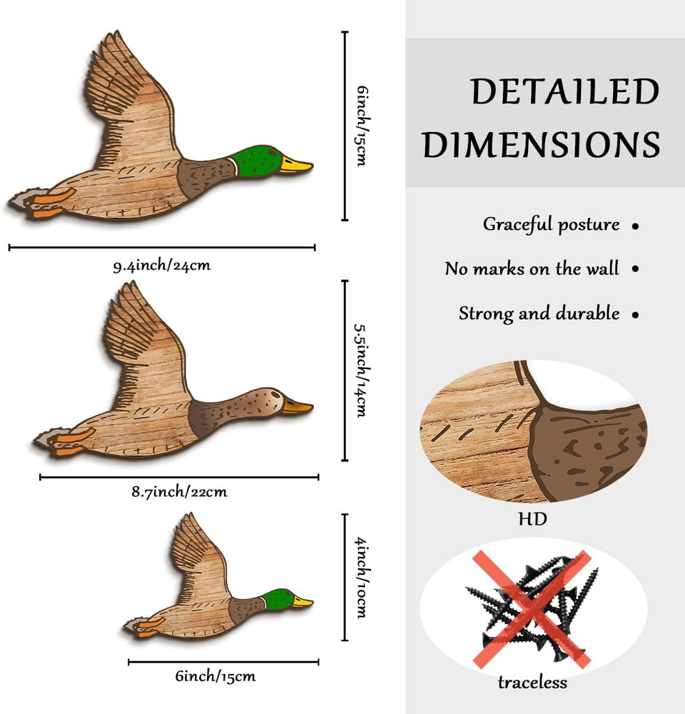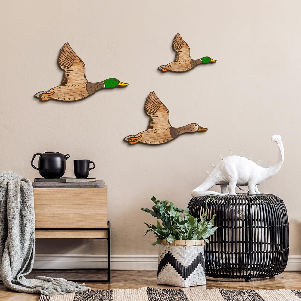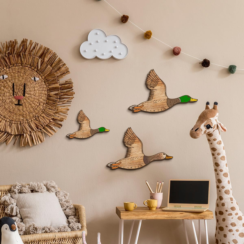 Authentic Retro Design: Our flying ducks wood wall decor capture the essence of the 1950s era. Each piece is meticulously crafted to resemble the graceful flight of these majestic vivid birds. The attention to detail and the use of high-quality wood ensure an authentic retro look. Product description Choose Kas Home Funny Wall Art: -- Durable wood construction, which is sturdy and solid, not easy to break or fade. -- Fine texture will bring you a smooth and comfortable touch feeling. -- A statement piece on the wall for nursery room, bedroom, baby's room, playroom, living room, dining room, and more. -- Can be displayed in various ways. Hang it on a bare wall, above a pantry, or as part of a gallery wall arrangement. Transform your living space into a vintage haven with our Classic Wood Flying Ducks Wall Decor. Create a warm and inviting atmosphere that will captivate everyone who enters your home. Specifications: Material: wood+UV Color: as shown in the pictures Package includes: 3 x Wooden flying ducks decors