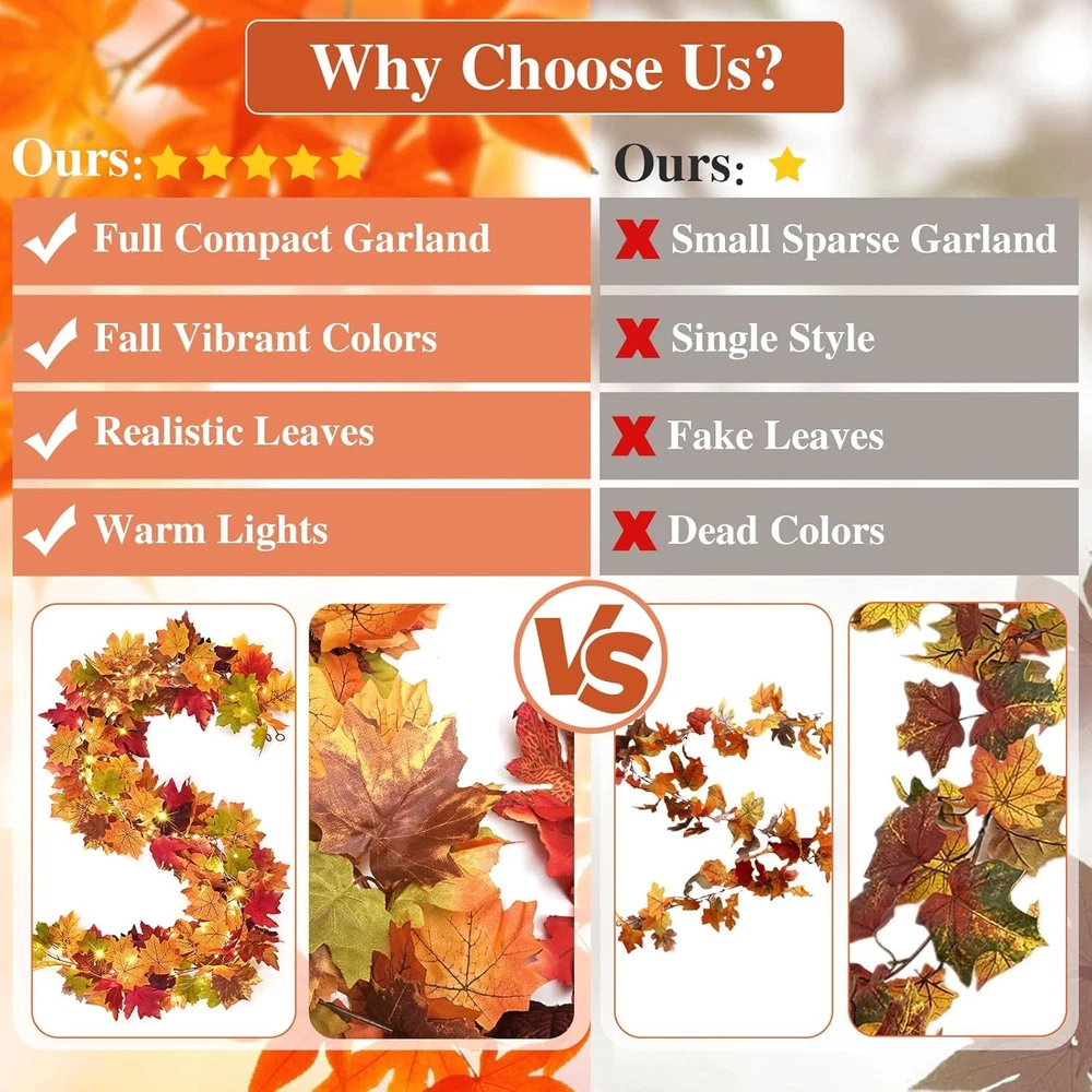 3Pcs Fall Garland with Lights, 17Ft Leaves for 3 Pcs, Orange LuxeFusion Product Description Features 【Elevate Your Fall Decor】Elevate your fall decor with our exquisite fall garland with lights! Each set includes 3 pcs fall garlands, measuring a total length of 17ft, along with a one 16ft string of lights. Easy to hang with two adhesive hooks included and loop on the end of garland. Appreciate the beauty of fall decor whether day or night. 【Pre-lit Lights Included】3 Pcs set with one string of light, which adds creativity to the fall garland. The power supply requires 3 AA batteries (not included). 2 lighting modes as twinkling and steady on to create the perfect ambiance. The warm and cozy glow combined with the vibrant colors of the fall leaves garland will instantly transform your space into a haven of comfort and relaxation. 【Realistic Design】Our fall garland features lifelike maple leaves in a beautiful mix of autumn colors. The fall leaves in 7 different colors captures the essence of the fall season, the realistic and intricate design of the maple leaf vine brings the beauty of nature indoors, creating a warm and inviting atmosphere in your space. 【Durable & Delicate】The maple leaves on fall garland are crafted of delicate silk , ensuring a durability and realistic feel, while the branches are made of high-quality elastic plastic,making them flexible and easy to shape. Unlike real leaves that wither, embrace the eternal beauty of our Thanksgiving decorations. 【Perfect Thanksgiving Decorations】Whether you want to adorn your mantels, staircases, doorways, windows, and even as a table centerpiece, the fall garland can be easily shaped and draped to fit any area, making it a versatile decoration option. Also suitable for weddings, Thanksgiving events or wherever you choose to use it to bring a rustic and romantic touch to the occasion. Product Details Manufacturer: Waipfaru Package Dimensions: 9.02 x 6.14 x 4.02 inches Item Weight: 12.6 ounces Country of Origin: China Item model number: Orange Brand: Waipfaru Color: Orange Material: Vinyl Size: 3 Pcs Shape: Runner Free Shipping All orders ship free and fast to your doorstep. Easy Returns Satisfaction guaranteed. 30-day returns, no questions asked. 24/7 Support Contact us anytime; we’re here to help, day or night. Brought to you by LuxeFusion – Quality you can trust.