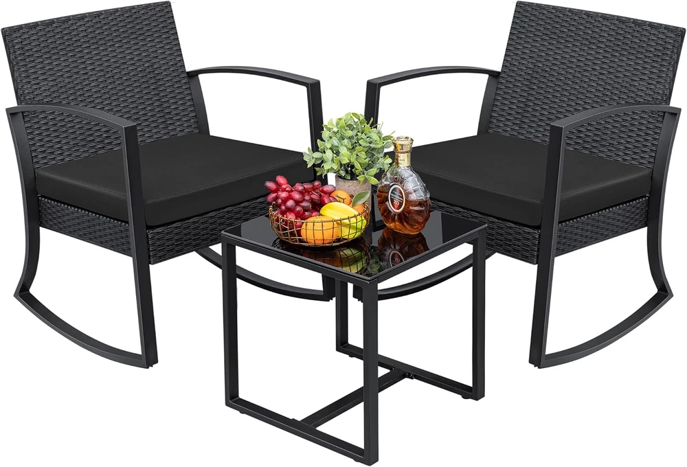 Premium Rocking Design: Experience effortless relaxation with our expertly balanced rocking chair. The smooth, gentle motion helps relieve stress while the sturdy base ensures stability—no tipping or wobbling, just pure comfort for your patio or garden. Sleek & Low-Maintenance Build: Modern meets practicality with a streamlined steel frame and tightly woven PP wicker. Unlike traditional rattan, our weather-resistant wicker won’t fray or sag, keeping its elegance season after season. Heavy-Duty Construction: Built to last with rust-proof powder-coated steel and reinforced joints, supporting up to 250 lbs effortlessly. The tempered glass table resists spills and scratches, making cleanup a breeze—just wipe and go. Cloud-Like Comfort: Sink into the extra-deep seat with plush, thickly padded cushions. The removable polyester cover offers both luxury and convenience, so you can unwind for hours without fatigue. Effortless Outdoor Living: Designed for hassle-free enjoyment: stain-resistant fabrics, fade-proof materials, and a stable rocking motion perfect for lazy afternoons or lively gatherings. Your ideal outdoor retreat starts here. Greesum 3 Pieces Outdoor Furniture Set Patio Bistro Rocking Chairs Specification: Color: Black Rocking Chair Dimensions:20"(L) x 18"(W) x 29"(H) Table Dimensions:16"(L) x 16"(W) x 16"(H) Package Dimensions: 24"(L) x 23"(W) x 11"(H) Weight: 46.3 lbs
