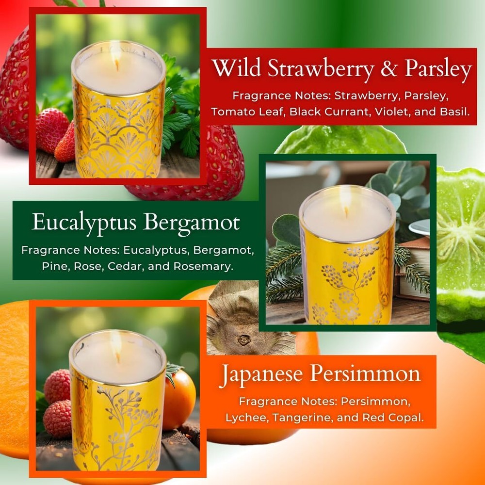 1. Absolutely love this candle set! The scents are so unique and refreshing—wild strawberry & parsley is sweet yet herbal, persimmon is warm and fruity, and eucalyptus bergamot is calming with a citrusy twist. The soy candles burn clean, fill the room beautifully, and the gold jars add a touch of elegance. Perfect for unwinding after a long day or gifting to someone who needs a little relaxation. The throw is amazing, and each scent transitions smoothly with the seasons. Highly recommend for anyone who loves cozy, high-quality candles!
