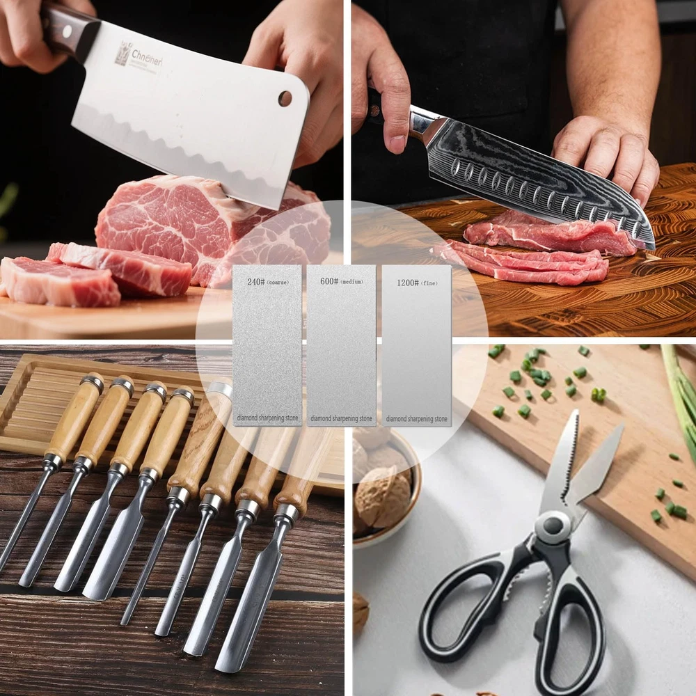 1. This diamond sharpening set is a game-changer for keeping knives and tools razor-sharp! The three grit options (240, 600, 1200) handle everything from heavy repairs to fine polishing. The compact size is perfect for storage or travel, and the silicone backing keeps it steady during use. Super durable and effective—definitely worth it!