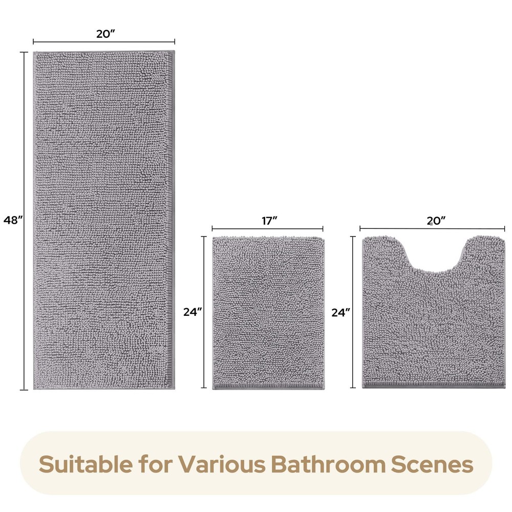 COMPLETE 3 PIECES BATHROOM RUGS: Include 1 Small Bath Rug 17"x24", 1 U-Shape Contoured Rug 20"x24", 1 Long Bath Rug 20"x48". Unique fiber-locking technique, say goodbye to horrible fiber-dropping! Thicker and better constructed than most other rugs. Suitable for hotel, sauna, shower, gym for bathroom, bedroom, dining room, living room, and so on. NON-SLIP BATH RUGS: The bottom is made of high-quality PVC material. This anti-skid backing has practically slip resistance on the tile floor surface, that it won’t slip or slide to keep you more safe and cozy. Unlike other rugs where the rubber backing tends to wear and peel off after several washes. The rugs are much stronger and durable for long-lasting use. ULTRA SOFT: These upgraded luxurious shag rugs can soak up the water and keep your floor dry like a gaint sponge, made of plenty of shaggy microfibers, each fiber about 1 inch and more compact and thick to arrange together, the rug set soft enough like sinking into a deep shag pile while you step on it. HIGH WATER ABSORBENCY: High-pile, thick Chenille fabric helps save your floors from dripping water while you're stepping out of the bath, bathtub, shower, or getting ready by the sink. Moisture is trapped in the bathroom mat's deep pile, allowing the rug to dry quickly and cleanly. Place rug on CLEAN DRY SMOOTH FLOOR only. Water under the rug can cause it to slip. Keep bottom of rug dry. MACHINE WASHABLE: Wash with cold water and mild detergent. Hang to dry, or air dry flat. Do not Bleach or Dry Clean. It's really easy to handle and care for. Colors remain nice and vibrant even after many washes