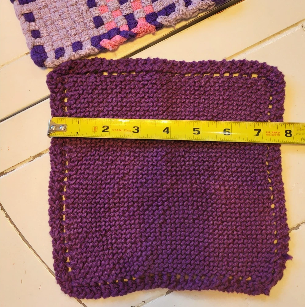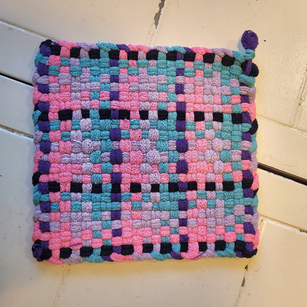 Add a touch of spring to your kitchen with this set of 2 handmade purple, pink, and turquoise woven potholders and 1 purple dishrag. Made from cotton, these traditional-style kitchen accessories are perfect for Easter and multipurpose use.