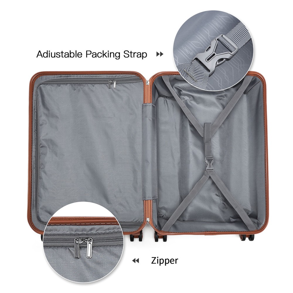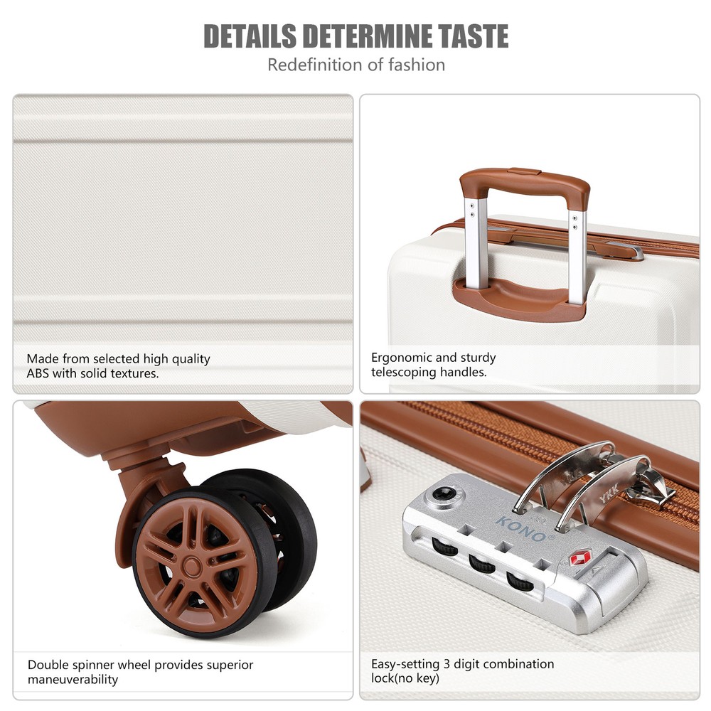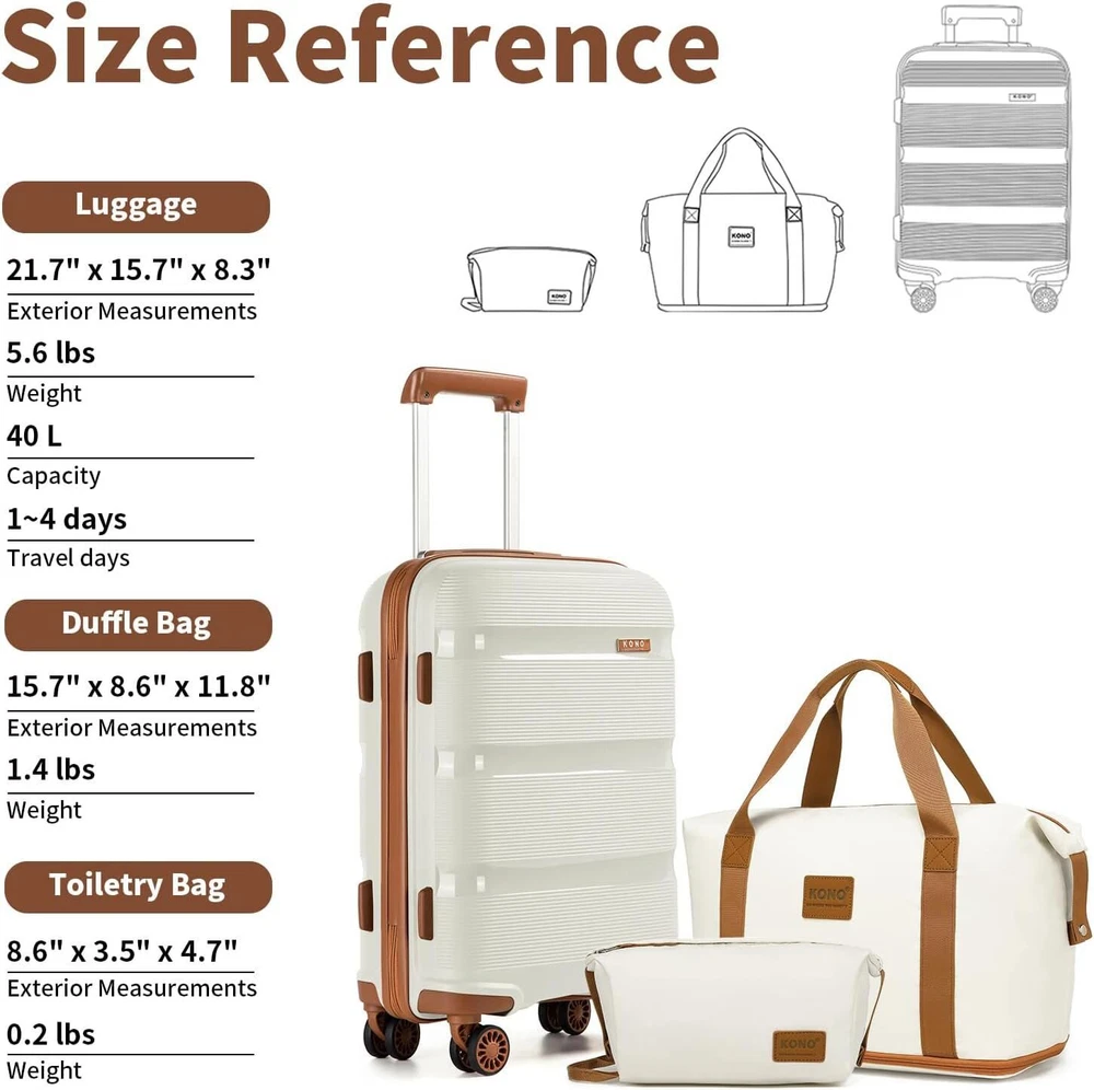 This set is perfect as it will cover you whether you are going on a city break or a sunny holiday. Material: Outer material: strong and durable ABS (Acrylonitrile Butadiene Styrene) Inner lining: polyester Aluminium telescopic handle Silver-tone metal hardware - YKK zippers Wipe clean only Size: 20 inch - 51.5cm(H) * 38cm(W) * 21cm(D); 2.465kg, approx. 44 litres 20 inch suitcase is cabin friendly - always check with your airline as cabin luggage dimensions can differ. Bag: 40cm(L) * 22cm(W) * 30cm ~ 42cm(H) / 15.7"(L) * 8.6"(W) * 11.8" ~ 16.5"(H); 0.64kg Top handles - 18cm high Clutch bag: 22cm(L) * 9cm(W) * 12cm (H) /8.6"(L) * 3.5"(W) * 4.7"(H); 0.11kg All measurements are external, internal measurements may differ approx 1-2cm. Color: Cream Features: 【2-Year Warranty for 3-Piece Luggage Sets】 Dimensions include a 21.7" x 15.7" x 8.3" carry - on suitcase, a 15.7" x 11.8" x 8.7" weekender bag, and an 8.6" x 4.7" x 3.5" toiletry bag. Tailored for stylish leisure travelers, weekend adventurers, and short - term business commuters. Our 2 - year replacement guarantee covers all manufacturing flaws. 【Hard - Shell Suitcase and Waterproof Travel Bag Combo】 The Kono suitcase, crafted from lightweight yet durable polypropylene hard shell, resists scratches and pressure. The travel bag, made of waterproof nylon fabric, ensures your items stay safe and dry even in wet weather. 【TSA Lock and Smooth Gliding 360° Spinner Wheels】 Ideal for international trips, the TSA lock allows agents to inspect without lock damage. The suitcase's silent 360° swivel twin wheels enable quiet and easy movement through crowded airports or train stations. 【Expandable Duffel Bag for Added Capacity】 This duffel bag expands for extra packing room. A bottom zipper instantly boosts its capacity. A small strap lets you attach it to your suitcase handle, freeing your hands for a more enjoyable journey. 【Multi Purpose and Flexible Combinations】 The 3 - piece luggage set with a carry - on bag can be arranged according to your needs and trip duration. Perfect for travel, weekends, sports, and social gatherings. The bags can be nested for space - saving storage. How to set the code: All locks are preset to '000', to change this you need to press the reset button (with a pen or toothpick). Change the three numbers to your desired code. Let go of the reset button and now the code is set. Make sure it is something memorable for you but not too simple.