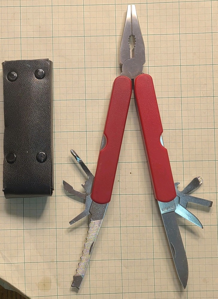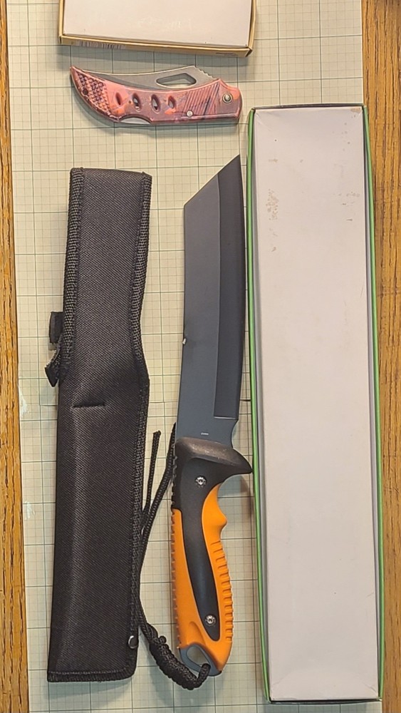 What is being offered? A tactical knife, a small folding tactical knife, and a nine tool folding knife. The nine tool knife is stainless steel and appears to be new there's no sign of use. However it's not branded. The photos provided are of the exact items being sold. Study the photos carefully. The model number for the larger knife is TA-0400R. And the smaller knife model number is TA007 PC. If you have questions about either of the knives send me a message. They are new but the boxes have been open. The larger knife is 12 in overall with a black blade and 3.5 thickness double color rubber handle, black and orange. The smaller knife is a 4-in closed tactile folder stainless steel blade and plastic handle pink camo pattern. Other sellers have the small knife valued at at least $6.