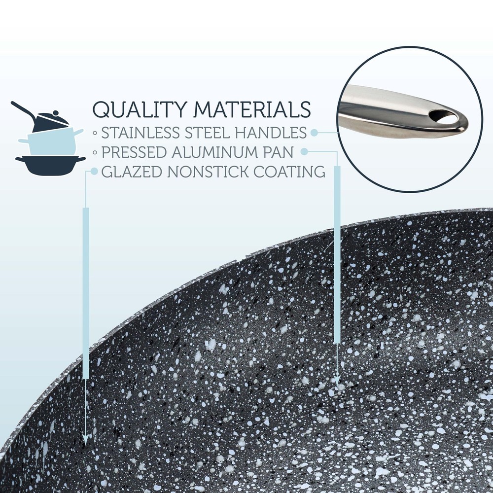Evenly cook an omelet or fry steak tips with the Potted Pans 3 Piece Non Stick Frying Pan Set. Constructed of pressed aluminum and coated with a marble splatted glaze creates a non-stick surface on these frying non stick pan skillets. Ergonomic stainless steel handles stay cool to the touch for comfortable use and to beautifully compliment your breakfast stone pans. 2.3mm heat inducing base ensures even heating to precise temperatures for easier cooking. Use on your gas and electric stove. 8, 9.5, and 11-inch frying pan nonstick set provides optimal sizes for day to day cooking. Nonstick surface makes it easy and quick to clean after any meal. Simply rinse and wipe with a towel. Warning: This product can expose you to chemicals which is [are] known to the State of California to cause cancer and birth defects or other reproductive harm. [A Pan for Every Part of Your Meal]: Whether cooking eggs and large pancakes or frying up steak and sauteing vegetables, the Potted Pans Marble-Coated Stone Cookware Set has 3 sizes of nonstick frying pans to meet your needs [Excellent Heat Transfer]: Magnetic conductive base on small frying pan nonstick skillet pan ensures quick and even heating; Compatible with electric, ceramic, and gas stoves and induction cookers [Non Stick Surface]: Marble-coated aluminum construction prevents food from sticking while you cook; Use on low to medium heat with minimal oil; Cleans easily with water [Perfectly Sized Cooking Pans]: Small 8-inch (20.3cm) wide nonstick pan has an internal 1.6 by 7.8-inch (4.1 x 19.8cm) size; 9.5-inch (24.1cm) pan has an internal 2 by 9.4-inch (5.1 x 23.9cm) size; Large 11.1-inch (28.2cm) pan has a 2 by 10.9-inch (5.1 x 27.7cm) internal size [Built to Last]: Pressed aluminum pans and stainless steel handles keep your fry pans lightweight for easier use when cooking; Long handles are securely connected to the pan for solidity