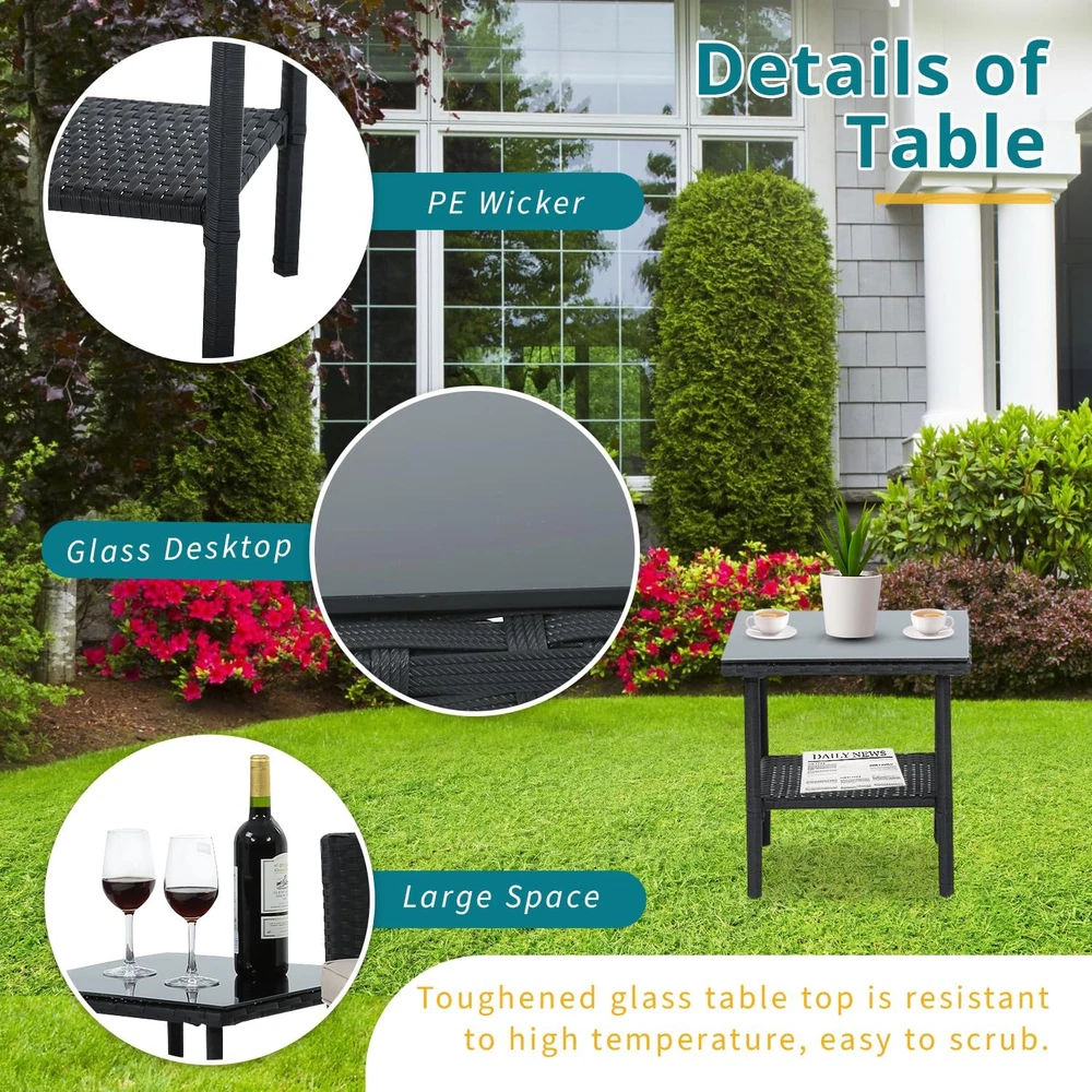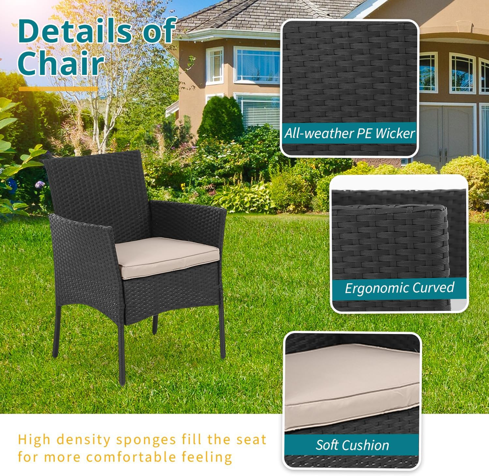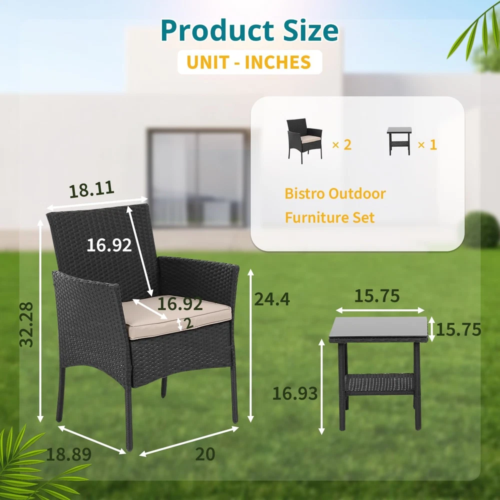 『Excellent Stability & Durability』: This front porch furniture is equipped with non-slip feet pads to protect your floor and make the balcony furniture more stable. Thanks to bottom of the chair has Ten-shaped brackets, the whole chair has a large load-bearing capacity. Small patio furniture set is made of excellent PE rattan and strong steel frame, which are not easily deformed or corroded thus the furniture set can be used for long time. 『Comfortable & Convenient』: Soft sponge-filled seats give you extra comfort, Conversation Sets gives you a excellent seating experienceand,the covers can be removed for easy clean and maintain. Toughened glass is strong and light, which can be swabbed or washed with water. 『Ergonomic Outdoor Chair』: This outdoor patio chairs are ergonomically balanced with backs for extra lumbar support, and comes with two wicker chairs and a coffee table. The curve of armrest on the both side, comfortable and skin-friendly support, fits your body line. You can put some drinks or snacks on the table, and then sit down to enjoy the cozy life. 『Best for Outdoor Living』: The all-weather wicker with a nature look is suitable for using in all seasons. The combination of two chairs and a table is perfect for close conversations. Premium lightweight rattan makes it easy to move this outdoor seating from patio to lawn or from backyard to garden. 『EASY ASSEMBLY』: This Outdoor Furniture Set Comes With All Hardware & Necessary Tools. Follow The Instruction, You Can Easily And Quickly Assemble The Bistro Set.NOTE: When you try to install the patio bistro set, try to line the hole together in all side, do not over tight one hole, then try to tight it slowly in each side What We Offer: A new 3 pieces patio furniture sets, Complete installation tools, An installation instruction, Our worry-free 6-month after sale service and Friendly customer. Product Description The table in the patio set is made of high-quality tempered glass,Our Outdoor Patio Wicker Sets all kinds of outdoors. Style and settings, convenient storage, save space.This patio set is designed to be modern and stylish with a low-maintenance feature. Our rattan set includes two comfortable chairs and a table with tempered glass. This set is elegant and very well matched. It is suitable for balcony, garden, teahouse, living room, etc. Product Specifiacion Package included: 1 x Tempered Glass Top Coffee Table 2 x Rattan Chair 2 x Thick Cushion Rattan Chair Dimension: L20"*W18.89"*H32.28" Table Dimension: L15.75"*W15.75"*H16.93" Table with removable tempered glass adds allows you to places drinks,meals,or decorative items on top. The 2-inch seat cushion brings you a more comfortable experience, and the zipper design makes regular cleaning easier. Strong non-slip table legs and chair legs can protect the floor and maintain stability Patio chairs 3 piece set is made of excellent PE rattan and strong steel frame, which are not easily deformed or corroded thus the furniture set can be used for long time. Quality manufacturing, unique craftsmanship, cross-shaped table and chair frames are stronger The chair is not only lightweight, but also has a super load-bearing capacity of 200 pounds.