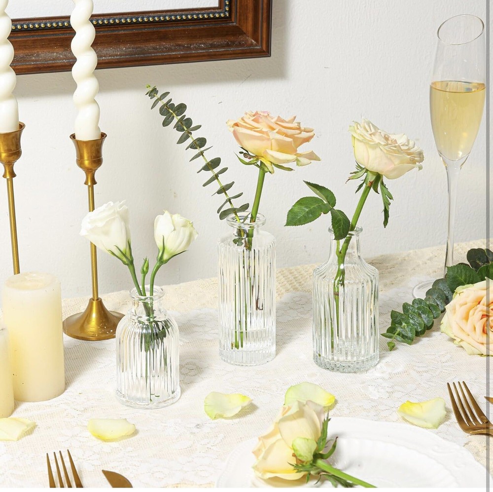 The Glass Bud Vases Set of 3 features small ribbed vases in a vintage Style-2 design. Suitable for various occasions like Christmas and weddings, these clear glass vases are perfect for home decoration. With a round shape and recommended use as a vase, they are ideal for displaying flowers in rooms such as the bathroom, living room, bedroom, home office, or dining room. Lot E