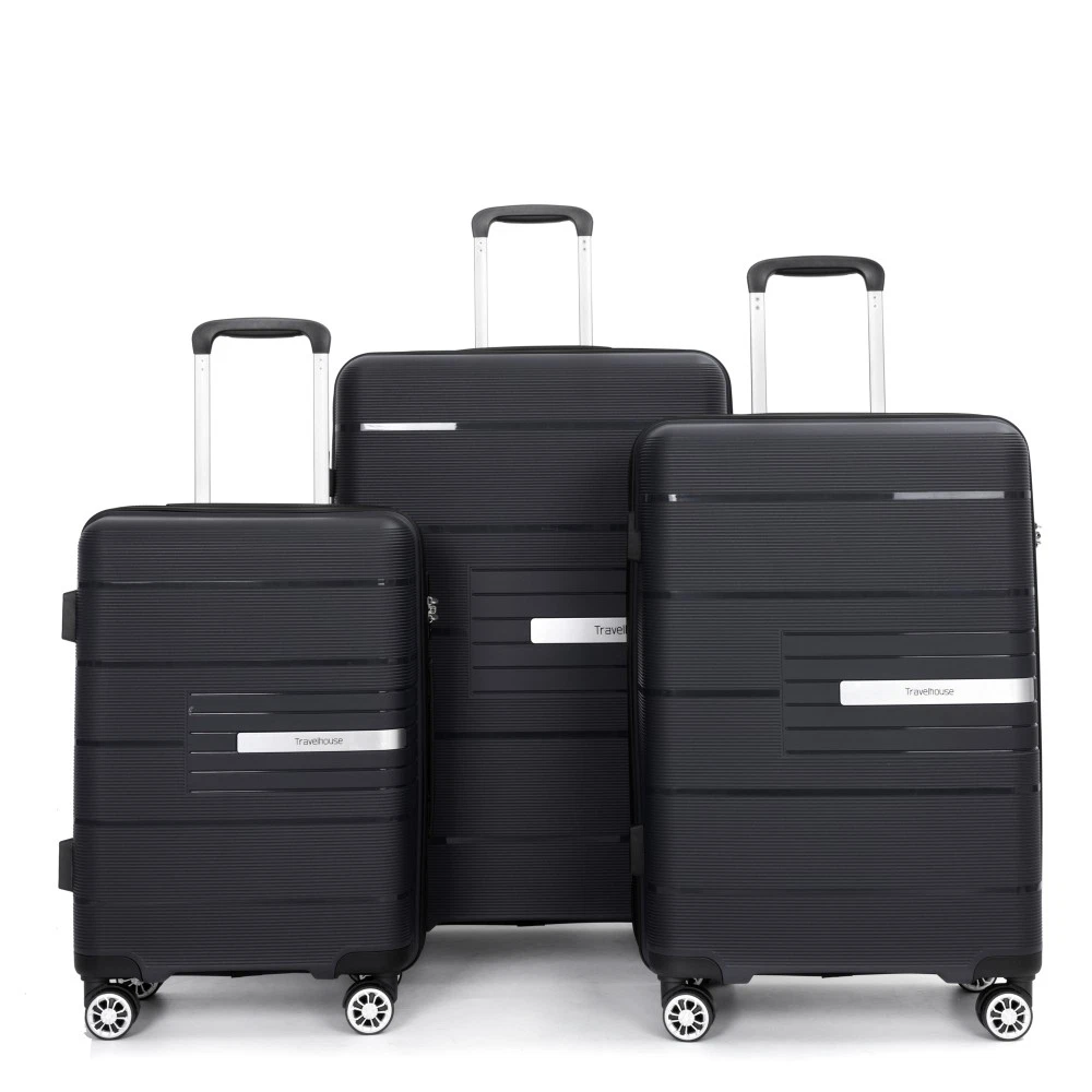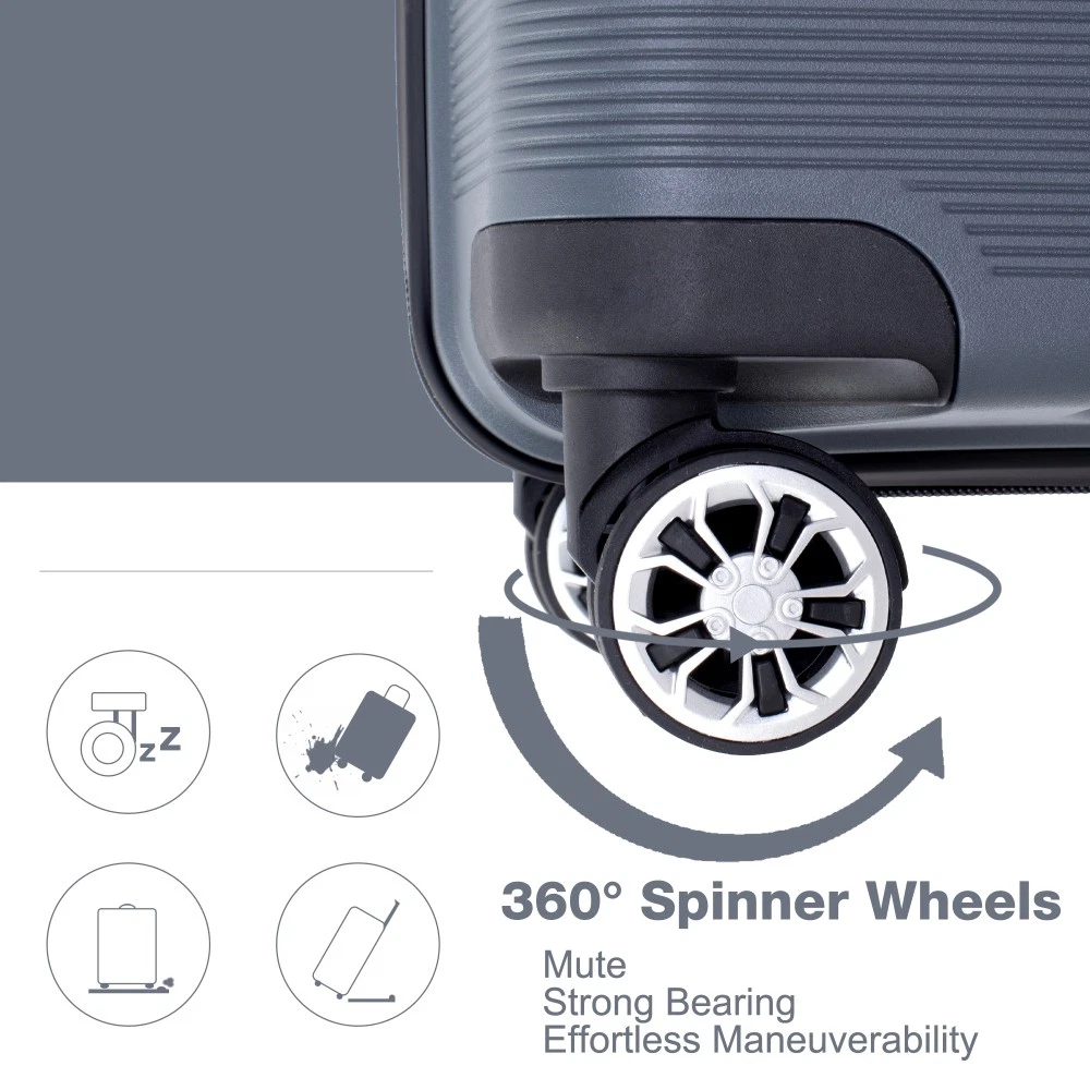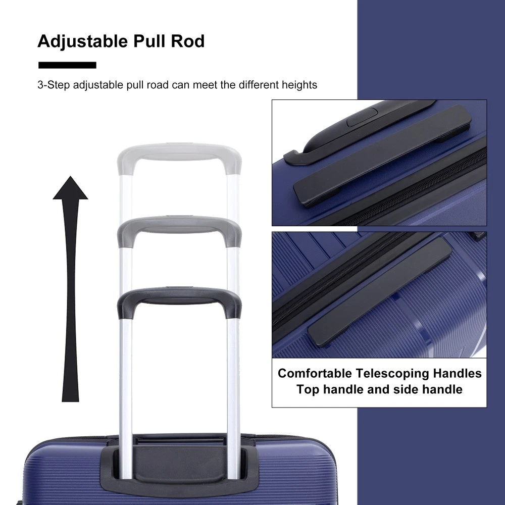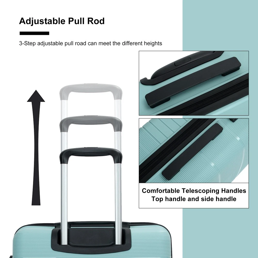 This complete set comes with three luggage pieces of different sizes; small, medium and large. Each size can accommodate your needs perfectly together or separately depending on the duration of your trip and how much you need to bring with you. 100% PP material make the luggage pieces are lightweight and more durable. TSA lock allows only customs agents to inspect your luggage without damaging the lock and protects your stuffs in luggage and privacy more better. Simply set the combination. No keys are required. Adjustable & sturdy ergonomic 3-step telescoping handle allows you to maneuver in tight spaces and provide effortless movement. Smooth ups and downs for more comfortable carrying. 360° Double spinner wheels: Mute, strong bearing, effortless maneuverability. Organized and spacious interior. The fully lined luggage includes a handy divider and an interior organizer with zippered pocket for smaller items. TSA Lock TSA lock allows only customs agents to inspect your luggage without damaging the lock and protects your stuffs in luggage and privacy more better. Simply set the combination. No keys are required. Organized and Spacious Interior The fully lined luggage includes a handy divider and an interior organizer with zippered pocket for smaller items. Adjustable Pull Rod Adjustable & sturdy ergonomic 3-step telescoping handle allows you to maneuver in tight spaces and provide effortless movement. Smooth ups and downs for more comfortable carrying. 360° Double Spinner Wheels Mute, stronger bearing, effortless maneuverability.