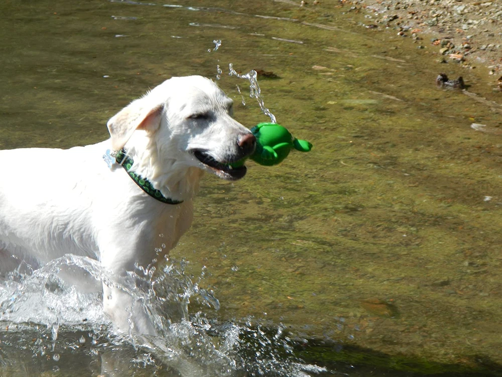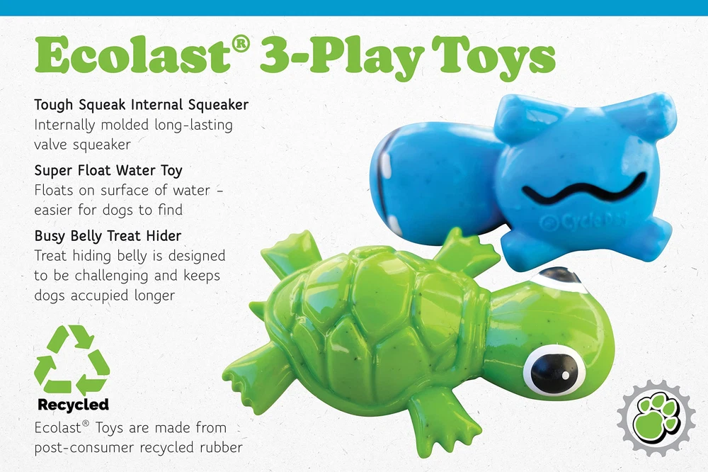Three times the fun! 's 3-PLAY Turtle combines a squeaking play head, a treat hiding tummy and webbed footed float toy. Features Super Float to float above the water surface, making it easier to find for all water dogs. The 3-Play Recycled Turtle is made with Ecolast high durability post-consumer recycled material, for hours of fun while reducing your dog's carbon paw print. The Busy Belly tummy slot can be filled with kibble, treats or other tasty items your dog loves. Tough Squeak internal squeaker for extended playtimes. INDESTRUCTIBLE TOY FOR AGGRESSIVE CHEWERS: Does your dog keep chewing through all the toys you buy them? Don’t worry. The 3-Play Dog Toy is a tough, near-indestructible toy for even the most aggressive chewer. It’ll keep your pup occupied for hours of fun. SUSTAINABLY MADE WITH RECYCLED MATERIAL: At , everything we make uses durable post consumer recycled material. This toy is built from special Ecolast material to reduce your dog’s carbon pawprint. INTERACTIVE TOY FOR OUTDOOR DOGS: A great toy to take on-the-go, the 3-Play features Super Float to float above any surface of water so your water dog doesn’t ever lose track of it. TREAT DISPENSER: Does your furry friend deserve a treat? Fill the Busy Belly tummy slot with kibble, treats or other tasty items your dog loves to give them an extra reason to play. LONG LASTING FUN: Built to last long, the 3-Play Dog Toy comes in adorable Hippo form and features a Tough Squeak internal speaker for extended playtimes.