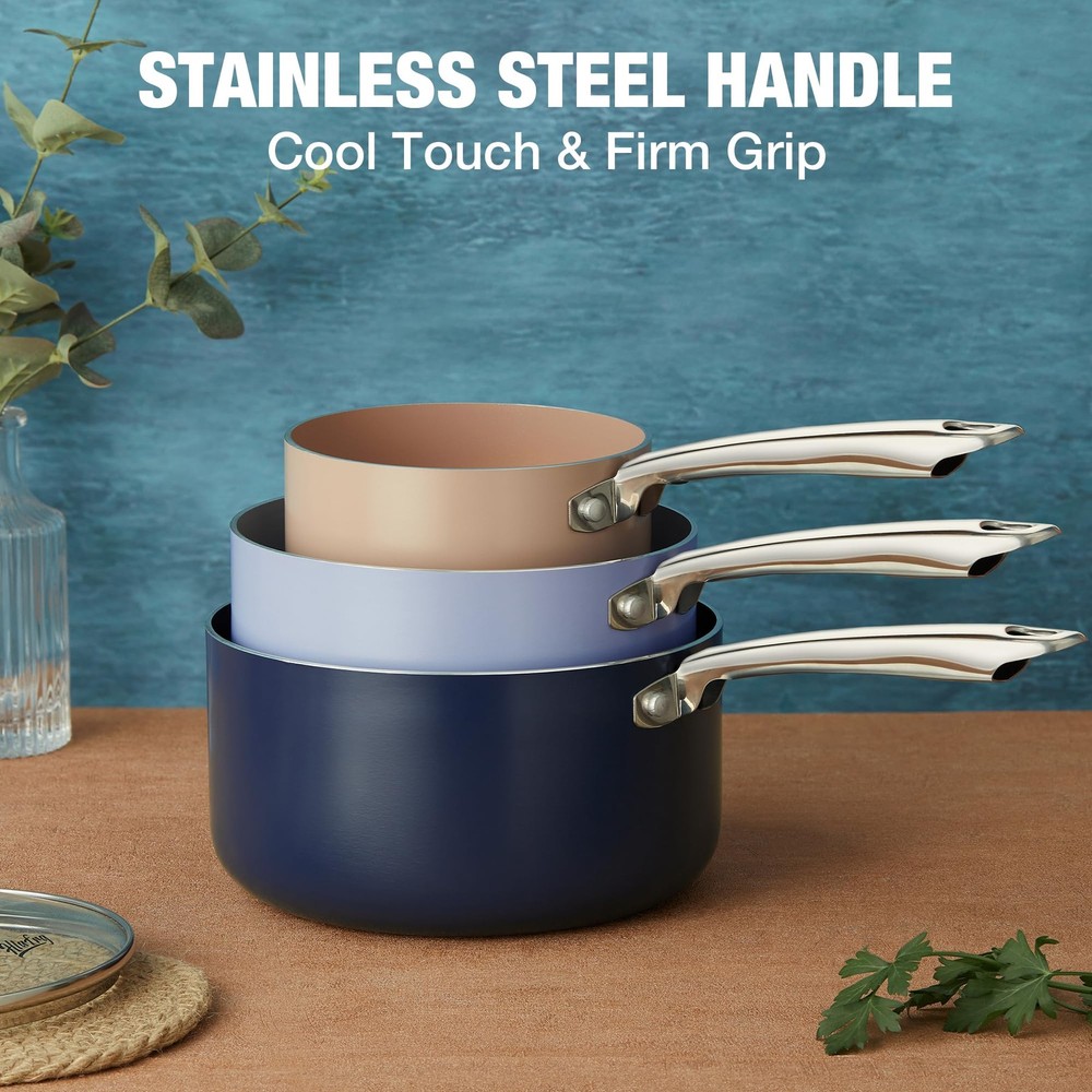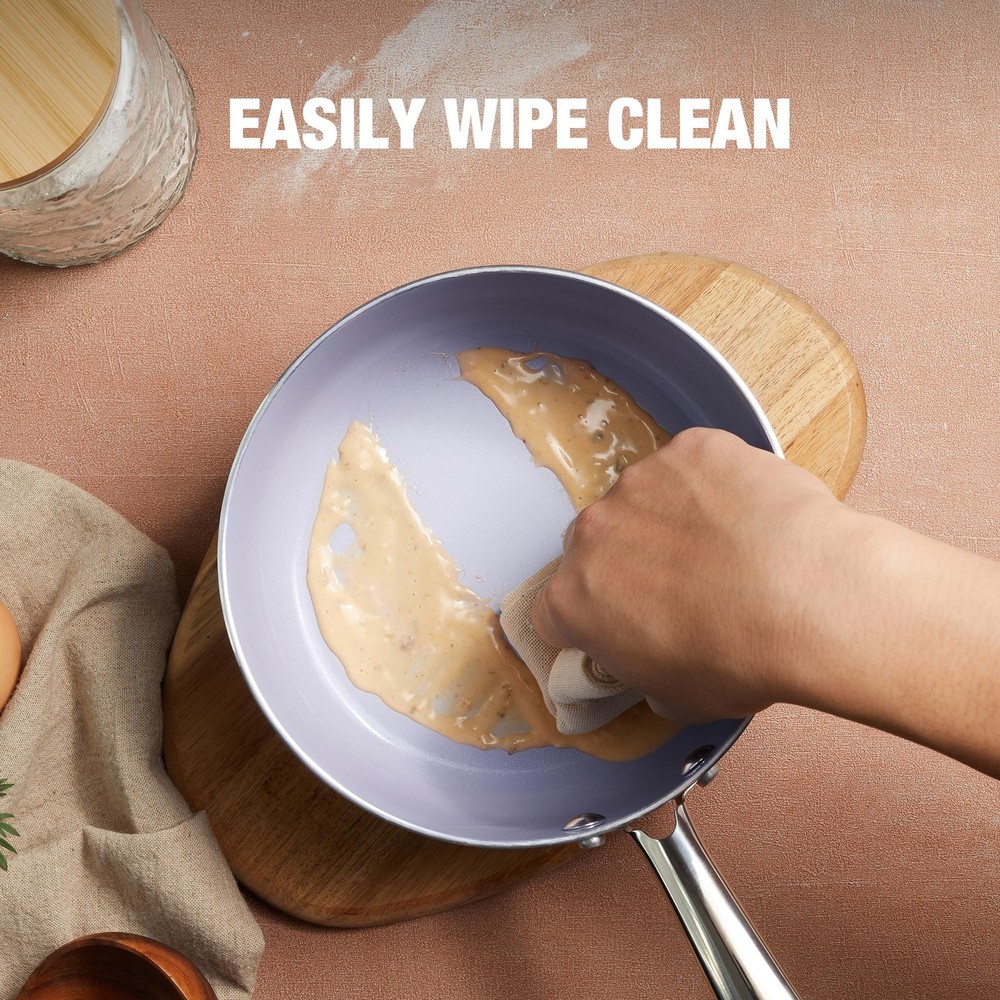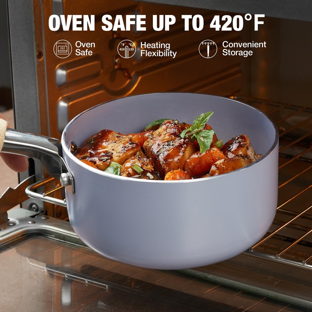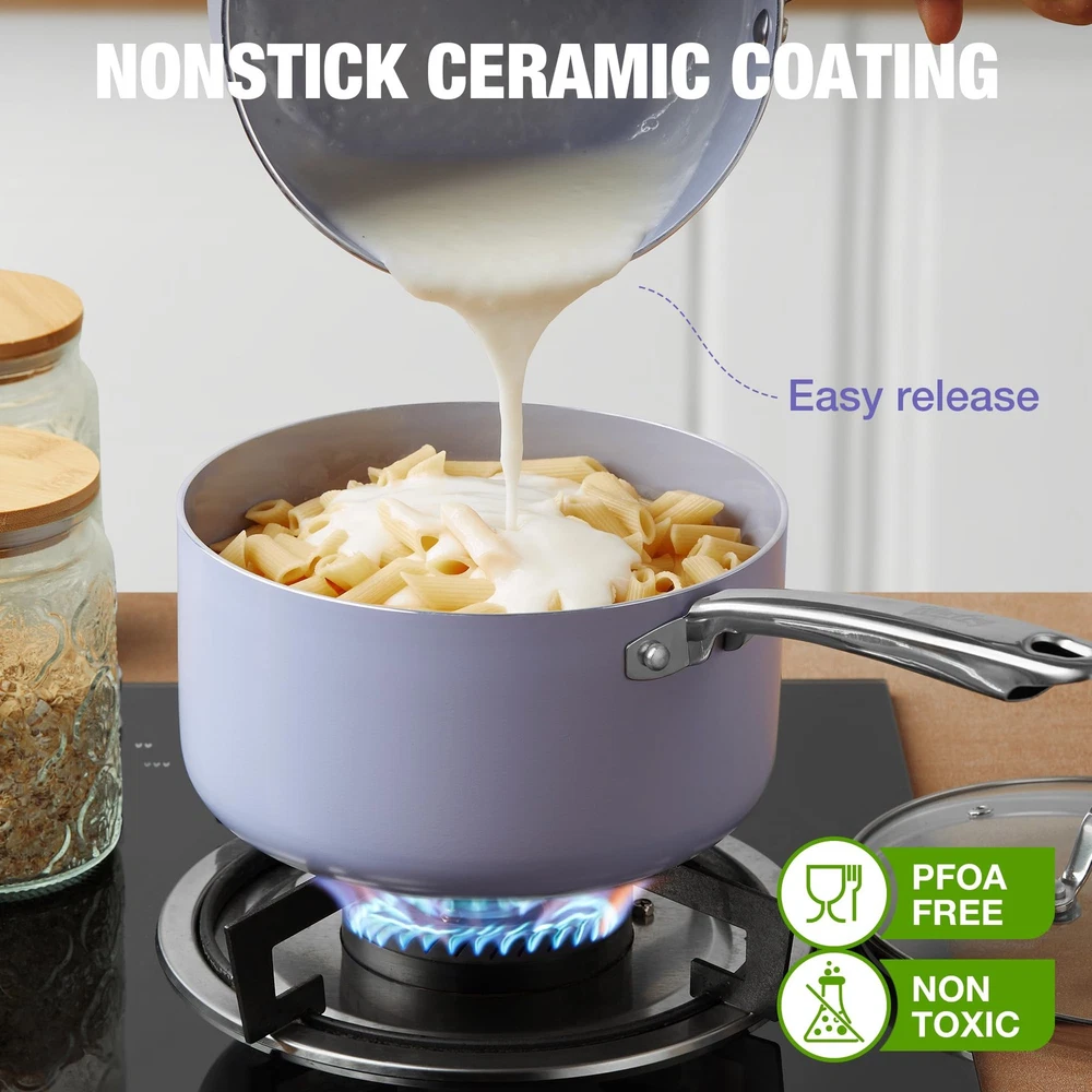 3QT Nonstick Saucepan with Lid Toxin Free Ceramic Coating Small Pot with Stainless Steel Handle Easy to Clean Suitable for All Stoves Oven Safe Gradient Purple Pan Y-SHAPED HANDLE & GLASS LID: The ergonomic handle provides a comfortable grip, while the tempered glass lid makes the cooking process easy to observe and locks in heat and moisture. If used over an open flame for a long time, beaware of metal getting hot and use pads and gloves ULTRA NONSTICK SURFACE: 3QT saucepan features a ceramic non-stick interior and exterior for easy cooking and cleaning, allowing for enjoyable smooth cooking with effortless cleanup BIULT FOR DIET: The non-stick ceramic coating of this 3QT milk pan is toxin-free and requires only a small amount of oil for stick-free cooking, reducing fat intake and ensuring healthy diet DISHWASHER & OVEN SAFE: For added convenience and practicality, 3 quart saucepan is designed to be dishwasher safe and oven safe up to 420℉ VERSATILE MAGNET BASE: The magnetically conductive stainless steel base allows the saucepan to be used on all stovetops, including induction, and the aluminum alloy core is for fast and even heating