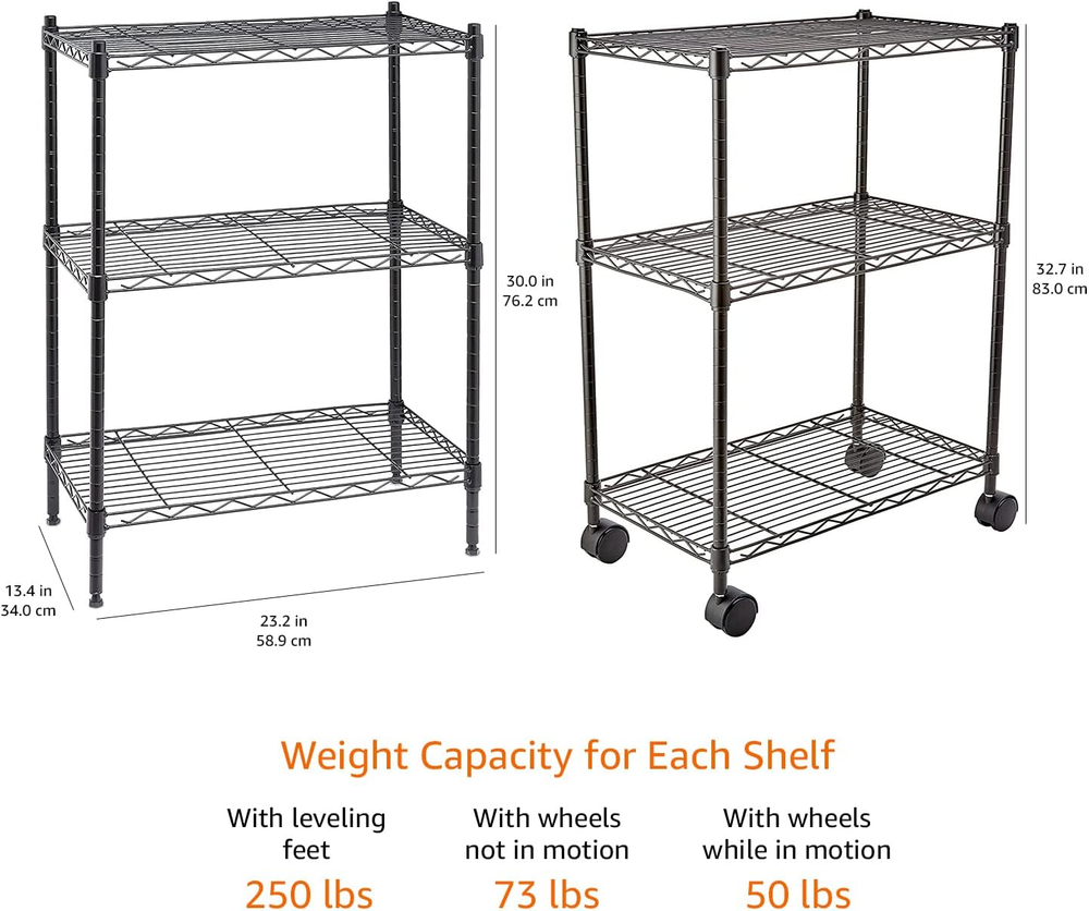 3-Shelf Adjustable, Heavy Duty Storage Shelving Unit on 2'' PP Plastic Wheel Casters, Metal Organizer Wire Rack, 23.2" L x 13.4" W x 32.75" H, Black 3 shelf wire rack offers handy storage space and easy access to tools and supplies Durable steel construction with a Black finish; weight capacity per shelf: 250 pounds with leveling feet, 73 pounds with wheels not in motion, and 50 pounds with wheels in motion; weight capacity overall: 750 pounds with leveling feet, 220 pounds with wheels not in motion, and 150 pounds with wheels in motion (based on evenly distributed weight) Adjustable shelf height in 1-inch increments for customizing; 4 leveling feet for stability; 2-inch PP plastic wheels for easy maneuvering Multi-purpose versatility; use in a garage, laundry room, kitchen, playroom, or other living or work space Assembles quickly and easily; no tools needed Product Dimensions: 23.2 x 13.4 x 32.75 inches (LxWxH) Product Description An Amazon Brand. From the Manufacturer AmazonBasics Item model number SL-SUAM-118 Style With Wheels Material Alloy Steel, Plastic, Metal Country of Origin Vietnam Import Imported Room Type Garage, Kitchen Assembly Required Yes Batteries required No Product Dimensions 13.4"D x 23.2"W x 32.75"H Care instructions Hand Wash Only Finish Type Black Finish,Metal Included Components User Manual Shelf Weight Capacity 33.11 Kilograms Item Weight 10 pounds Number of Shelves 3 Special Feature Heavy Duty Mounting Type Floor Mount Shelf Type Metal Color Black Global Trade Identification Number 00841710155358 Recommended Uses For Product Garage, Kitchen Finish types Black Finish,Metal Number of pieces 3 Size 3-Shelf 23.2 "h x 13.4 "h x 32.75 "h. Weight: 10.0 lb Shipping from the USA All of our products are shipped from the USA, ensuring quick delivery to your destination. Payment We offer the following payment methods: PayPal, credit card, bank transfer, and eBay's secure payment system. Free Shipping & Free Returns Shipping within the USA is FREE. Additionally, any return is absolutely free for you. Risk-Free Purchase You have the option to return an item within 30 days without any justification. We cover the return shipping costs! Fast Shipping We ship immediately upon receipt of payment. Generally, the package is delivered within 2-3 days in the USA. If it takes longer, we will contact you. Quality and Costs Made in Europe, USA, China No customs fees or additional charges Total satisfaction guarantee Invoice with declared VAT available upon request in .pdf format Feedback Your feedback is very important to us. After you pay for your purchase, you will automatically receive positive feedback from us.