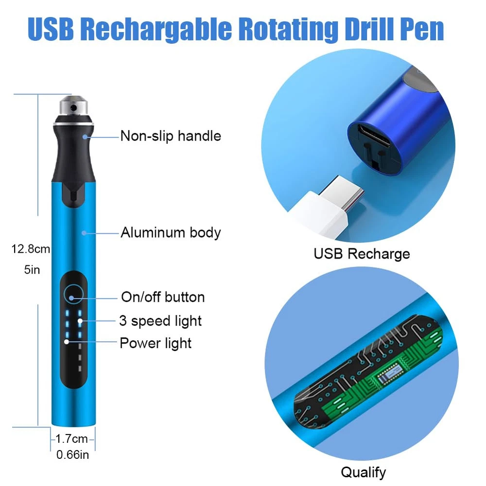 Unique Drill Pen: The New design power drill kit will release your hand from manual hand drill,it can use 30 minutes after full charging. Its textured aluminum pen body,Non-slip grip offer compact and comfortable using experience. 3-Speed Adjustment: the Rotary micro drill pen equips with qualify motor. 3 position adjust rotation speed from 5000rpm, 10000rpm to 18000rpm,different speed will be suitable for different material you need to work. Useful Bits Accessories:we equip 8 different size of drill bits(0.8,1.0,1.2,1.3,1.5,1.8,2.0,2.2),They made of Ti-plated high-speed steel, much harder and more durable. Additional 3 small saw blade for occasional cutting requirements.Using pliers or wear a glove when install bits to avoid scratching by sharp drill bit. Easy To Use/Carry:All our bits own unified diameter 2.35mm,you just need take the bits to put in jewelry drill pen directly when you want to change bits,But please be careful to avoid scratching your finger by sharp drill bit while changing.In addition, you can take it to outdoor use after full charging. Best DIY Gift: the resin drill kit special design for DIY jewelry arts and crafts ,such as epoxy resin jewelry, keychain,necklace, earrings,anklet, bracelets ,wood slice, acrylic, plastic, aluminum, coins, etc. It will ideal gift to send who interesting in above.