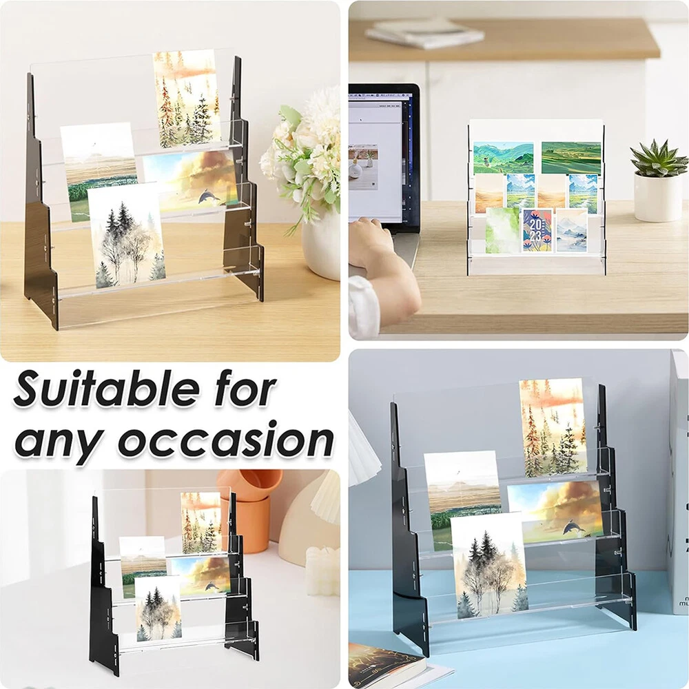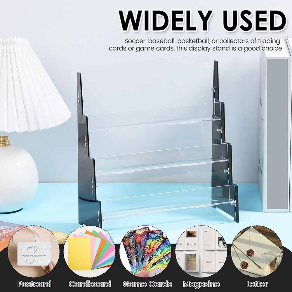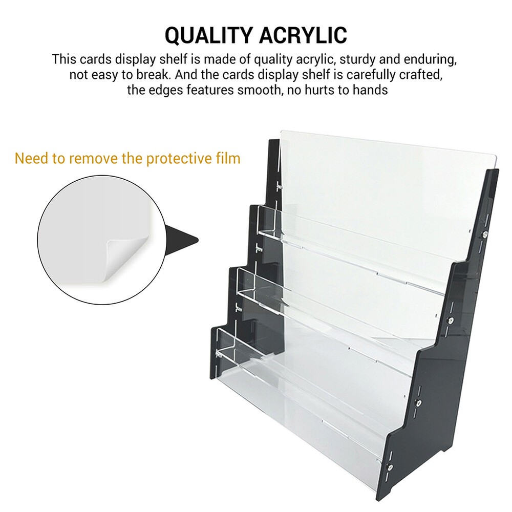 Product Description Features: Quality Acrylic: This cards display shelf is made of quality acrylic, sturdy and enduring, not easy to break. And the cards display shelf is carefully crafted, the edges features smooth, no hurts to hands 3 Tiers: The cards display shelf features 3 tiers design . The cards display shelf is ideal for precious collection displaying. Also, suitable for shop counters Easy to Access: The cards display shelf features clear that allows to clearly see and access the cards you are displaying. Also, the cards display shelf can protect your sports cards or collectibles Easy to Install: The cards display shelf is easy to install. And it will securely hold your precious sports or collectible cards on the compartment. Not easy to slip and no need to worry the cards getting damaged Ideal Gift: This cards display shelf is an ideal gift for fan of football; baseball; enthusiasts; basketball or a trading or game card collector. Ideal to showcase your sports card collection Specification : Material : Acrylic Size : 240*100*260mm Package included: 1 x Acrylic Trading Card Display Stand (Not included cards)