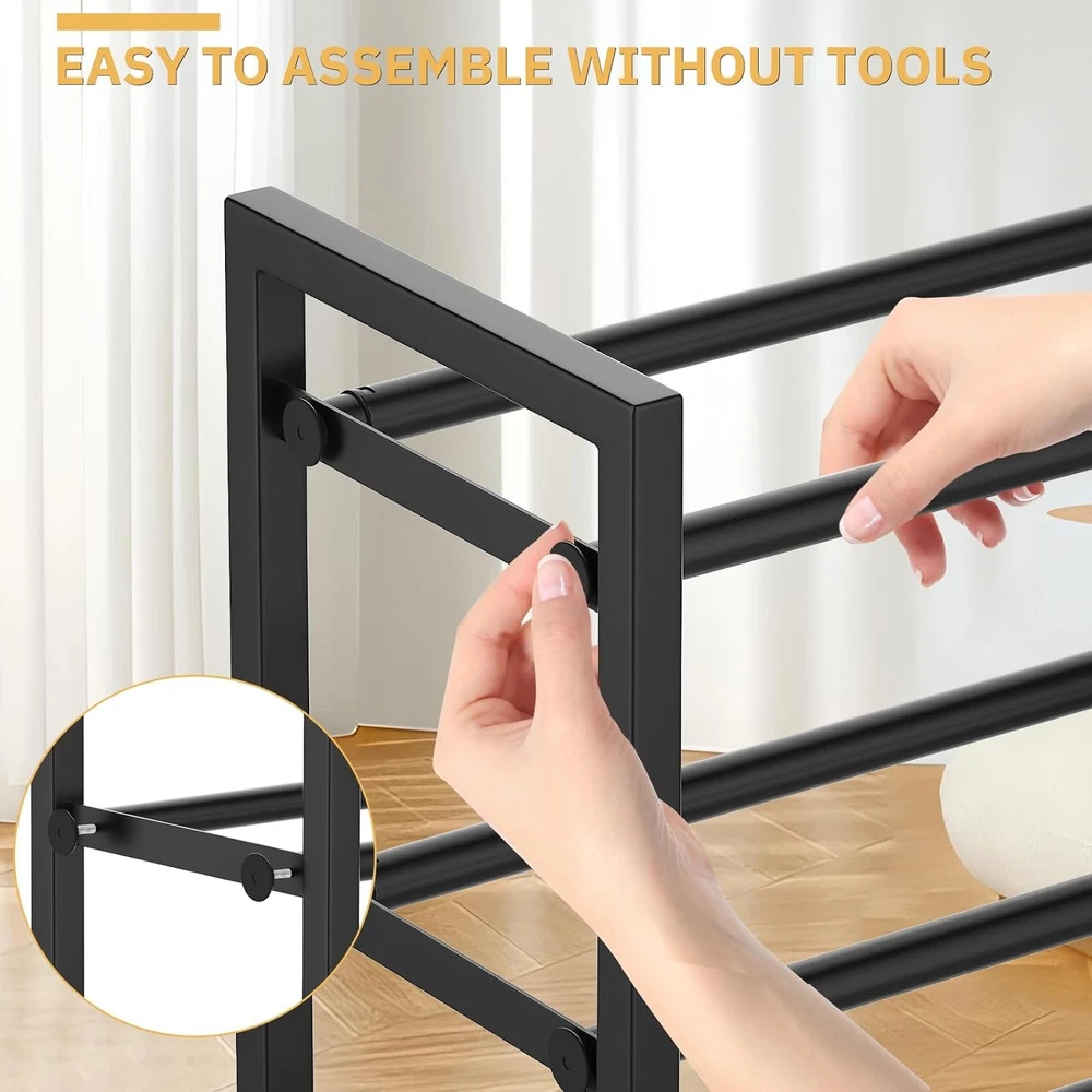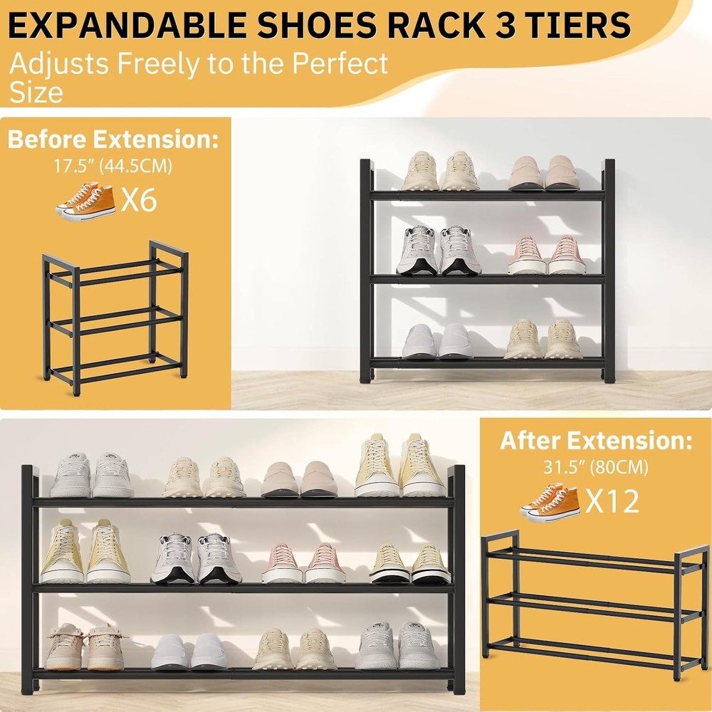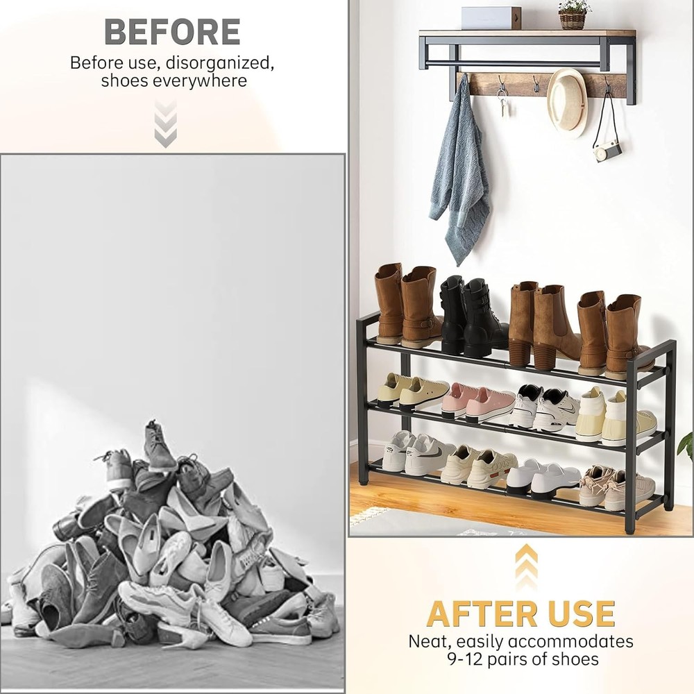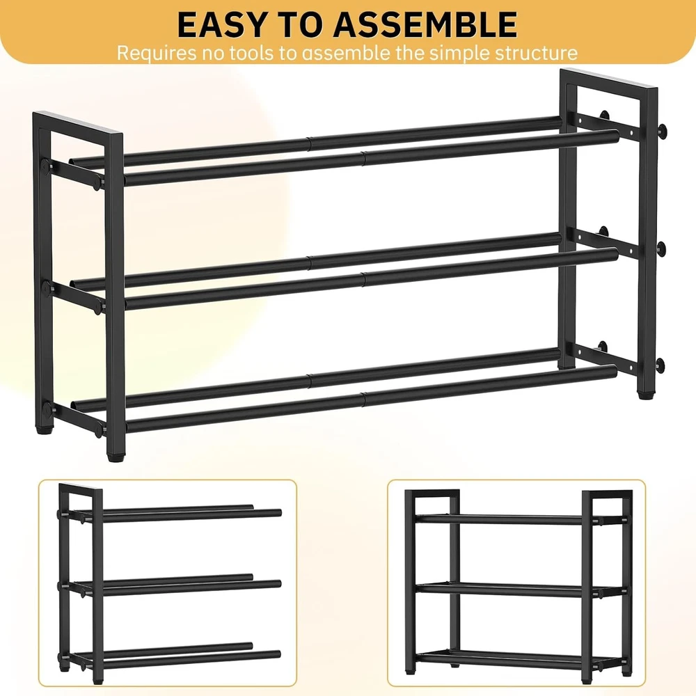 This shoe rack is a game-changer for small spaces! The adjustable width makes it super versatile—fits perfectly in my closet and entryway. No tools needed for assembly, and it holds up to 12 pairs of shoes without wobbling. Sturdy, space-saving, and totally worth it!