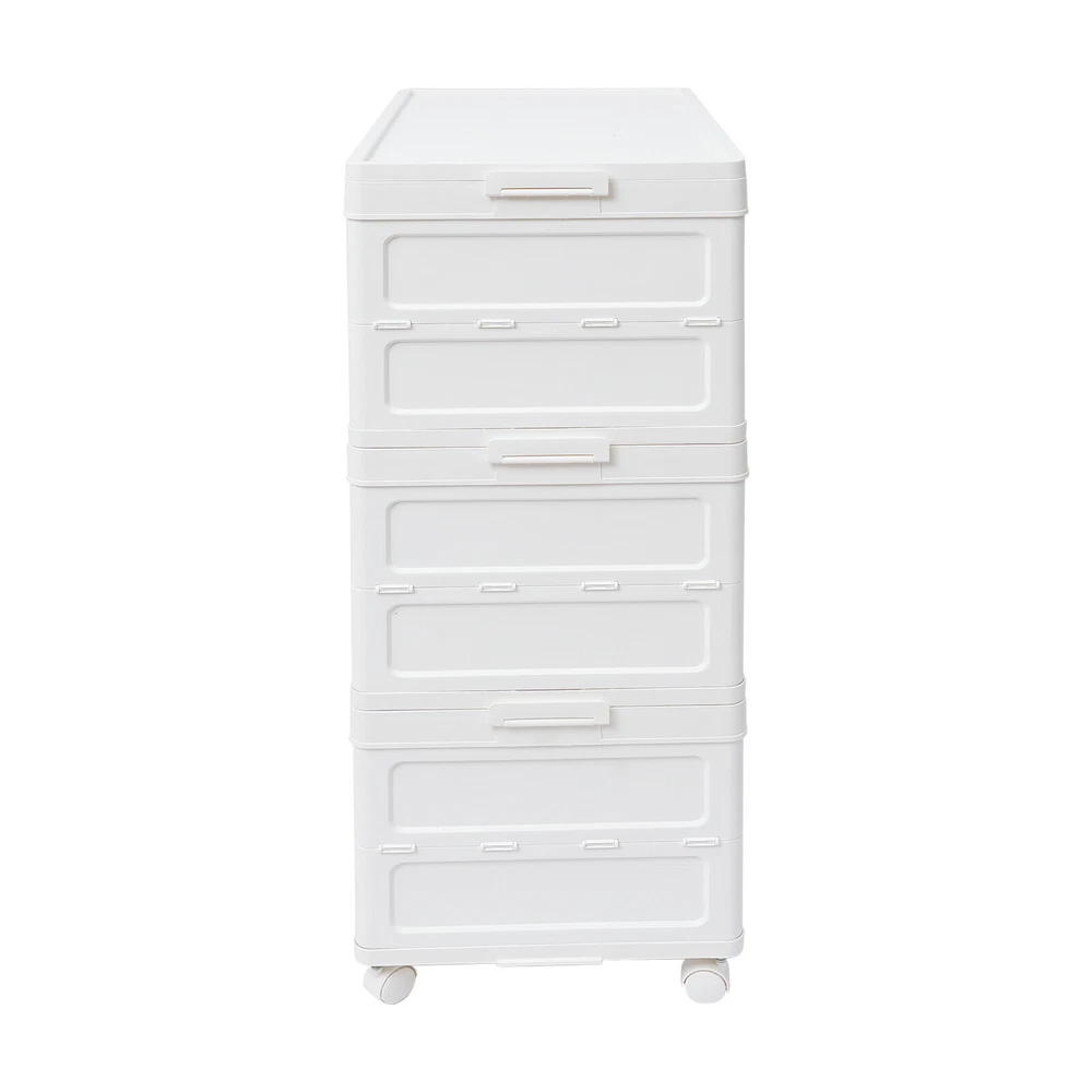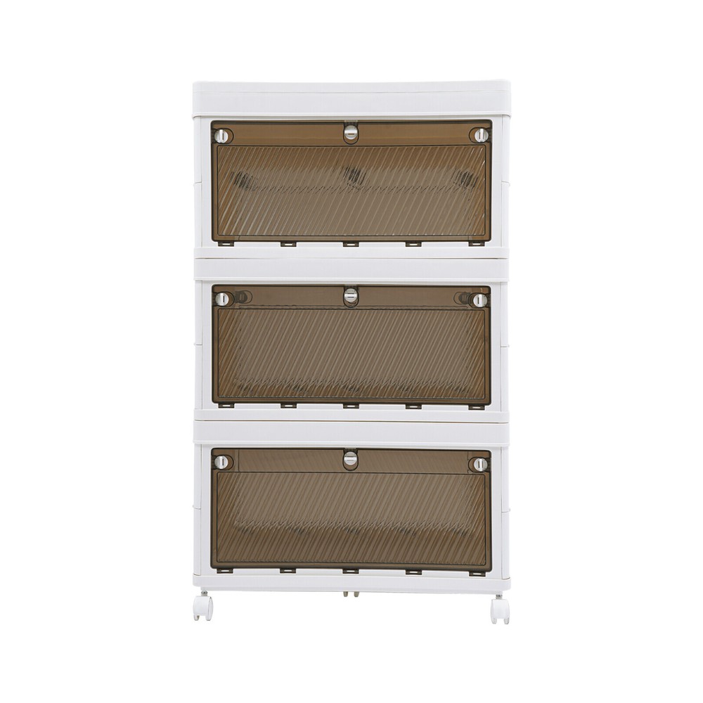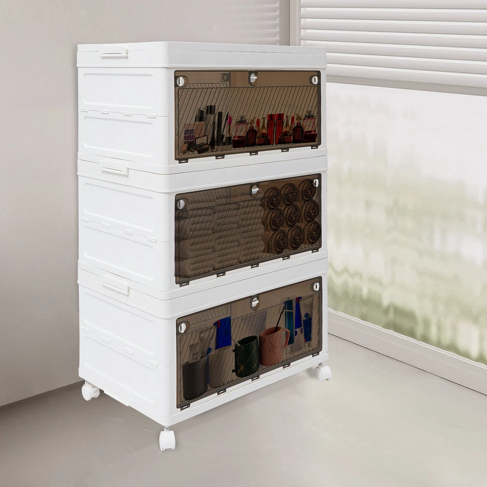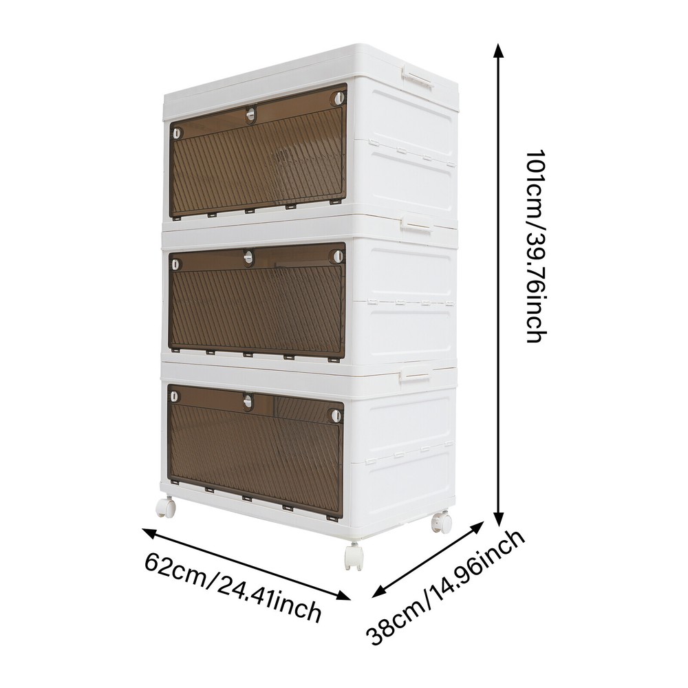 Application It is used to store clothes, books, cosmetics, toys, snacks, perfume, and other items (not included). It is suitable for a bedroom, children's room, kitchen, laundry, dormitory, and other places. Specification Color: White Material: PP Process: Injection Molding Style: Modern Number of Tiers: 3 Assembly Required: Yes Mount Type: Freestanding Type of Wheels: 4 * Universal Wheels (2 with Brakes) Total Load-bearing Capacity: About 10-15kg/22.05-33.07 lbs(For Reference Only) Product Size: 62*38*101cm/24.41*14.96*39.76 in Package Size: 62.5*25*40cm/24.61*9.84*15.75 in Gross Weight: 8kg/ 17.64 lbs Net Weight: 7.6kg/16.76 lbs Package Included 1* 3-tier Foldable Storage Organizer 4* Universal Wheels 3 Tier Foldable Storage Organizer w/Wheels Stackable Clothes Cabinet Storage Box Description Are you troubled by home storage? Are you looking for a storage cabinet that is both practical and easy to move? Our 3-tier foldable storage organizer will be your ideal choice, making your home environment instantly tidy and orderly. The spacious design makes it superior in storage capacity, meeting your diverse storage needs. It is a home storage artifact that combines space optimization, convenient mobility, durability, and thoughtful design. Choosing our product means choosing a more organized and convenient way of life. Key Features Made to Last: This product is made of premium PP, treated with an injection molding process, which is sturdy, impact-resistant , scratch-resistant , and rust-resistant , ensuring long-term aesthetics and practicality. Modern Appearance: The pleasing white and tan color scheme, simple appearance , and smooth lines add beauty elements to your room. It plays a unique decorative role while using, bringing an exquisite charm into your home. Spacious Space: It has a 3-tier design, which is enough to easily store clothes, snacks , cosmetics, and other items(not included) , making your room cleaner. Foldable Design: It can be quickly folded flat when not in use to be placed in the corner of the room or car boot to save storage space. User-friendly: Unlike magnetic buckles, the door panel of this product adopts mechanical buckles, which have better locking mechanisms and will not easily pop out. In addition, it can be opened from the front door and rear door, both of which can conveniently retrieve items from different directions, providing you with convenience. Easy to Move & Fix: Four universal wheels (two with brakes) make the whole product easily moved from one place to another and can be fixed at will, greatly enhancing efficiency and convenience. Visible Design: The translucent doors allows you to quickly search for items while ensuring that internal items are not completely exposed, providing a certain level of privacy protection. Free Assembly: The modular design allows you to freely choose the number of tiers to assemble, fully adapting to different storage needs and space layouts. Effortless Cleaning: It has a smooth surface and a simple structure, so you only need to wipe the dust or residue with a towel. Ideal Gift: With good performance and a modern appearance, it can be used as an ideal housewarming gift for parents, friends, and lovers so that they can also enjoy a more exquisite and convenient life. Good Customer Service: We aim to provide quality products and services. If you have problems, please feel free to contact us. We will reply and solve the problem for you as soon as possible. Details Raised Bottom: It is conducive to moisture resistance and facilitates cleaning. Side Buckles: They make each tier of the organizer firmly fixed, and improve the stability of the product. Smooth Edges: They no t only increase the beauty of the product but also improve the safety of use. Application It is used to store clothes, books, cosmetics, toys, snacks, perfume, and other items (not included). It is suitable for a bedroom, children's room, kitchen, laundry, dormitory, and other places. Specification Color: White Material: PP Process: Injection Molding Style: Modern Number of Tiers: 3 Assembly Required: Yes Mount Type: Freestanding Type of Wheels: 4 * Universal Wheels (2 with Brakes) Total L oad-bearing Capacity: About 10-15kg/22.05-33.07 lbs (For Reference Only) Product Size: 62*38*101cm/24.41*14.96*39.76 in Package Size: 62.5*25*40cm/ 24.61 * 9.84 * 15.75 in Gross Weight: 8kg/ 17.64 lbs Net Weight: 7.6kg/ 16.76 lbs Package Included 1* 3-tier Foldable Storage Organizer 4* U niversal Wheels Notes Please note that this product does not include other storage items shown in the picture. Please use within the load-bearing range of the product. Please allow the slight color difference caused by the shooting light and 1-3cm error due to manual measurement, and make sure you do not mind before ordering. Payment Delivery details Terms of sales About us Contact us Payment We accept ebay payment 。 Fees such as import duties, taxes are not included in the item price or shipping costs. These charges are the buyer's responsibility. Delivery details Shipping: 2-9 working days to: USA Terms of sales We maintain high standards of excellence and strive for hundred percent customer satisfaction. Feedback is very important to us. We hope that you contact us immediately before you give neutral or negative feedback, so that we can address your concerns. It is impossible to address issues if we do not know about them! About us Your satis faction is our ultimate goal. We work hard to earn your trust and future business. Our certified technicians have tested each item before shipping. The unit comes with 1 year limited warranty on all manufacturing defects. a) If you receive a defective item, you may return it or ask for a discount. Please contact us within 14 days after you receive the package. b) What you returned must be intact and in its original packaging as re? u. Customer is responsible for shipping costs of the returned item. c) We will cover the cost of shipping back t with th