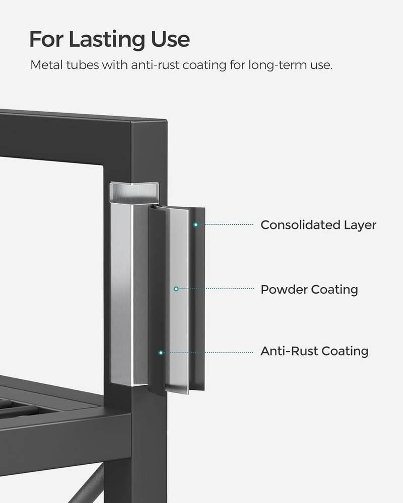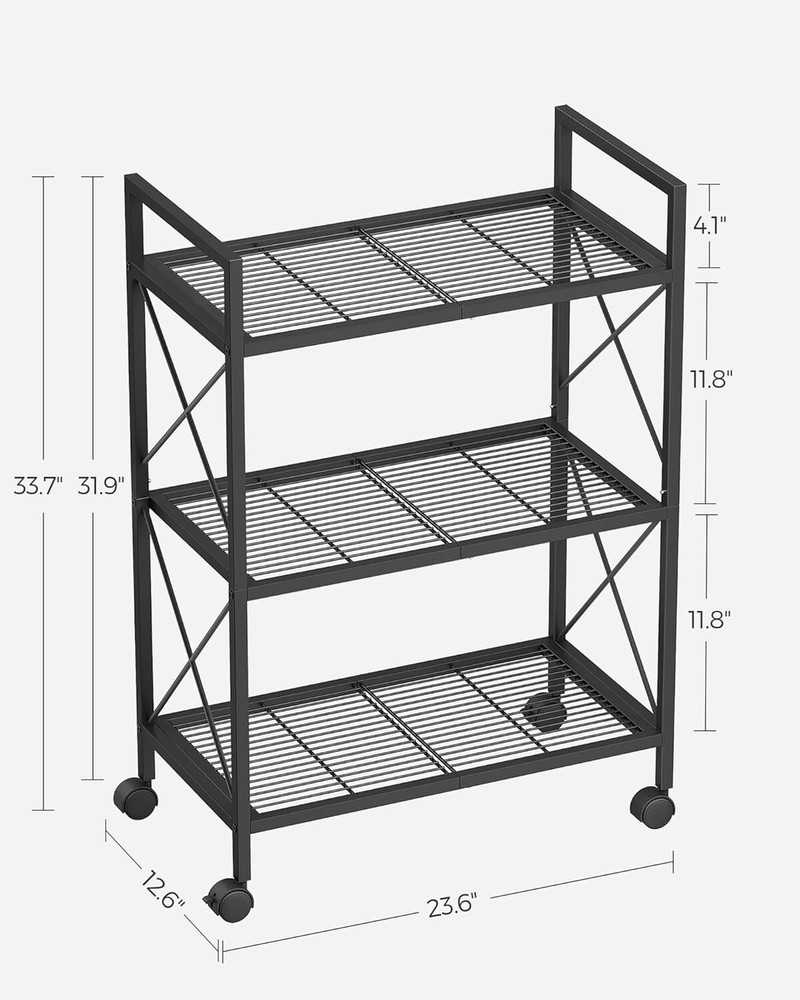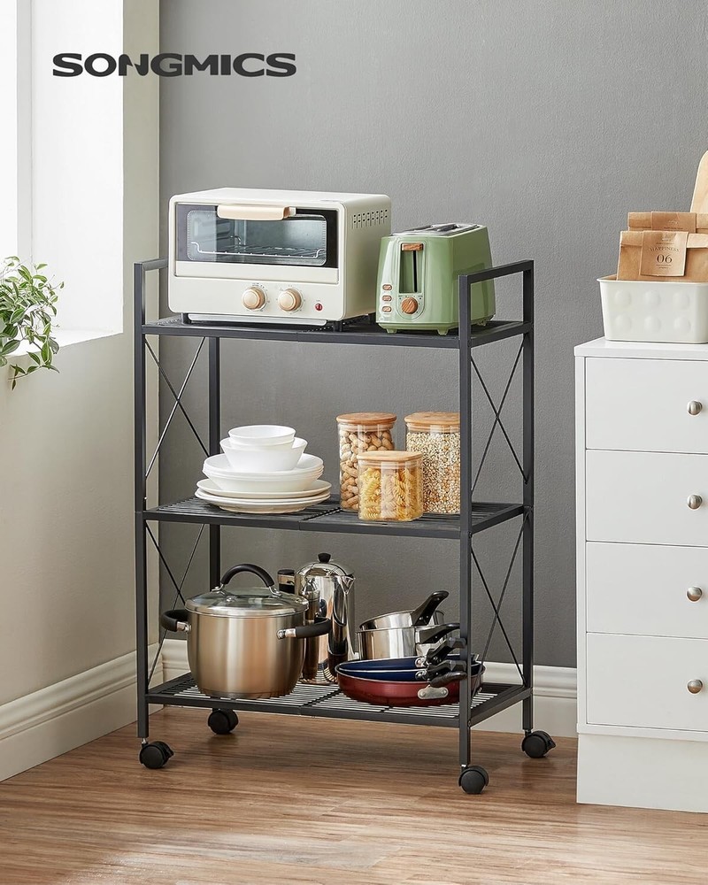 SONGMICS 3-Tier Metal Storage Rack with Wheels, Mesh Shelving Unit with X Side Frames, 23.6-Inch Width, for Entryway, Kitchen, Living Room, Bathroom, Industrial Style, Black UBSC163B01 [All-Metal Versatile Rack] The robust steel frame and mesh shelves combine into this durable storage rack. Use it in your entryway for shoes, in the kitchen for cooking utensils, and in your bathroom for toiletries for years to come [X Side Bars] X-shaped side bars help reinforce the structure, protect your items from falling off, and lend a charming flair to your space—three benefits for this design! [With Casters or Adjustable Feet?] It’s up to you! You may choose to install casters to roll this 3-tier shoe rack anywhere you need easily, or install the adjustable feet to keep it balanced on slightly uneven floors [Reliable Support for Your Items] Dense mesh shelves with 0.6" (1.5 cm) spacing fit even small items. The strong steel frame boasts high strength for firm support (with casters, max. 44 lb (20 kg) per shelf; with adjustable feet, max. 110 lb (50 kg) per shelf) [Considerate Details] Premium packaging protects this shelving unit from damage during transportation. When it arrives, the included clear instructions and numbered parts will help you finish the assembly quickly