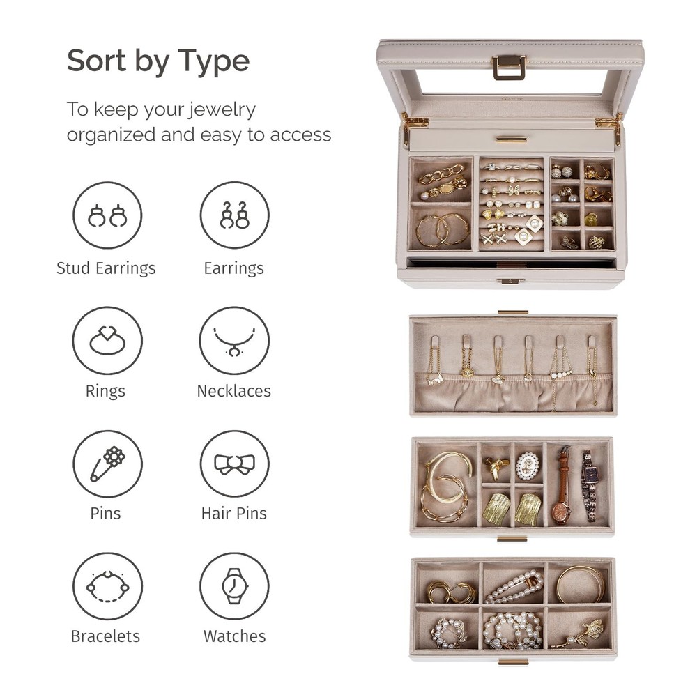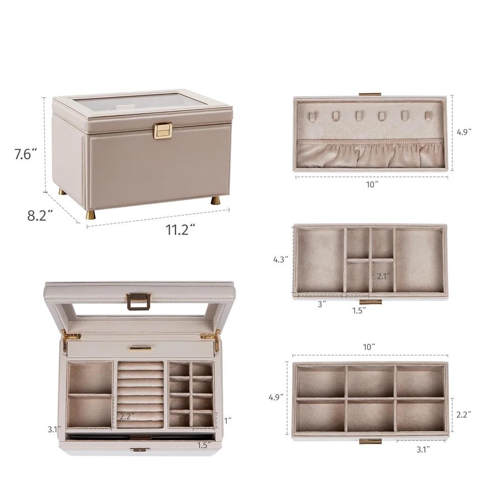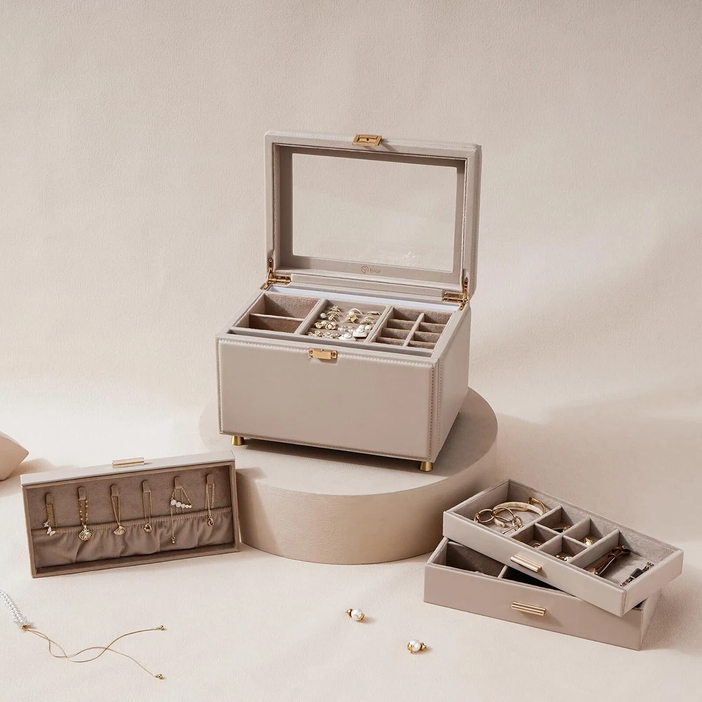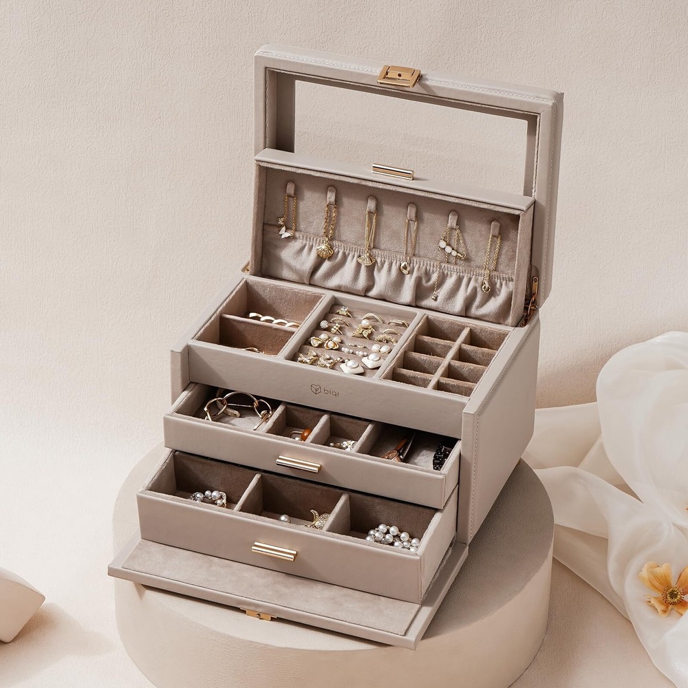 Jewelry Box with Glass Window, 3-Tier Jewelry Organizer with 2 Drawers, Large Jewelry Storage Box for Necklaces, Bracelets, Rings, Earrings, Women Gift - Buy Now with Fast Shipping! Jewelry Box with Glass Window, 3-Tier Jewelry Organizer with 2 Drawers, Large Jewelry Storage Box for Necklaces, Bracelets, Rings, Earrings, Women Gift Product Details Color: light taupe Brand: BIQI MUSSE Material: Faux Leather Style: Modern Special Feature: Hinged, Waterproof, Secret Compartment, Dustproof, Adjustable Recommended Uses For Product: Necklace, Bracelet, Ring, Watch, Earring, Bangle Product Dimensions: 11.22"D x 8.2"W x 7.64"H Target Audience: Women, Girls Shape: Rectangular Finish Type: Coated Color: light taupe Brand: BIQI MUSSE Material: Faux Leather Style: Modern Special Feature: Hinged, Waterproof, Secret Compartment, Dustproof, Adjustable Recommended Uses For Product: Necklace, Bracelet, Ring, Watch, Earring, Bangle Product Dimensions: 11.22"D x 8.2"W x 7.64"H Target Audience: Women, Girls Shape: Rectangular Finish Type: Coated Number of Drawers: 2 Number of Compartments: 12 Jewelry Storage Type: Jewelry Box Manufacturer: BIQI MUSSE Occasion: New Year, Christmas, Housewarming, Anniversary, Birthday Mounting Type: Table Top Closure Type: Buckle Item Weight: 7.98 pounds Country of Origin: China Finish: Coated Special Features: Hinged, Waterproof, Secret Compartment, Dustproof, Adjustable Batteries Included?: No Batteries Required?: No Date First Available: May 29, 2024 Key Features ✅ Modern&Luxurious Outlook: Jewelry organizers box selected from premium leather with neutral color, crafted with precision by skilled craftsmen, every detail exudes a comfort texture. Interior beaded flannel keeps your jewelry from scratches and damages. Thoughtful clear glass window design, allowing you to showcase your favorite jewelry pieces without having to open the lid, making it easy to select the perfect accessory for any occasion, Also adding a touch of luxury and delication to your vanity ✅ Functional Storage: 3-Tier jewelry box equipped with multiple independent compartments, it allows you to store various jewelry items separately. Built-in hidden necklace storage tier, elastic pocket preventing them knots. Whether it's bracelets, rings or earrings, they can all find their rightful places, keeping your beloved jewelries always well-organized ✅ Considerate Details: Each tier features thoughtfully designed compartments, ensuring your jewelry is stored neatly and securely, preventing tangles and collisions. Removable partitions in the drawer create space for larger items also meet your different needs, flexible design make it more practicality. Safely store your cherished accessories and let every moment of beauty become an eternal memory ✅ Maximize your Space: Jewelry storage box measures 11.2L*8.2W*7.6H inch. Perfectly integrates simple with stylish, providing a cozy home for your precious collections ✅ Perfect Gift Idea: Simple elegant design, perfect for those who love a minimalist aesthetic. Thoughtful present for someone special in your life, this large jewelry organizer box is a stylish addition to any woman's collection. Also comes nicely wrapped, would be a very nice gift for someone special or just for yourself! Product Description
