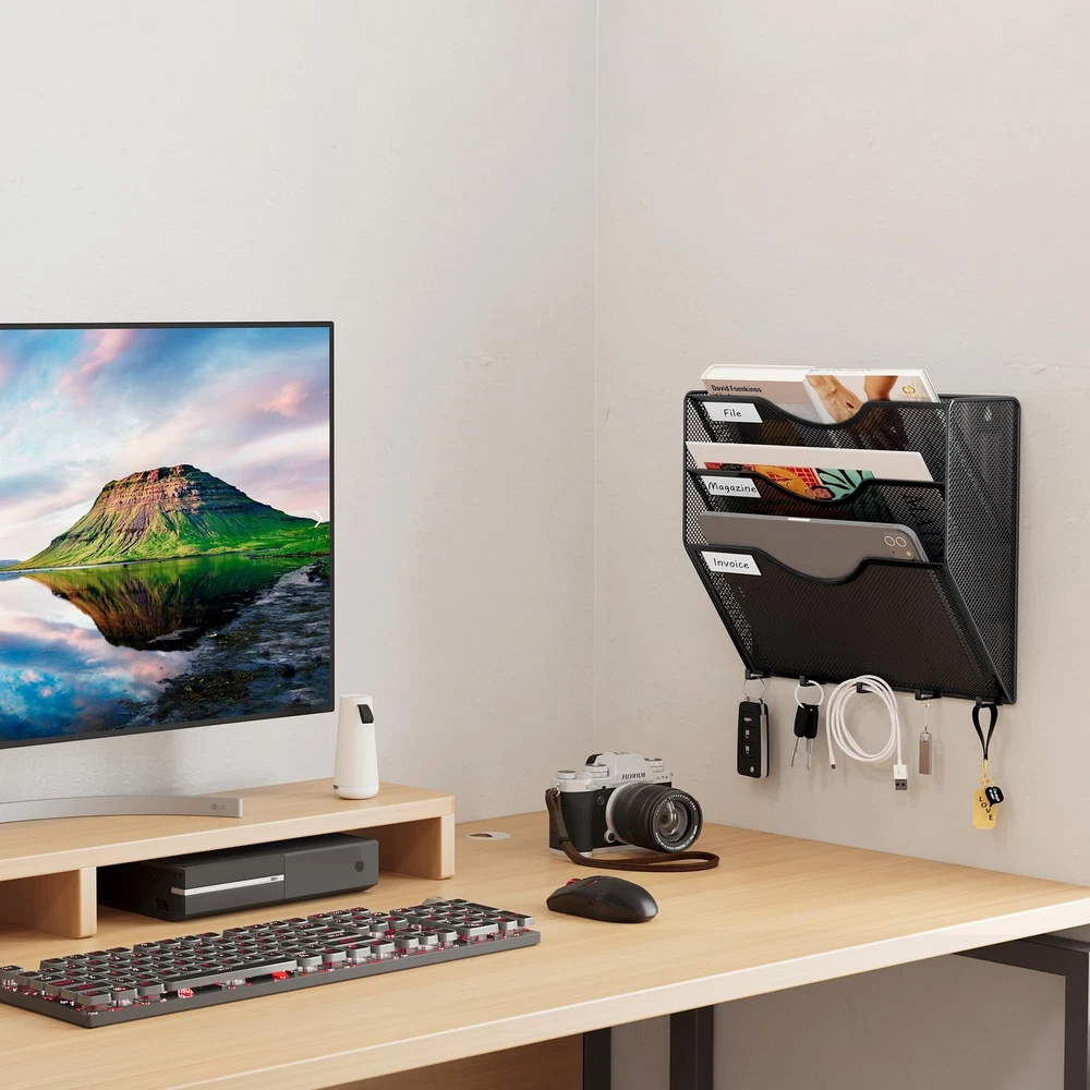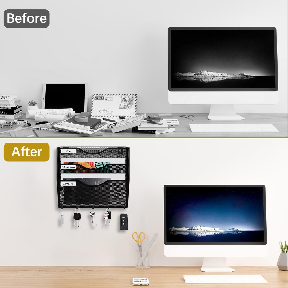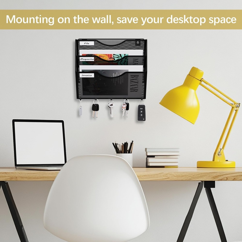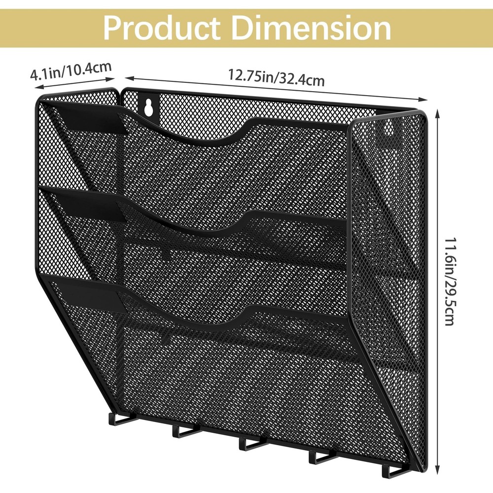 EasyPAG 3-Tier Mesh Wall File Organizer with 5 Key Hooks - Vertical Hanging Mail/Paper Rack, Metal Frame & Removable Labels for Office, Classroom, Entryway ,Black ✓ Free 60 Day Returns ✓ Free Express Shipping Description: Features: [Dual-Function Metal Organizer]: Metal mesh construction with 3 vertical pockets + 5 bottom key hooks. Powder-coated finish resists rust/scratches holds 300+ sheets per pocket while securely storing keys and other small accessories [Labeling System]: 3 deep pockets with label slots ( included white tabs) for instant category updates (bills/contracts/homework). Open mesh grids provide at-a-glance visibility, eliminating time wasted searching through stacked files. [Space-Saving Wall Solution]: Slim profile mounts flush to walls/doors, freeing desk space in cramped offices/dorms. Holds letter-size files (8.5x11"), notebooks, and magazines vertically perfect as a mail sorter near entryways or above desks. [Metal Mesh Durability]: Anti-rust powder-coated metal outperforms plastic organizers. Rounded safety edges prevent snagging. Includes drywall anchors and screws for secure mounting on all surfaces no bending or rust even with daily use. [Complete Clutter Control]: Archived design keeps documents accessible yet hidden. Ideal for organizing permission slips, client contracts, or household bills. Backed by 12-month warranty. Product Details: Color: Black Material: Metal Product Dimensions: 12.75"L x 4.1"W x 11.6"H Item Weight: 0.86 Kilograms Brand: EasyPAG Finish Type: Powder Coated Unit Count: 1.0 Count Capacity: 2 Cubic Inches Manufacturer: Baike Item Weight: 1.89 pounds Product Dimensions: 13.25 x 4 x 11.6 inches Item model number: 35810TFH-HK Material Type: Metal Number of Items: 1 Size: 3 Tier with Hooks Sheet Size: 8.5-x-11-inch Inches Manufacturer Part Number: 35810TFH-HK Date First Available: June 1, 2020
