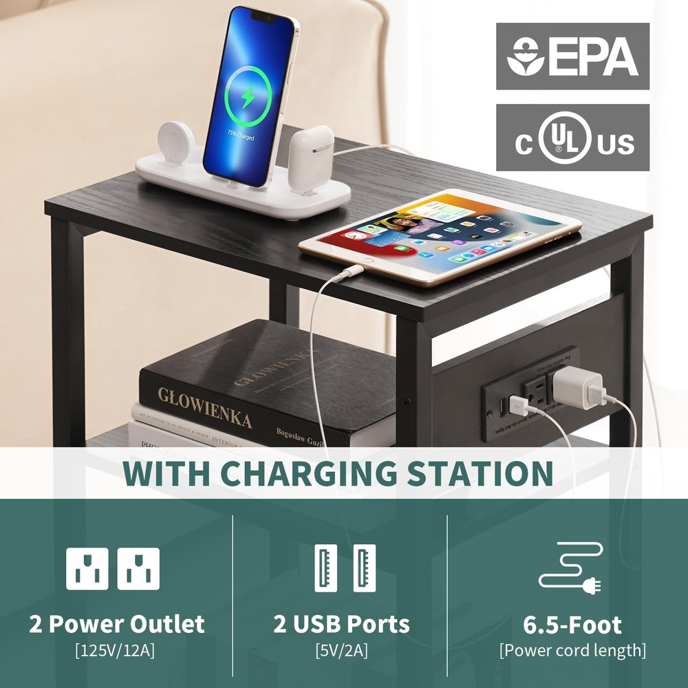 Experience unparalleled versatility with our bed side table. The tabletop and second shelf are large enough to hold a variety of record players and audio essentials. The black side table features U-shaped shelves on third shelf for easy access and sorting of vinyl records. In addition, the small bedside tables have been upgraded with side wire mesh to prevent accidental slips. The nightstand with charging station is a game changer. With 2 USB ports and 2 outlets, the night table effortlessly connects to your record player, speakers, or other devices without a mess of cables. No more struggling to find a power source. Plus, the small table stand is lightweight and easy to move around. The black end table is made of sturdy frame and wood planks for strong, long-lasting support: 100 lbs. for the hard top and 50 lbs. for the second/third shelf. Adjustable table legs level for added stability. Small side table for small spaces, the side table with storage features an airy/compact design that blends seamlessly into tight spaces. Unleash unrivaled versatility with our tall side table. Thanks to the removable U-shelf, the living room side tables offer even more possibilities for books, magazines, photo albums or cute trinkets. Not only is it a record rack with vinyl storage, but it can also be used as a living room end tables, end tables bedroom, office side table or decorative shelf to brighten up your decor. The tall end table comes with detailed instructions, labeled parts, assembly tools and corresponding assembly video for quick assembly. If you have any questions, please feel free to , our service team will answer the e-within 12 hours. The end table with storage has 12-month Quality Assurance! Always by Your Side. Overall Size:15.35"L × 11.81"W ×26.14"H. The 3rd Open Shelf Size: 11.22"W×14.17"H, designed for all kinds of vinyl(7/8/10/12 inch). THREE TIER END TABLES: Elevate your audio journey with the 3 tier record player stand with vinyl storage. The tabletop and 2nd shelf are ample to hold various record players and audio essentials. And the 3rd open shelf features U shape rack for easy access and sorting of vinyl records. Plus, the bedside table is upgraded with side wire mesh to avoid vinyl accident slips. END TABLE WITH CHARGING STATION: The charging nightstands are game-changers. With 2 USB ports and 2 outlets, the small side table can effortlessly connect your record player, speakers, stereo, or other devices without cables chaos. No more struggling with power supply searching. Moreover, it is lightweight to move with ease. VERSATILE SIDE TABLES: Experience unrivaled versatility with our small nightstand. Thanks to the removable U shape rack, it unlocks more storage possibilities for books, magazines, albums or cute trinkets. More than a small table, it also serves as bedroom night stands, side tables living room, small office table or decorative stand to brighten your decor. STURDY & SPACE SAVING: Crafted from sturdy frame and wood board, the side tables bedroom boasts stalwart & lasting support: 100lbs for hard top and 50lbs for 2nd/3rd shelf. Adjustable feet can level to add extra stability. With airy/compact design, the end tables living room seamlessly blends into small space. Let the music flow freely without space constraints!