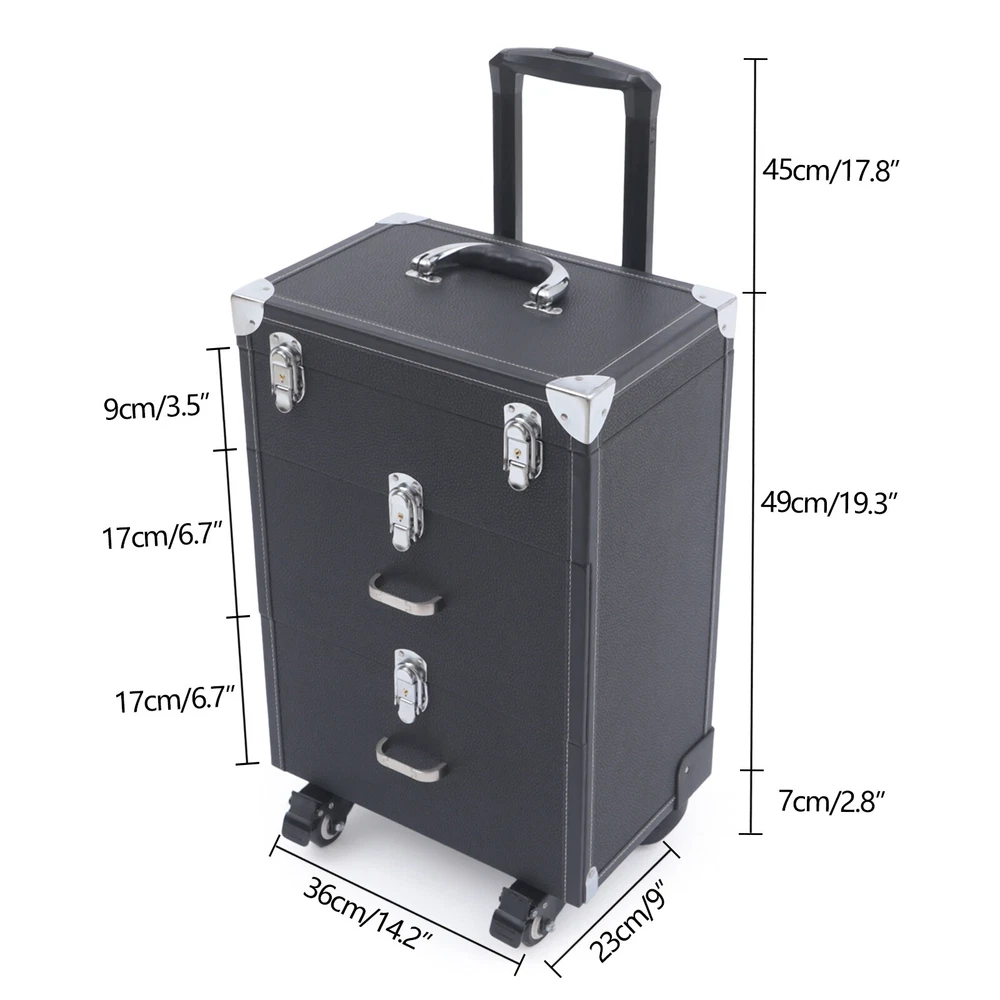 3-Tier Rolling Makeup Train Case Nail Polish Storage Box Organizer Cosmetics BOX 3-Tier Rolling Makeup Train Case Nail Polish Storage Box Organizer Cosmetics BOX Description This is a cosmetics rolling organizer with a large capacity. You can use it to store all your cosmetics. This organizer is made of high-quality PU material. It is very durable. Besides, it has a delicate and beautiful appearance. Furthermore, the wheel design makes it very easy to carry and transport. It is a good choice. Specification Color: Black Body Material: PU Latch Material: Zinc Alloy Wrapped Corners Material: Zinc Alloy Number of Layers: 3 Shape: Rectangular Telescopic Rod Length (Max.): 45cm/17.8inch Case Size: 36 * 23 * 49cm/14.2*9*19.3inch Wheel Height: 7cm/2.8inch Lid Height: 5cm/2inch Upper Layer Size: 36*23*9cm/14.2*9*3.5inch Middle Layer Size: 36*23*17cm/14.2*9*6.7inch Bottom Layer Size: 36*23*17cm/14.2*9*6.7inch Upper Layer Inside Size: 33.5*22*8cm/13.2*8.7*3inch Each Upper Compartment Size: 3.5*3.5*4.5cm/1.4*1.4*1.8inch Diagonal Length of Upper Layer: 40cm/15.7inch Middle Layer Inside Size: 30*19.5*13.5cm/11.8*7.7*5.3inch Diagonal Length of Middle Layer: 38cm/15inch Each Bottom Layer Compartment Size: 14.5*19*13.5cm/5.7*7.5*5.3inch Diagonal Length of Each Bottom Compartment: 22cm/8.7inch Gross Weight: 10kg/22lbs Package Size: 63*32*41cm/24.8*12.6*16.1inch Package Included 1* Cosmetics Rolling Organizer 2* Keys Warranty 5 Years 1.Feature *: Unique Appearance,Great Durability Highlights Compact Design,Unique Appearance,high reliability Color Black Material PU Brand Unbranded ISBN Does not apply Features Rolling Type Case MPN Does not apply Manufacturer Warranty 1 Year Maximum Length of Telescopic Rod 45cm/17.8'' Number of Layers 3 Shape Cuboid Wheel Height 7cm/2.8'' Lid Height 5cm/2inch Gross Weight 10kg/22lbs On Feb 5, 2025 at 21:48:55 PST, seller added the following information: