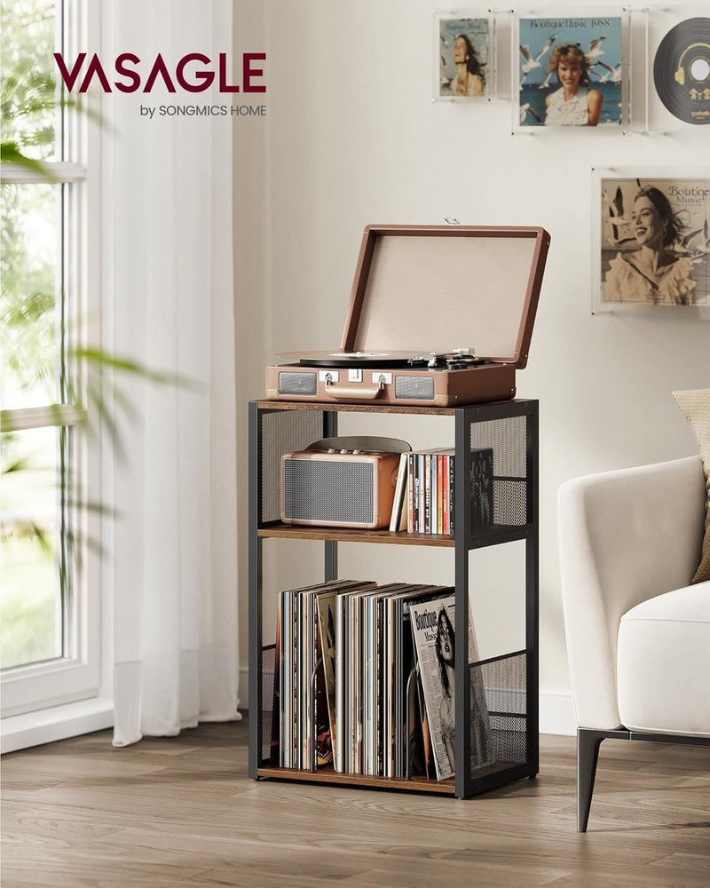 【3-TIER DESIGN】This bedside table features a tabletop for your record player and 2 open shelves that can hold up to 100 albums. Enjoy a tidy and organized music area 【EASY ASSEMBLY】This record player stand comes with detailed instructions and labeled parts, making it a breeze to assemble in just 6 simple steps 【VERSATILE USE】This turntable stand doubles as a side table, making it a versatile addition to your living room, bedroom, or study. Enjoy your afternoon tea or store daily essentials with ease 【STURDY AND STYLISH】Crafted from robust particleboard and steel, this couch table is built to last. The combination of rustic brown and black colors creates an industrial look, adding a touch of vintage charm to your decor 【THOUGHTFUL DETAILS】The dense mesh prevents items from falling off, while the removable U-shaped dividers at the bottom allow you to customize your storage space to fit your needs