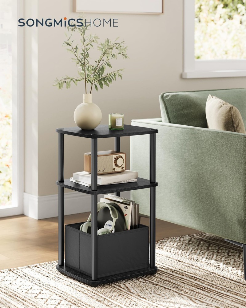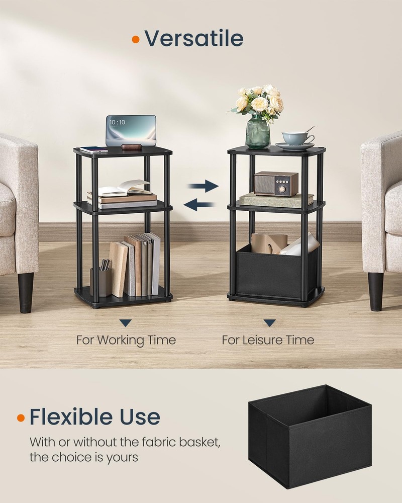 【SUPERFAST TOOLLESS ASSEMBLY】Set up this end table in just about 5 minutes—no tools required. By connecting the tubes with double-ended screws, you can quickly set up all the tiers. It's as easy as building blocks! 【AMPLE STORAGE】Boasting 3 shelves and an additional fabric basket, this side table offers ample storage space—an ideal storage solution for your odds and ends! 【SPACE-SAVING SOLUTION】Designed for narrow spaces, this 11.8"D x 13.4"W x 22.8"H nightstand is a practical storage solution for vases, lamps, cups, books, and other items in compact living rooms or bedrooms 【ROBUST AND LONG-LASTING】Sturdily crafted from premium particleboard and robust 0.7" dia. steel tubes, this bedside table is durable enough to withstand the test of time 【MODERN CHARM】Featuring clean lines, rectangular shelves, and a minimalist design, this ebony black side table exudes a modern charm that complements various decors