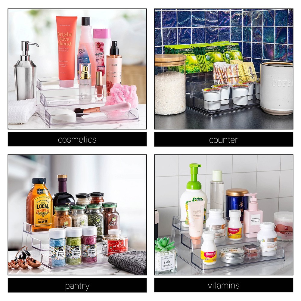 Keep yourself organized with this spice storage rack from . This three-tiered rack increases visibility allows for easy access to your items. The rack has deep shelves to catch spills and prevent them from spreading in your drawers, cabinets, and countertops. Use this versatile organization rack throughout your home- in your kitchen cabinets and counters to store spices, your desk to keep office supplies organized, your bathroom to organize makeup and toiletries, or a kids’ playroom to organize arts and craft supplies. It is made of high quality plastic making it durable to withstand every day use and is easy to clean and wipe down. Combine this storage rack with other storage items to completely reorganize your home. GET ORGANIZED: Are you looking for a way to declutter your kitchen, bathroom, office or bedroom while upgrading your pantry and cabinets? With this spice rack from you'll find the great solution. SET INCLUDES: This rack has three tiers to increase visibility and easy access to the items on your kitchen counter or cabinets. Deep shelves helps to prevent spills from spreading. Dimensions are: 10.5" x 9.5" x 4.25" FUNCTIONAL & VERSATILE: Use this organizer in many different rooms throughout your home. Use them in your kitchen to store spices. They can be used in your desk to keep office supplies organized, your bathroom to organize makeup and toiletries, or a kids’ playroom to organize arts and craft supplies. HIGH QUALITY: The storage rack are made of a high-quality plastic making them durable for every day use, but also easy to clean and wipe down. CUSTOMER SATISFACTION GUARANTEE: At , our #1 goal is customer satisfaction, please feel free to reach out to us so we can ensure that your order experience is positive and hassle free.