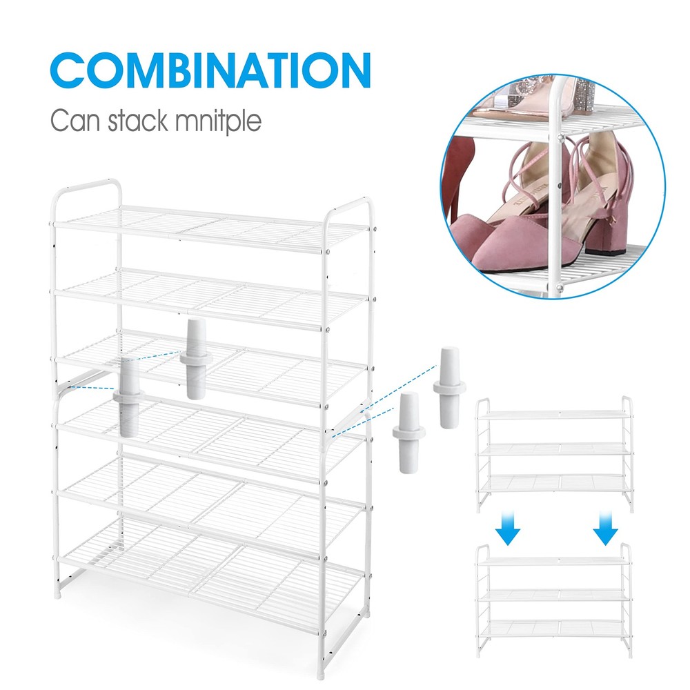 What does this DIY shoe rack have to offer? Stackable and Expandable: This 3-tier shoe rack provides shelves for keeping flats, boots, high heels, kids’ shoes. Two sets can be stacked or placed side by side to create a large capacity shoe rack and fit your space. Versatile Storage Shelf: You can place this rack anywhere you want, such as in the entryway, closet, garage, or living room; also great as a storage shelf for dry food, books, games, toys, craft supplies, etc. Will you find any more possible uses? Just find out yourself with this versatile utility rack. Specifications: Color: White Material: Metal Product Size: 26.8" * 11.4" * 19.5" Weight: 5.5lbs Max. Load Capacity of Each Shelf: 22 lb Package Contents: 1x 3 Tiers Shoe Rack 1 x Assembly Manual 1 x Allen Key 4 x Metal Connectors ( for stacking ) 【3-TIER SHOE RACK】This shelves fit boots, high heels or slippers and hold 9-12 pairs of shoes. 【Multifunctional】In the kitchen, set the kitchenware and cutlery. In the living room, the shelves can hold sundries.Put it in the closet and keep the clothes neat. Make the utility room looks cleaner. 【STACKABLE AND EXPANDABLE FOR DIY】2 sets can be stacked vertically to get a complete 6-tier shoe rack or bridged horizontally to expand the unit. 【DURABILITY】 Made of thickened metal tube with power coated finish which is smooth and with strong corrosion resistance. 【EASY ASSEMBLY】 Simple structure design makes it very easy to assemble. USPTO: 00939253