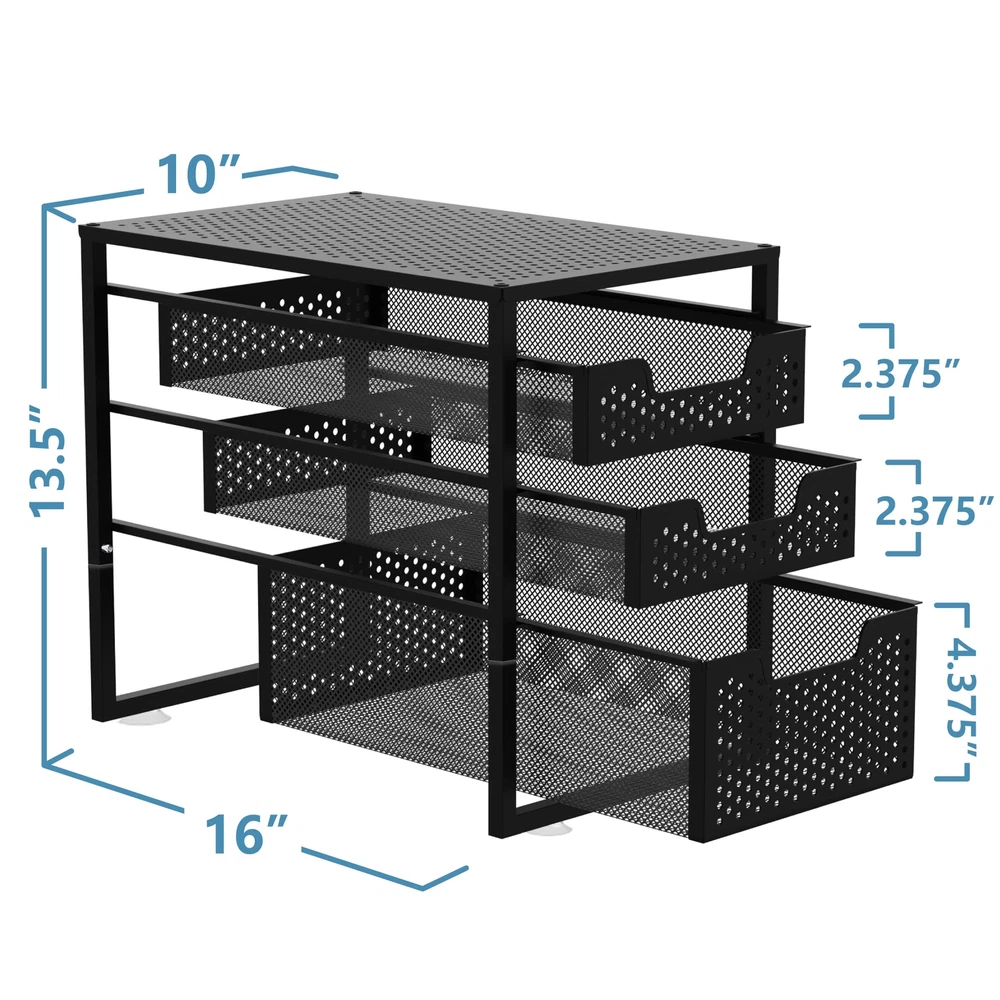 【Space-Saving Organizer】Keep supplies and essentials neatly stored and easily visualize and access storage. Great for organize increase extra storage space in your kitchen Bathroom office 【Stackable Design】Include EVA foam stickers and stacked firmly without scratching the top surface. Stack up to multiple units that maximizes storage space in the same footprint 【Stability Construction】Easy to assemble; Made of sturdy durable metal construction with bronze coating; PET anti-slip pads to prevent it from sliding or scratching surfaces 【Dimension】W10'' x D16'' x H13.5'' ; Drawer Height: Small: 2.375'' (3.15'' to the top), Large:4.375''(5.15'' to the bottom of small drawer); Drawer Width: 8'' USPTO Patent Pending