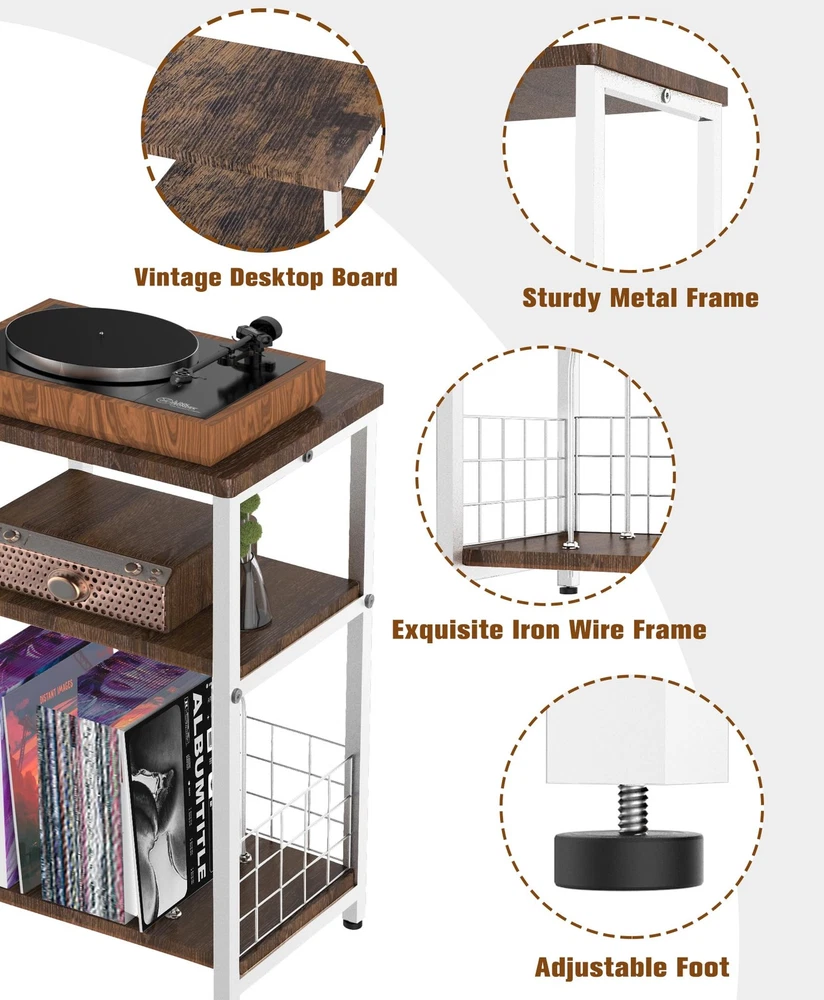 3-tier record player stand features vinyl record storage, which can be used to your turntable, speakers, albums, CDs, books, magazines, collectibles, etc. The large storage space can fulfill all your diverse needs. It's an excellent gift for those who love vinyl records! On the wooden phonograph stand, it allows you to separate the items on each tier, making it more convenient to access them. The modern and minimalistic style matches home decor, making it an ideal choice for a turntable stand, vinyl record storage cabinet, bedside table, or coffee table in living rooms, bedrooms, and offices. Specification: Material: Durable Metal + Wood Product Size: 11.8’’ D x 15.8’’ W x 26.2’’ H Product Weight: 14.8 lbs Max Load Capacity:75 lbs CD Storage Quantity: Hold up to 100 albums Package Contents: 1 x Record Player Table 1 x Screw Package 1 x User's Manual Warm Tips: Children are not allowed to climb on or play with the product! Don't sit on the table! If you find the table a little wobbly after assembly, please adjust the foot pads to improve stability. Multi-Functionality: This record player table boasts an expansive range of applications due to its multifunctional design. Measuring 11.8’’ D x 15.8’’ W x 26.2’’ H, it serves as an efficient record storage table that seamlessly organizes all your vinyl records, albums, and CDs. Not only can it function as a vinyl record display table or a record player cabinet, but it also doubles as a turntable stand, nightstand, or end table - perfect for any living room or bedroom setting. 3 Layer Record Player Stand: Besides being a stand for your turntable, the table helps keep your precious vinyl records well-organized. The second and third tier can easily up to 100 albums in total. The designated compartments or shelves allow for convenient categorization based on genres, artists, or release years. This feature ensures easy access to your records and enables you to maintain an orderly collection. High-Quality Material: The table is crafted from high-quality wooden and metal to ensure durability and longevity. The robust construction can withstand max load weight 75 lbs of turntables and substantial record collections. This end table comes with 4 adjustable foot pads which can be easily adjusted to fit the height of your needed. Additionally, the foot pads can protect your floors from scratches and scuffs. Irrespective of the frequency of use, it promises to stay stable and stylish. Aesthetic Appearance & Practical: This record player table is a visual masterpiece that blends into any interior setting. With its vintage design and modern accents, it enhances the aesthetic appeal of your room, while complementing modern décor trends seamlessly. The second layer has an open design, which is convenient for access. It can snacks, books, or other items within reach. The third layer Iron wire frame and U-shaped wire can protect your vinyl records from falling or slipping. Easy Assembly: The record player table prioritizes the user's convenience with easy assembly instructions. All necessary tools are included, allowing even those with minimal DIY skills to set it up effortlessly. By opting for this table, music lovers who prefer a quick and hassle-free setup can start enjoying their favorite tunes without a long, complicated assembly process.