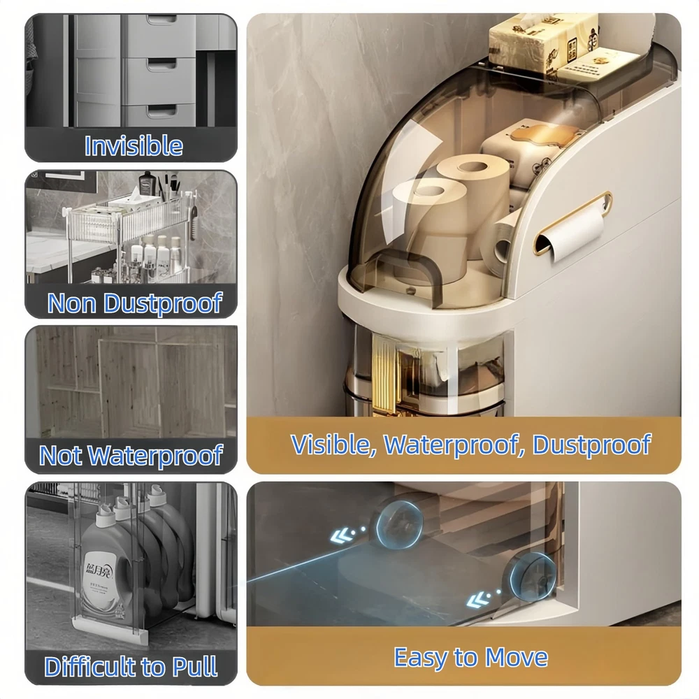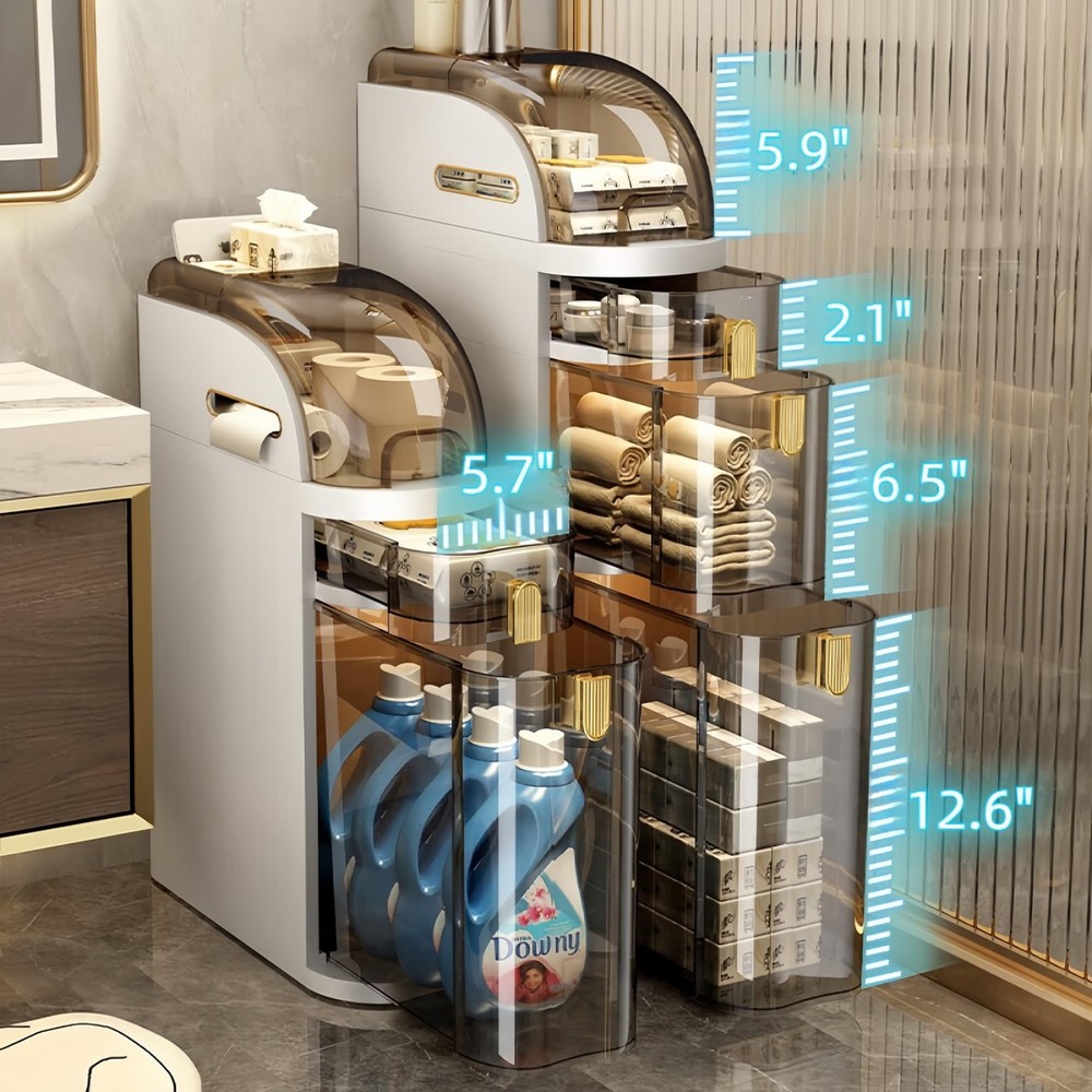 Excellent Design: Stylish appearance makes your small space more elegant. Rounded edges and corners can avoid injuries caused by bumps; Smooth surface is conducive to cleaning and the transparent drawers allow you to easily know the location of objects makes them easier to take.Mute pulleys make it easy to move while also protecting the floor from scratches Large Capacity & Multi-Purpose: This freestanding cabinet has an amazing capacity, and multiple drawers of different sizes are enough for you to store any daily necessities; The elegant appearance can suit any style of room, you can use as bathroom cabinets, kitchen storage cabinets, and living room side cabinets to easily organize messy items Sturdy & Waterproof: This narrow bathroom storage cabinet is made of high-quality ABS materials with a sturdy structure and high load-bearing capacity, and will not tilt or deform when carrying heavy objects; Waterproof and dustproof, no need to worry about items getting wet, suitable for bathrooms, kitchens, bedrooms, etc No Installation Required & Space Saving: Out of the box, without installation, making your use more convenient and fast; This slim bathroom organizer has a small cross-section and doesn't take up much floor space, maximizing storage space and making it easy to keep your belongings organized and your living space clutter-free Ideal Solution for Small Space Storage: Compared with wooden storage cabinets, this crevice storage cabinet is more suitable for small space storage; The compact design is perfect for corners and narrow spaces; Visual and divided storage makes items more organized and easy to access; Out of the box and movable, which is very friendly to women and the elderly